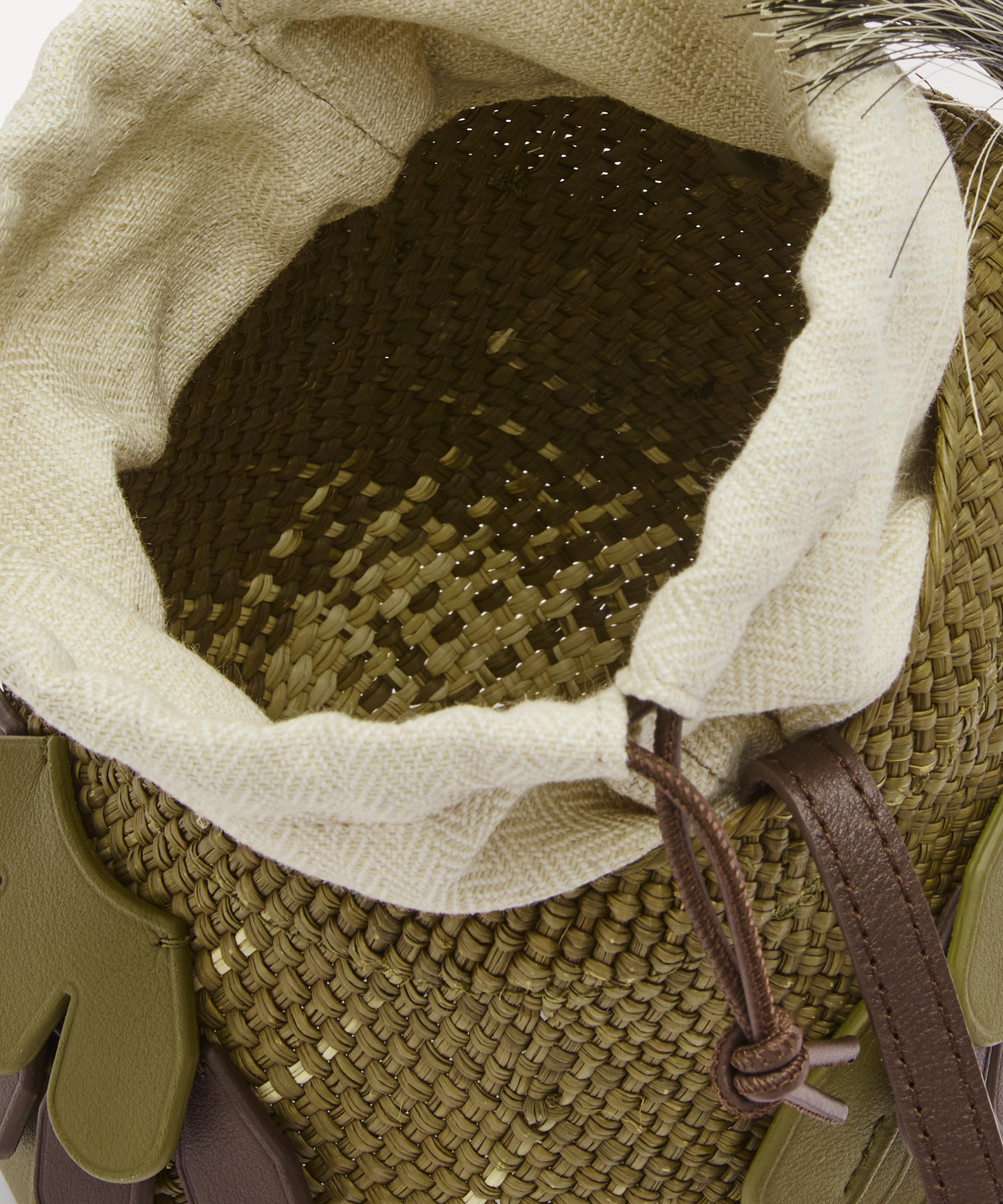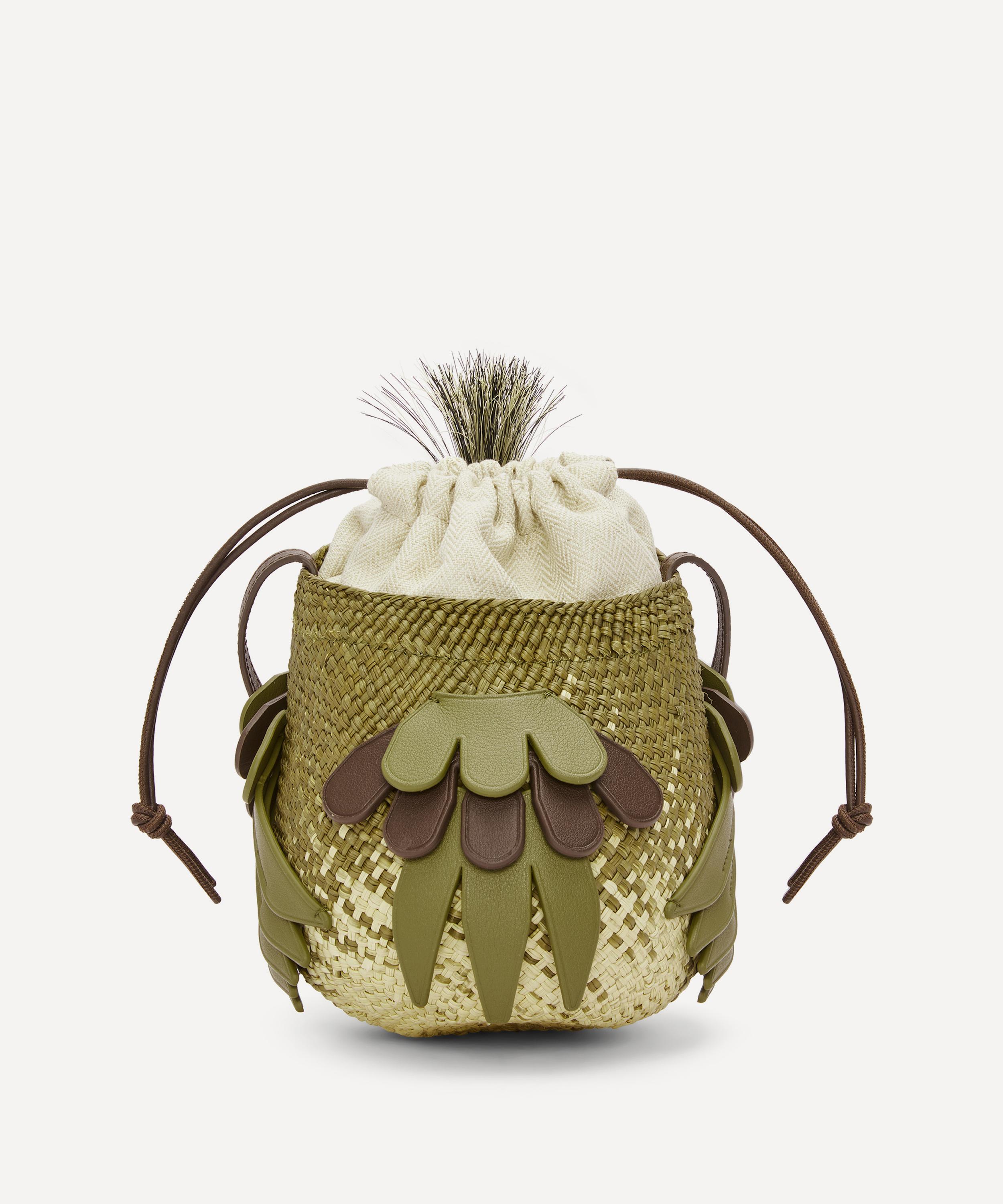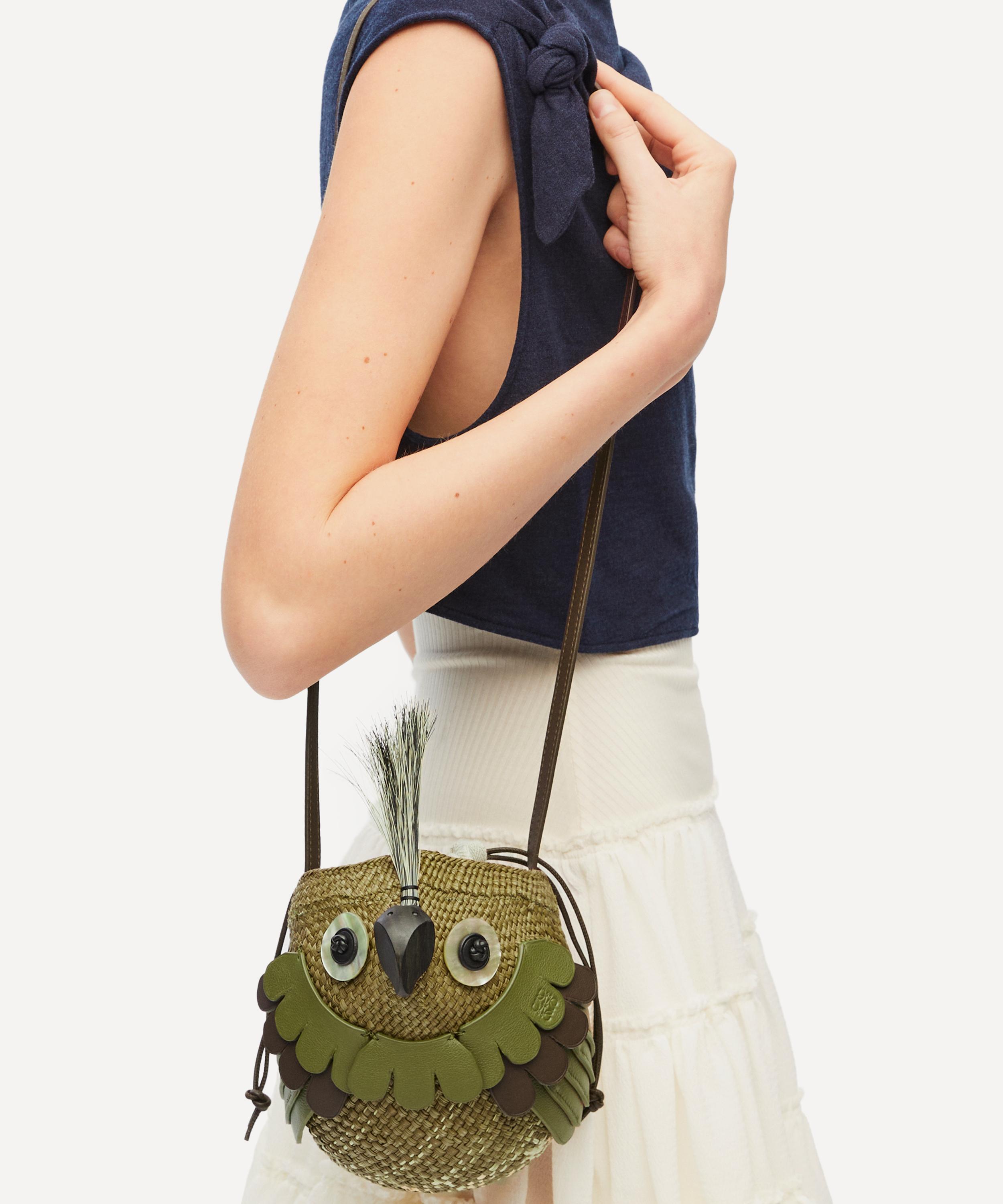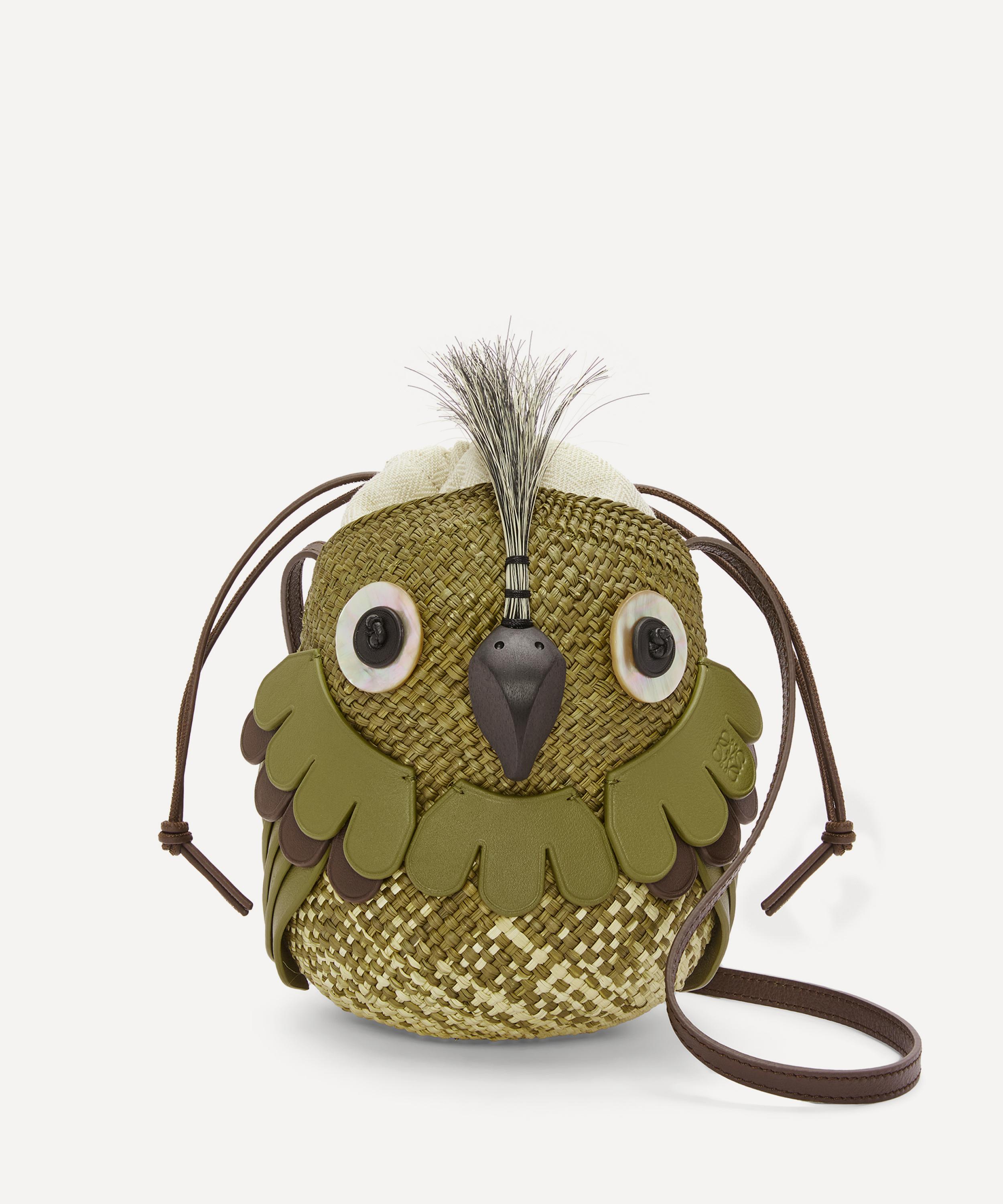 Handwoven in Spain from iraca palm in an elegant olive green and natural degradé effect, this playful cross-body bag takes the shape of a bird, complete with calf leather detailing, a carved wood beak and mother-of-pearl eyes.