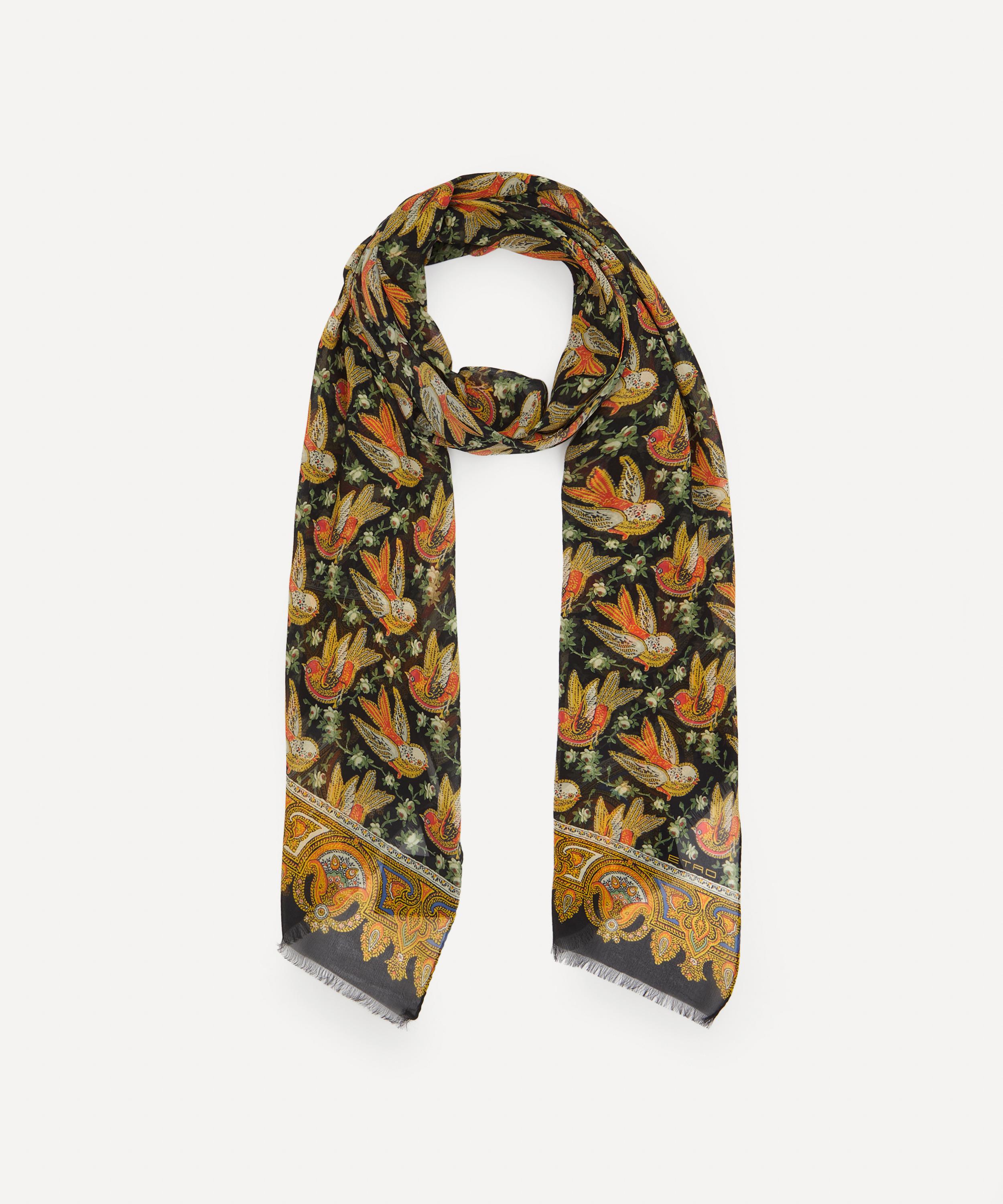 Expertly crafted in Italy from a soft silk georgette, this scarf is brimming with artistic appeal, featuring an all-over bird pattern, bordered with the brand's signature paisley print and complete with neatly fringed edges.