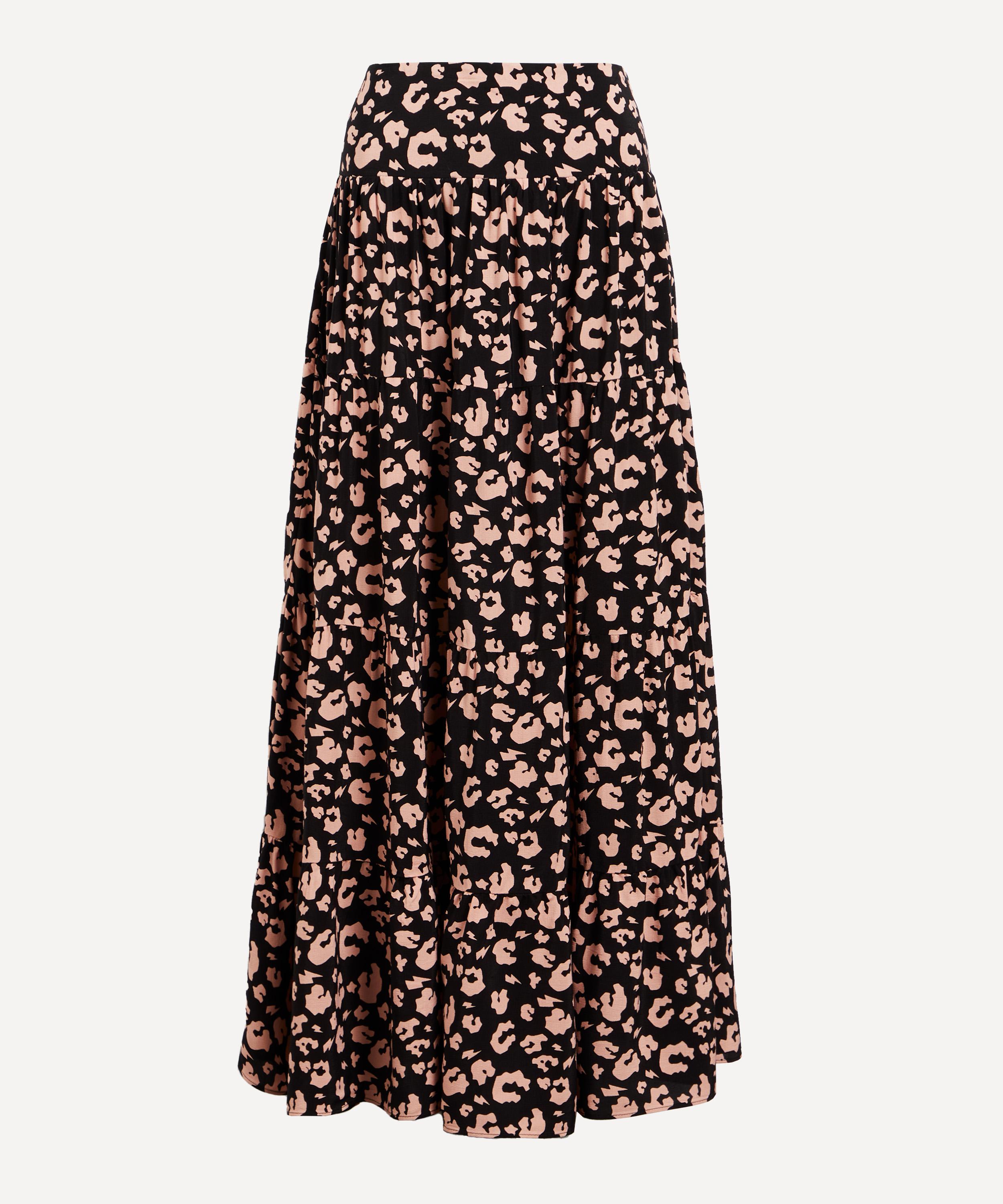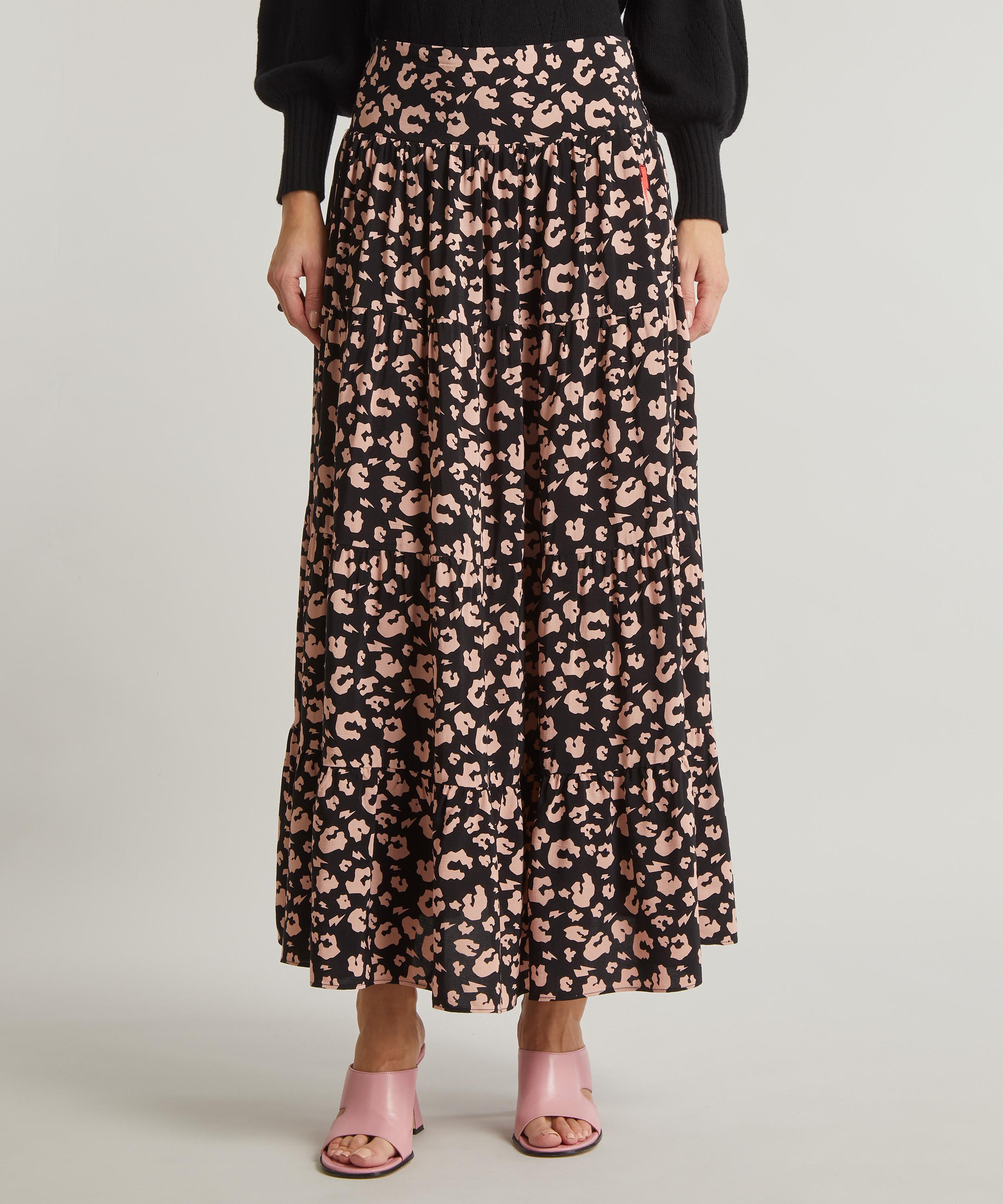 The Black and Pale Pink Leopard print maxi-skirt from Scamp & Dude brings bold colour and classic elegance to your eveningwear edit. Crafted from viscose-crepe for a light and loose fit featuring a tiered-effect construction with a stretchy shirred back panel and nifty side-pockets, it’s elevated by its bold black and peach leopard and lightning bolt print.