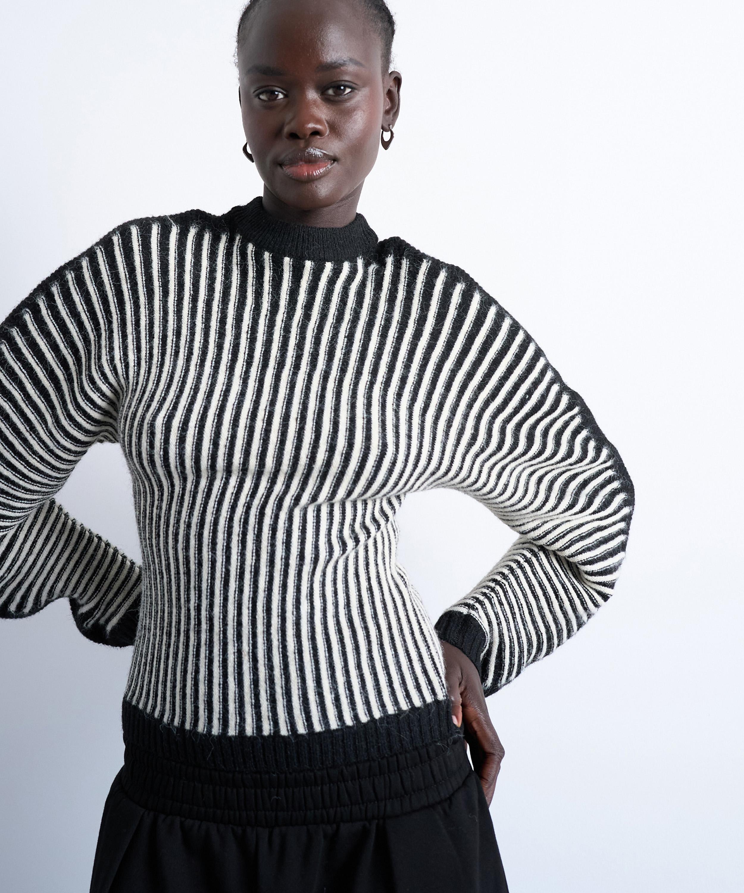 Featuring a high neckline and voluminous cocoon sleeves, this knitted jumper is elevated by a bold monochrome stripe pattern for a striking, modern finish.