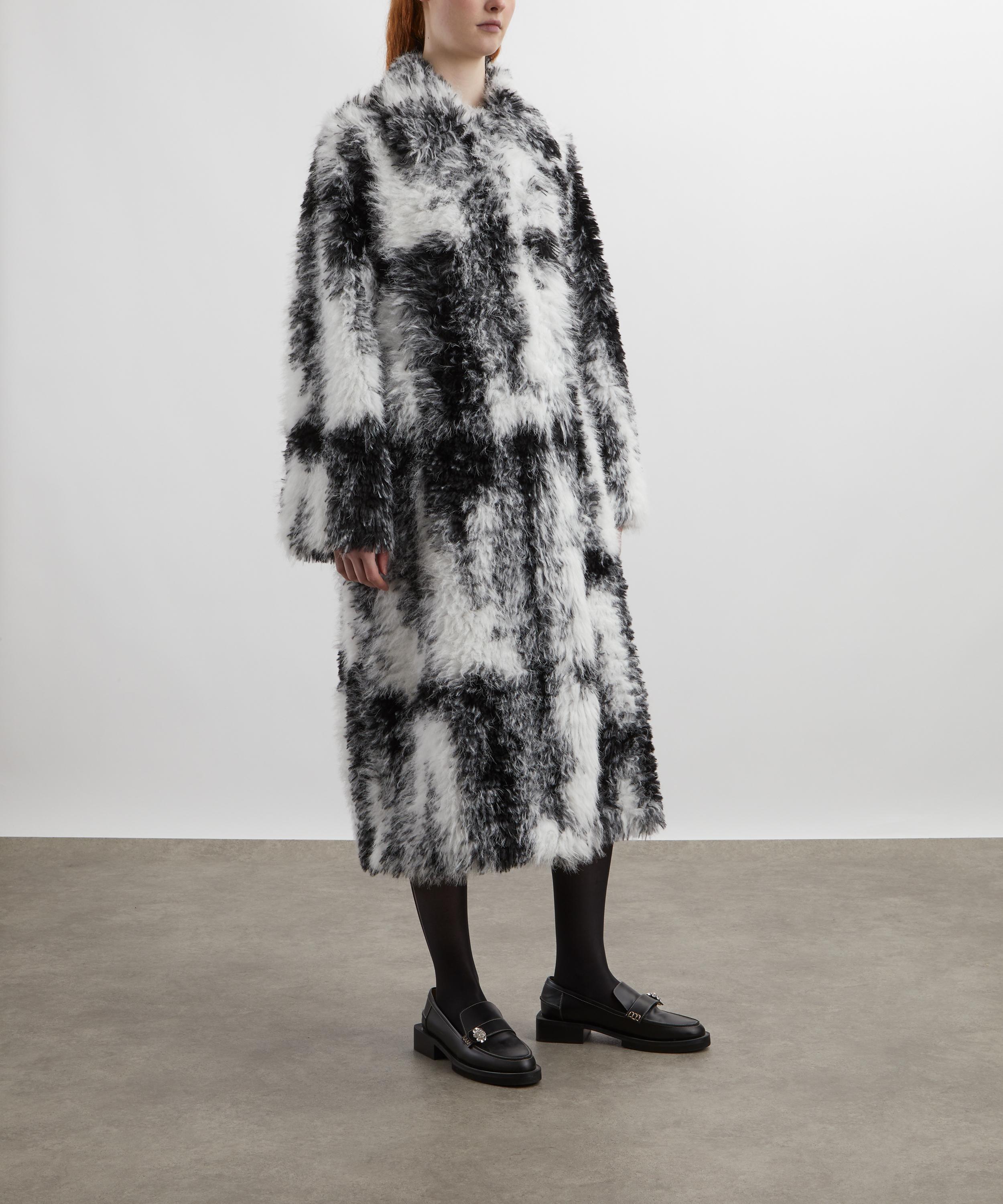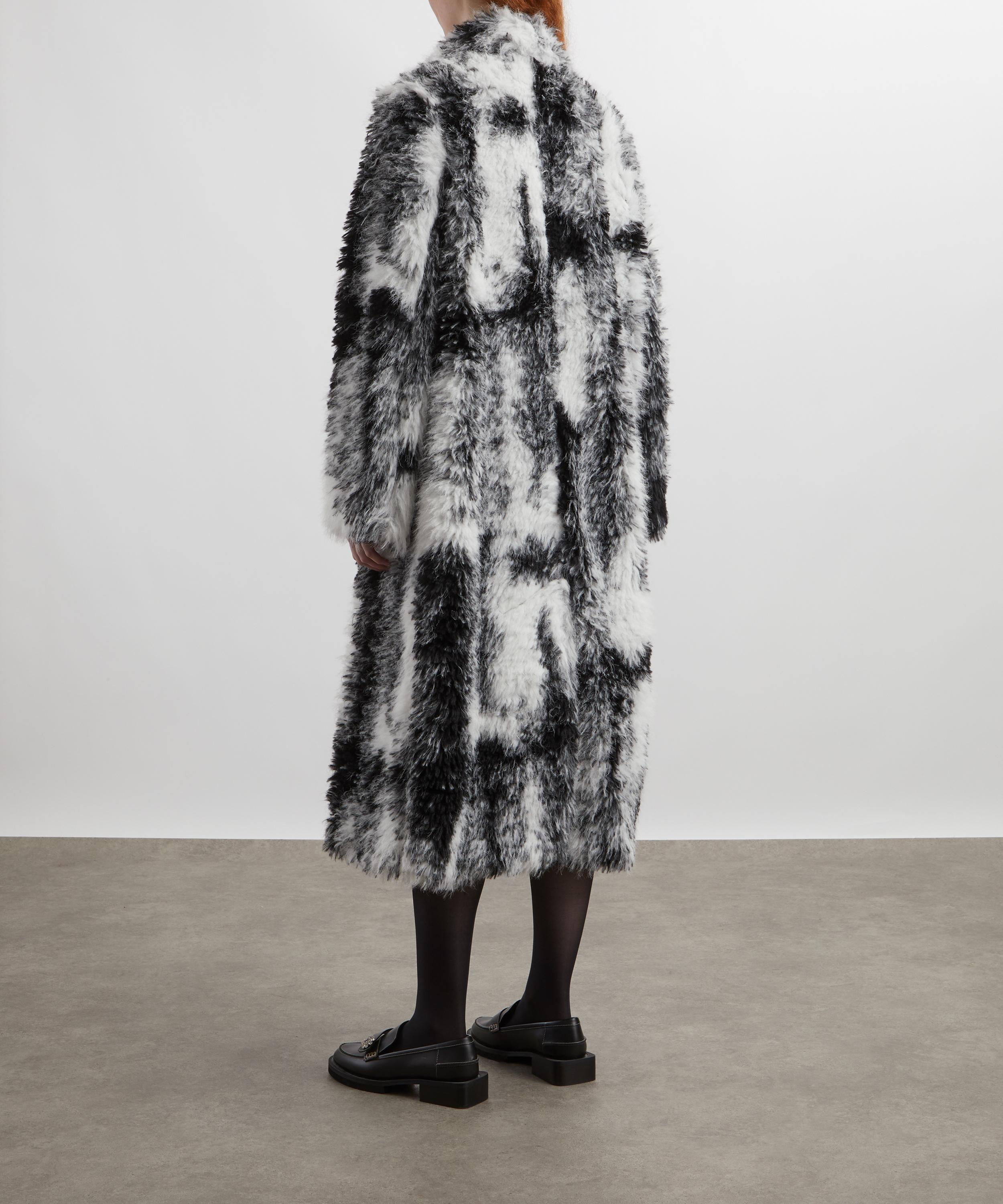 Crafted from super-soft faux fur with an abstract two-tone pattern, this cosy long-line coat is poised to keep you warm on colder days, complete with a wrap-over front buttoned closure, two side pockets and a collared neckline.