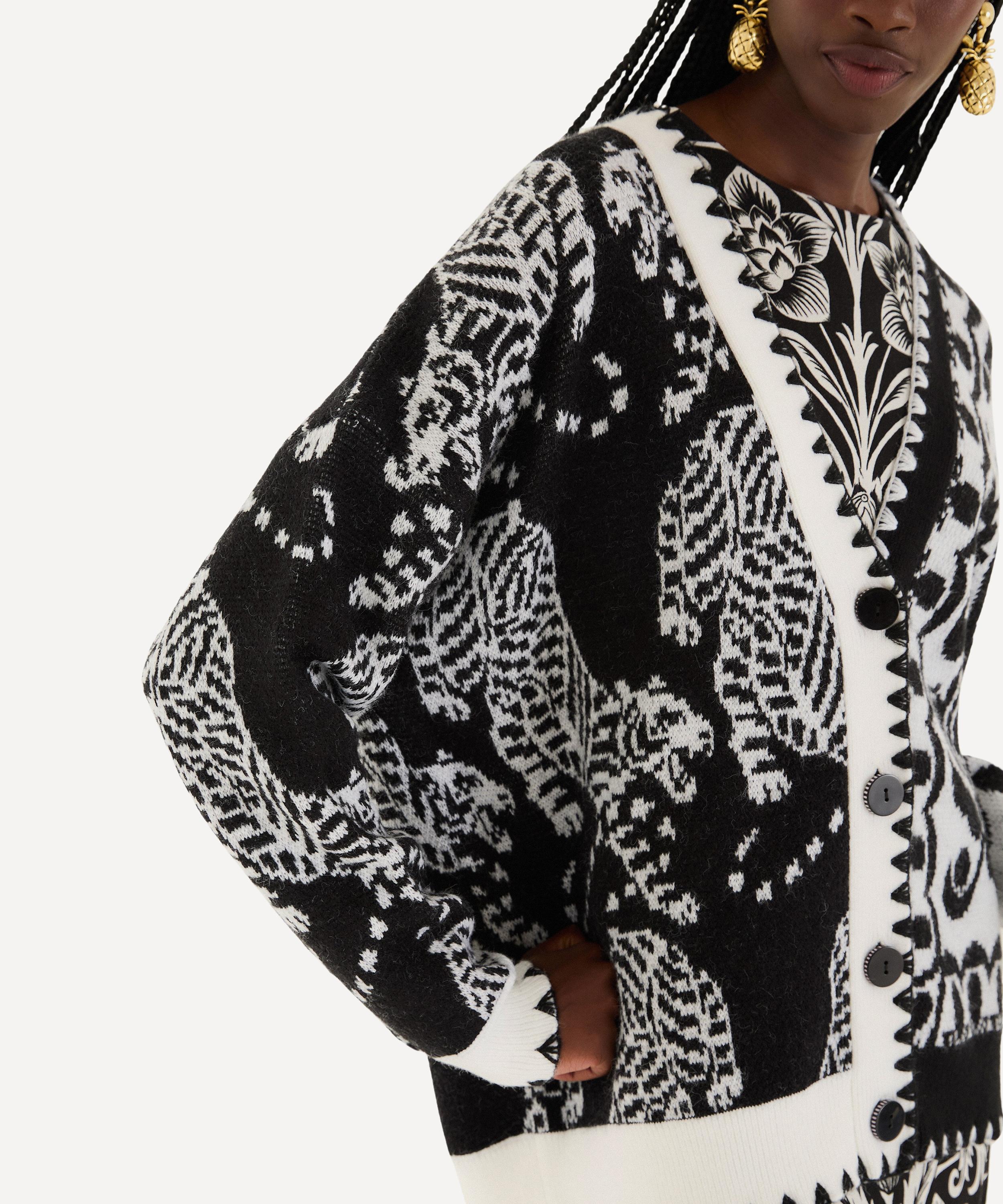 Embrace bold contrasts with FARM Rio's Black & White Mixed Striped Tigers Buttoned Knit Cardigan. A playful patchwork of tiger motifs and abstract patterns brings striking visual rhythm, while the cozy knit and scalloped V-neckline offer warmth with artistic flair - a spirited twist on everyday style.