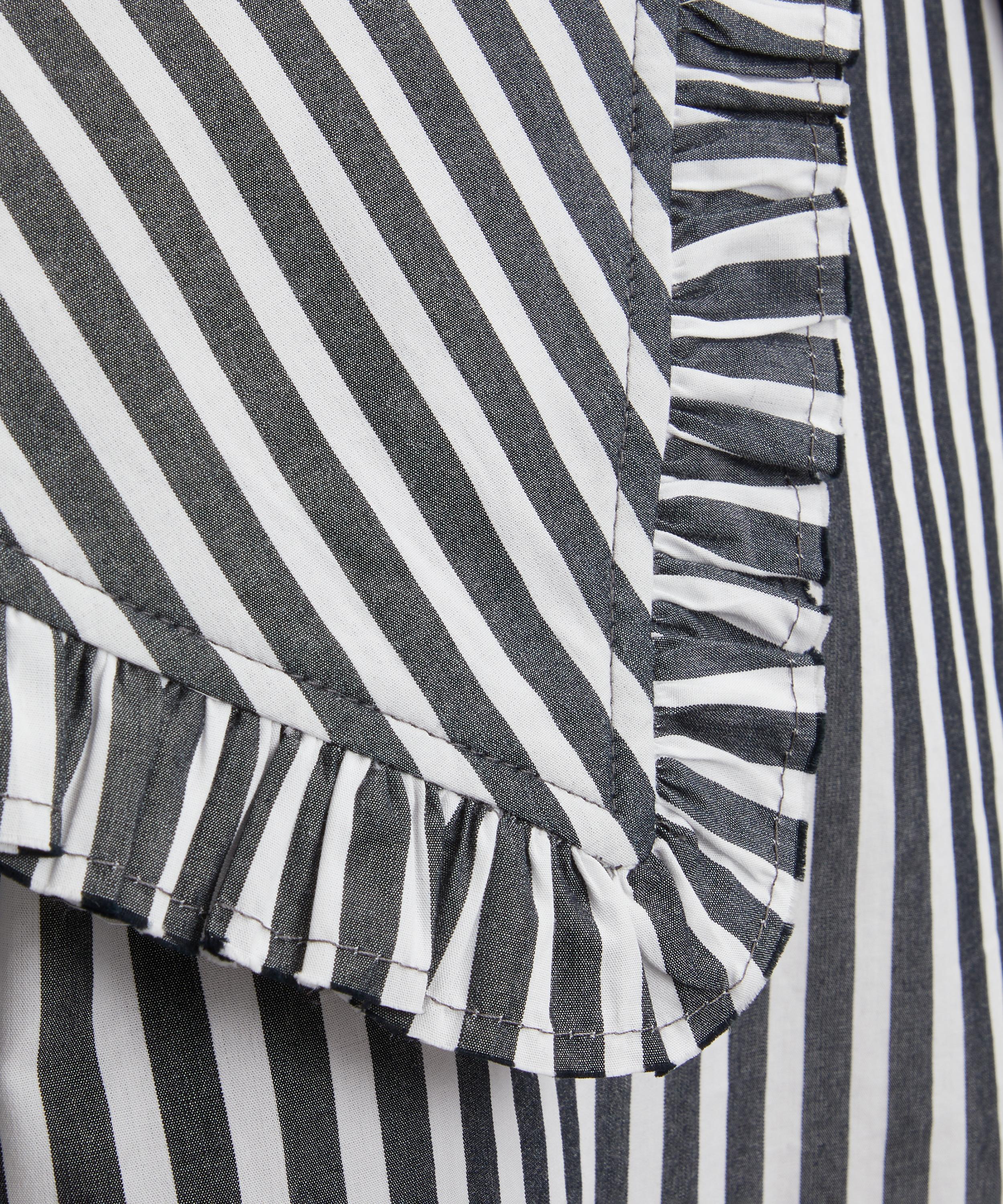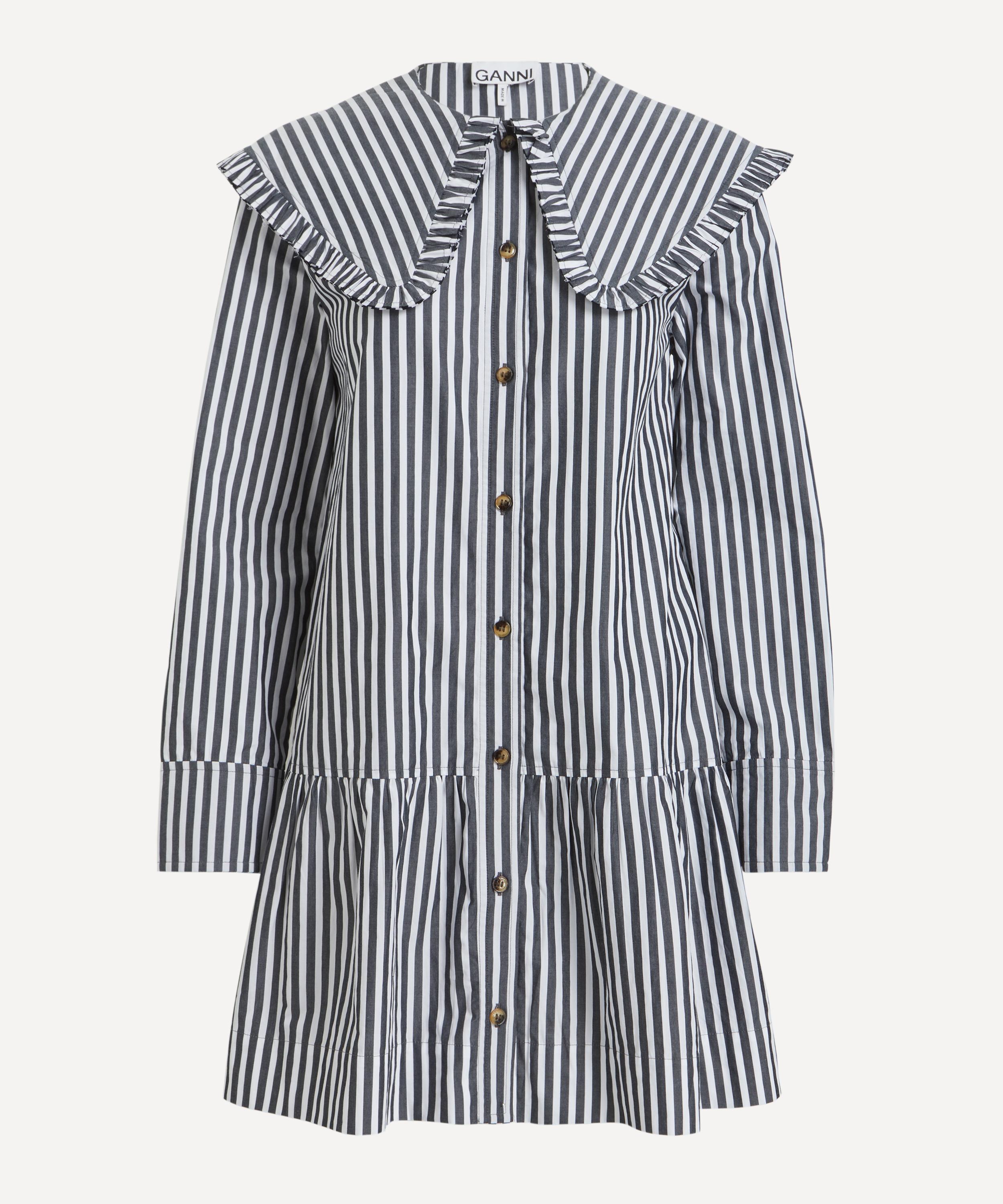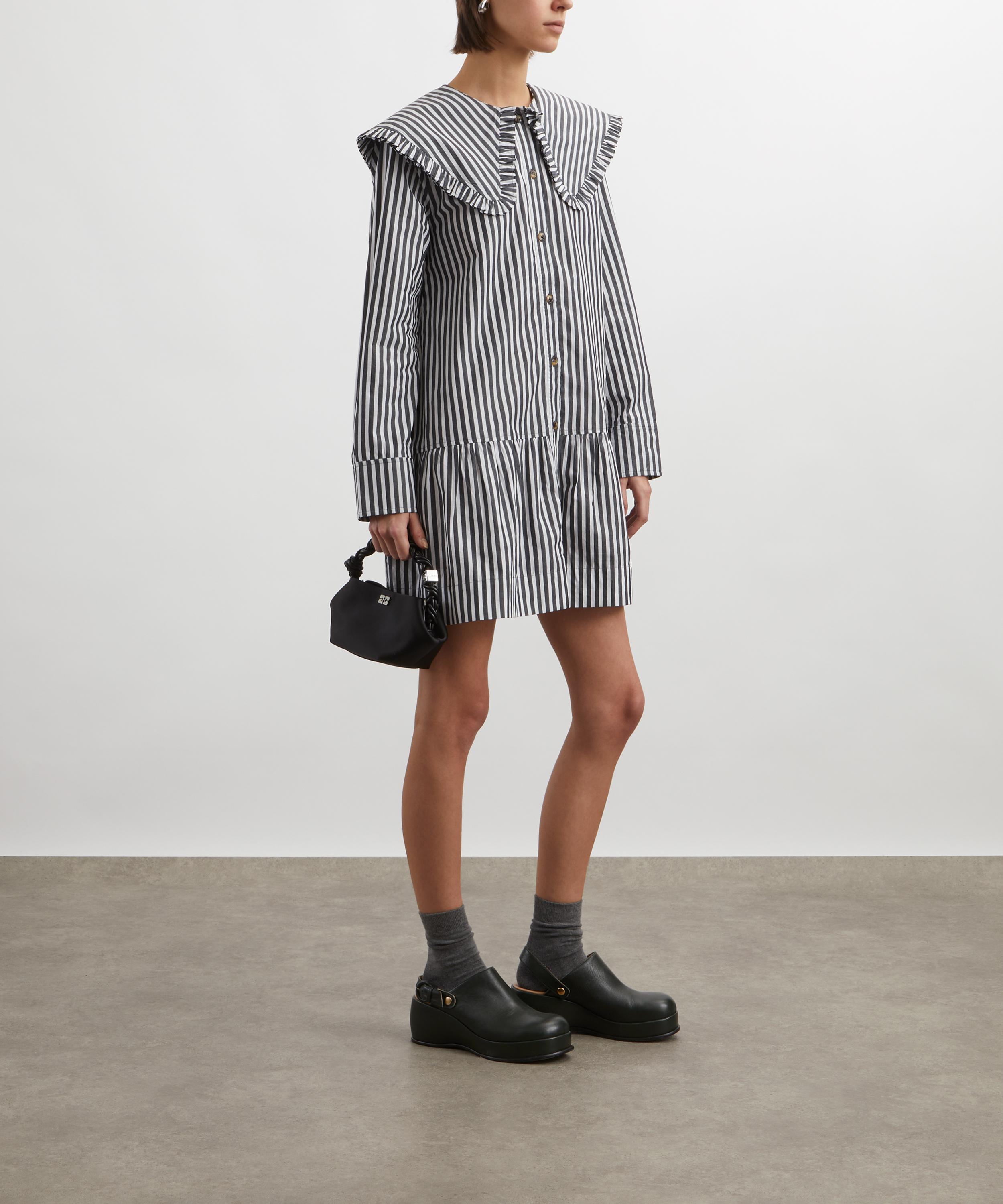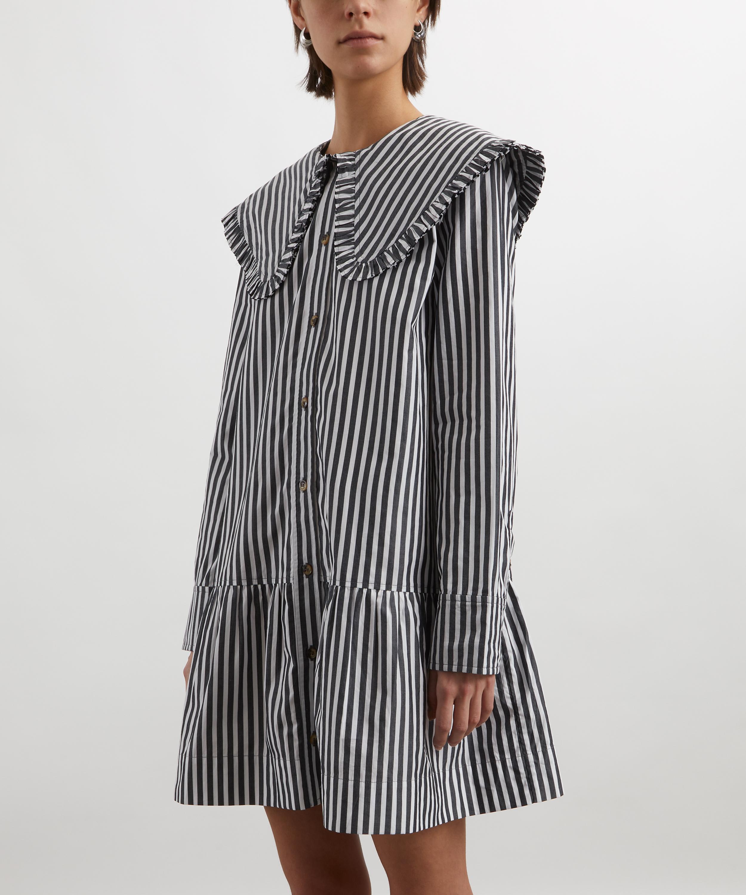 Crafted from crisp cotton with a classic black and white stripe, this dainty mini shirt dress features a ruffled oversized collar, adding a delicate, feminine touch. Designed for a relaxed fit with long sleeves and buttoned cuffs, the drop waist gently flares into a breezy, gathered skirt for a playful finish.