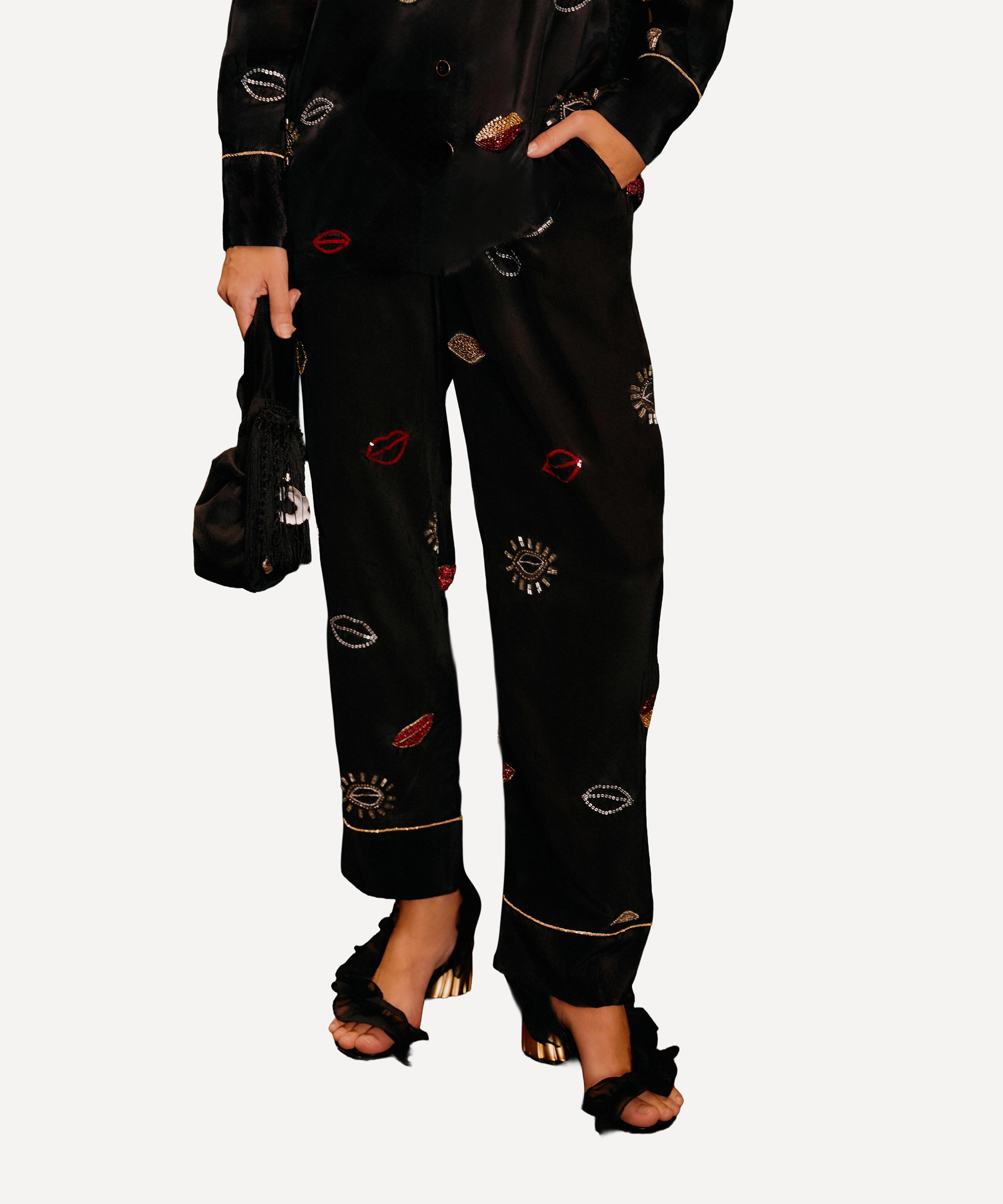 Step into comfort and elegance with these pyjama-inspired trousers, featuring delicate embroidered lips for a playful twist. Designed with a relaxed silhouette and elastic waistband, they flow effortlessly - while gold piping add a hint of refined charm to your lounge look.
