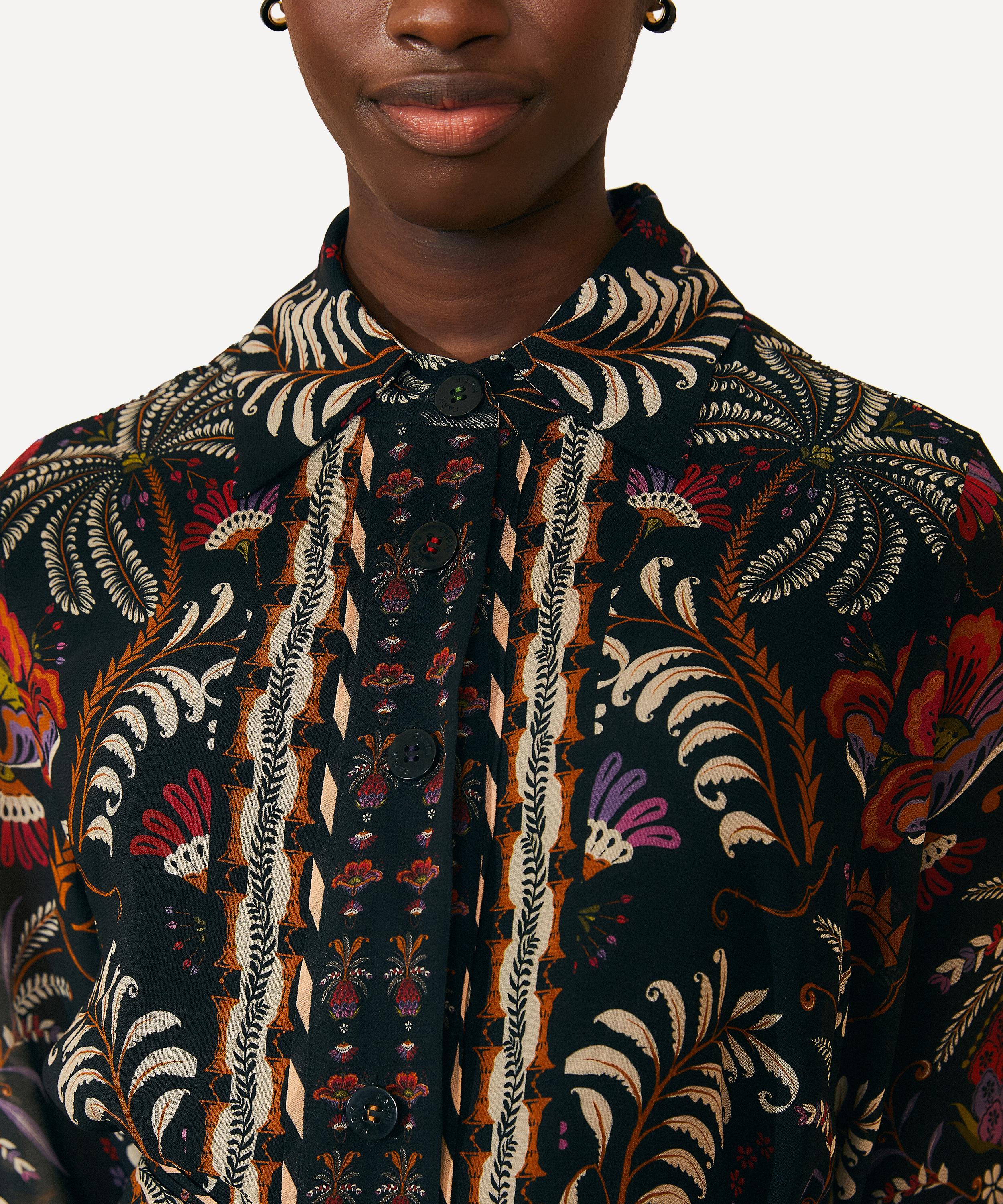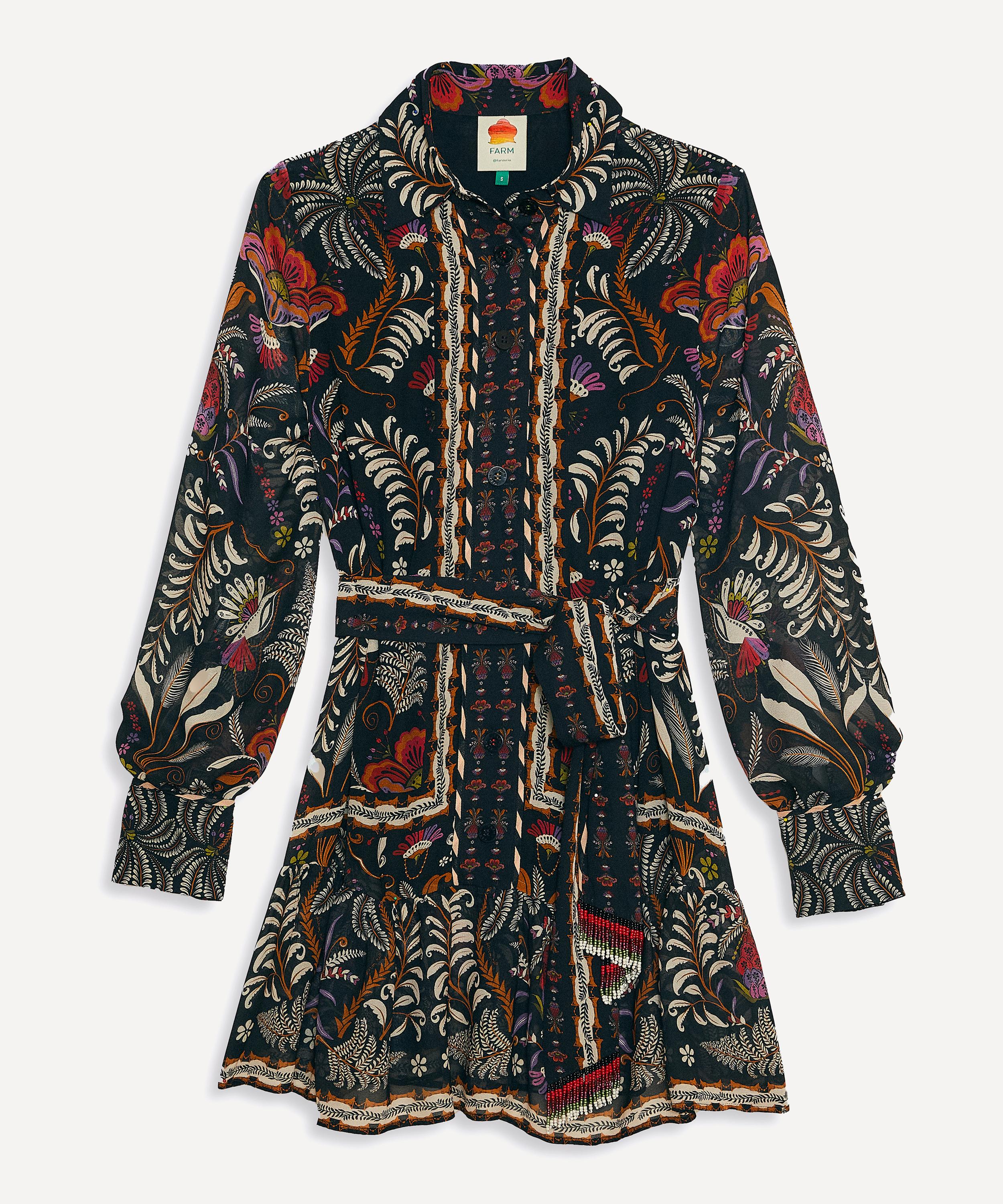 Adorned all-over in the bold and blooming Black Classic Garden print, this elegant shirtdress has a collared neckline, long blouson sleeves and a centre-front button closure. An easy-fit with a tiered short-skirt, it’s cinched at the waist with a beaded waist belt.