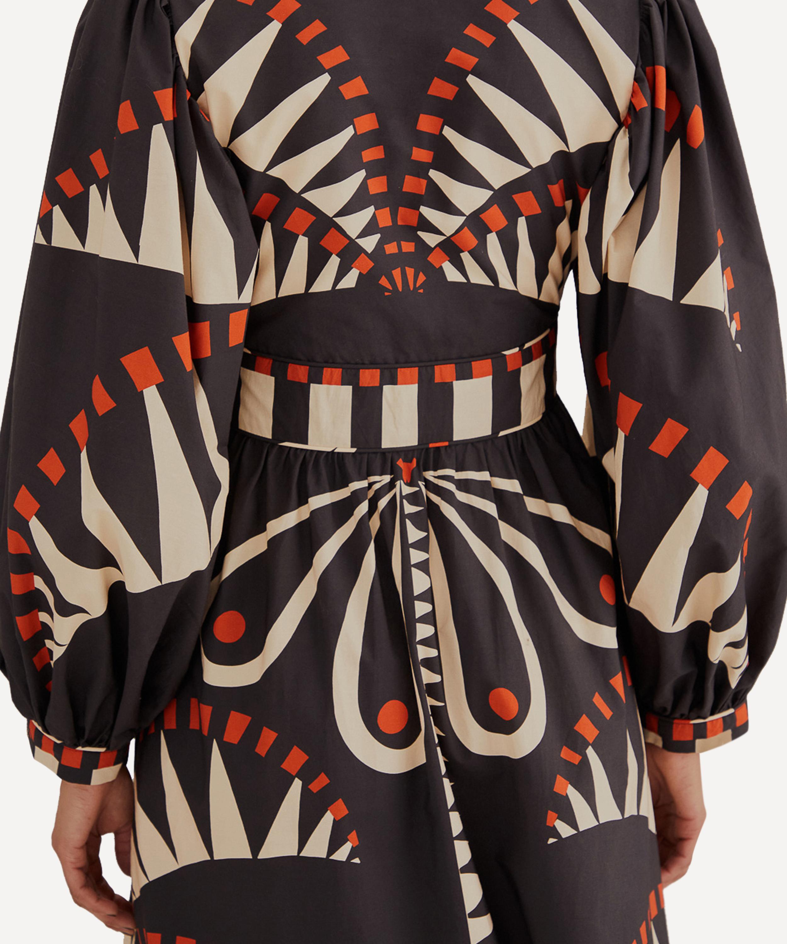 Adorned with the bold and blooming Black Coconut Grove pattern, this cotton maxi-dress is a true statement piece with its plunging V-neckline and long puff-sleeves. Effortlessly flattering with its fitted empire waist, its long and loose skirt is secured with a fully-buttoned placket.