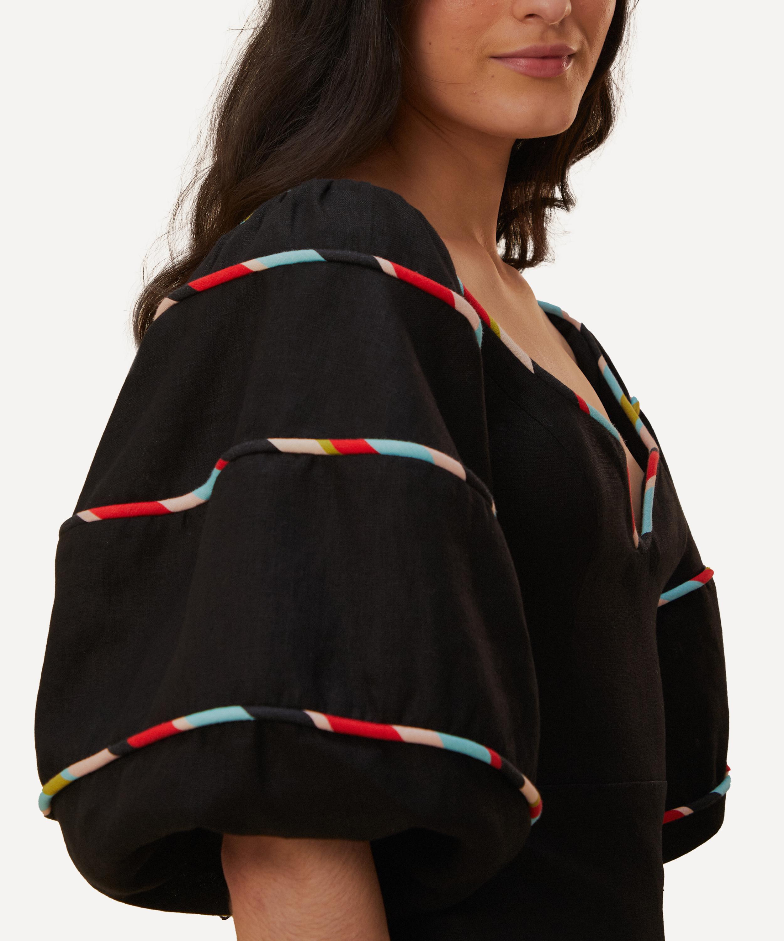 Effortlessly chic, this linen mini-dress exudes elegance with its sweetheart neckline, open back, and voluminous, puffed-sleeves. A versatile piece for any occasion, it’s embellished with coloured striped trims throughout.