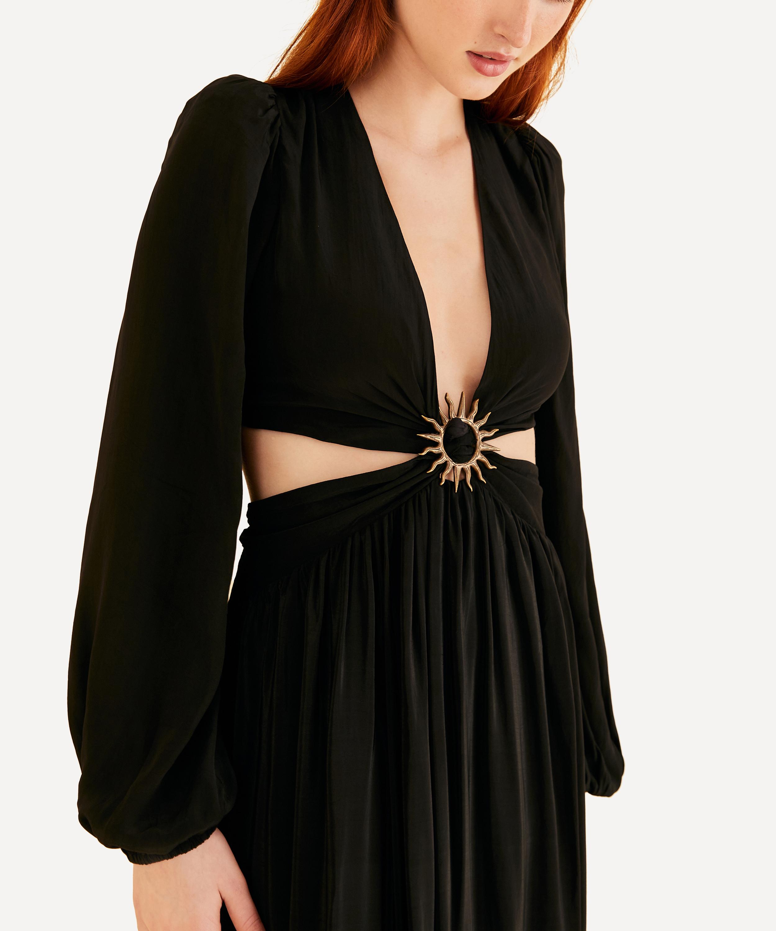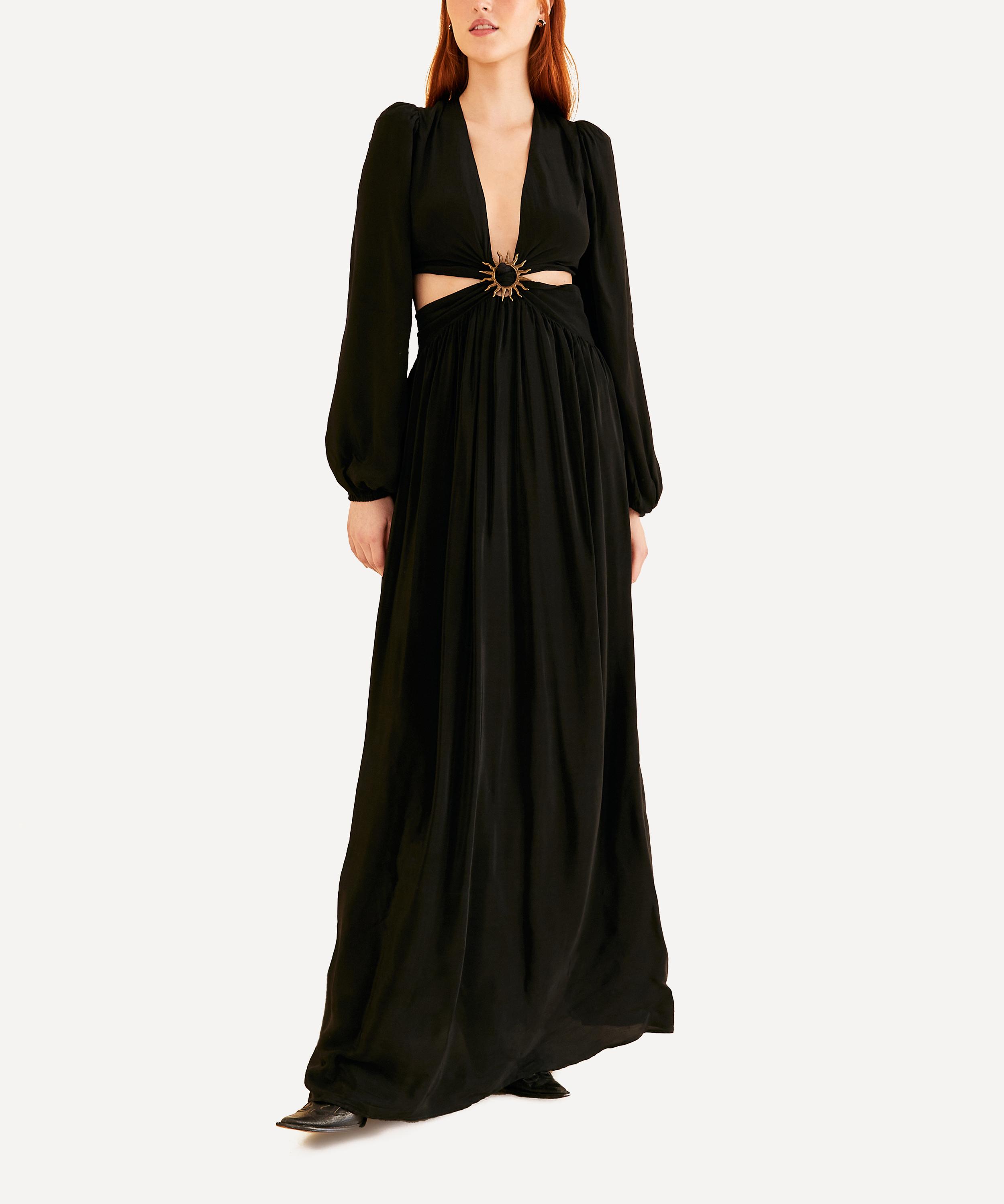 Effortlessly elegant with its plunging V-neckline and cut-out empire waist, this maxi-dress is knotted at the centre with a gold sun buckle. Ideal in cooler months, it has long puff sleeves and an ankle-grazing hem.