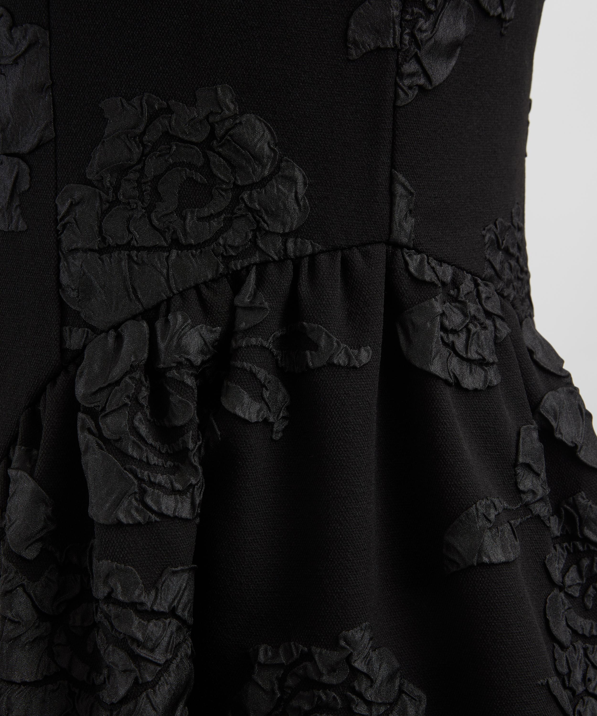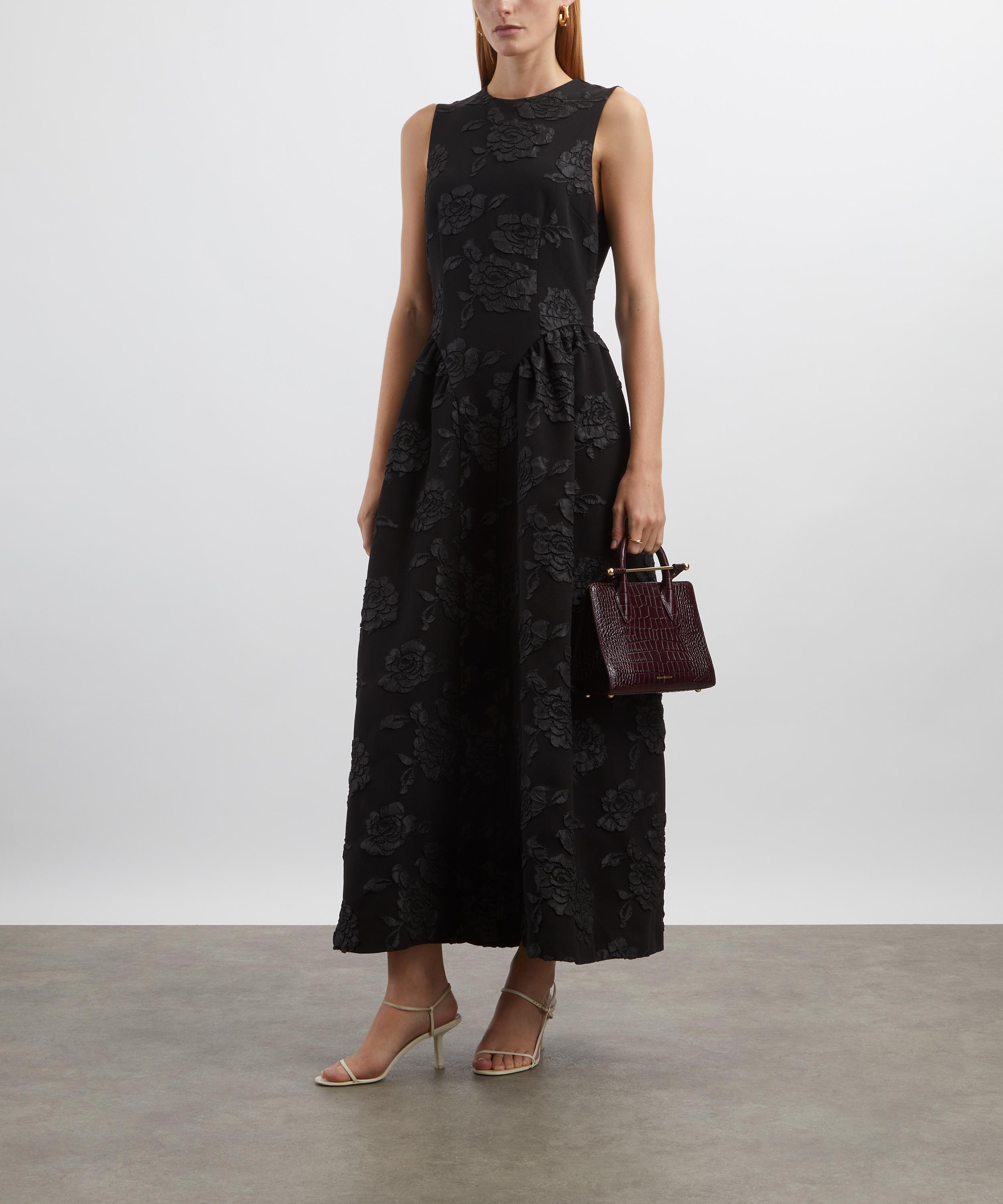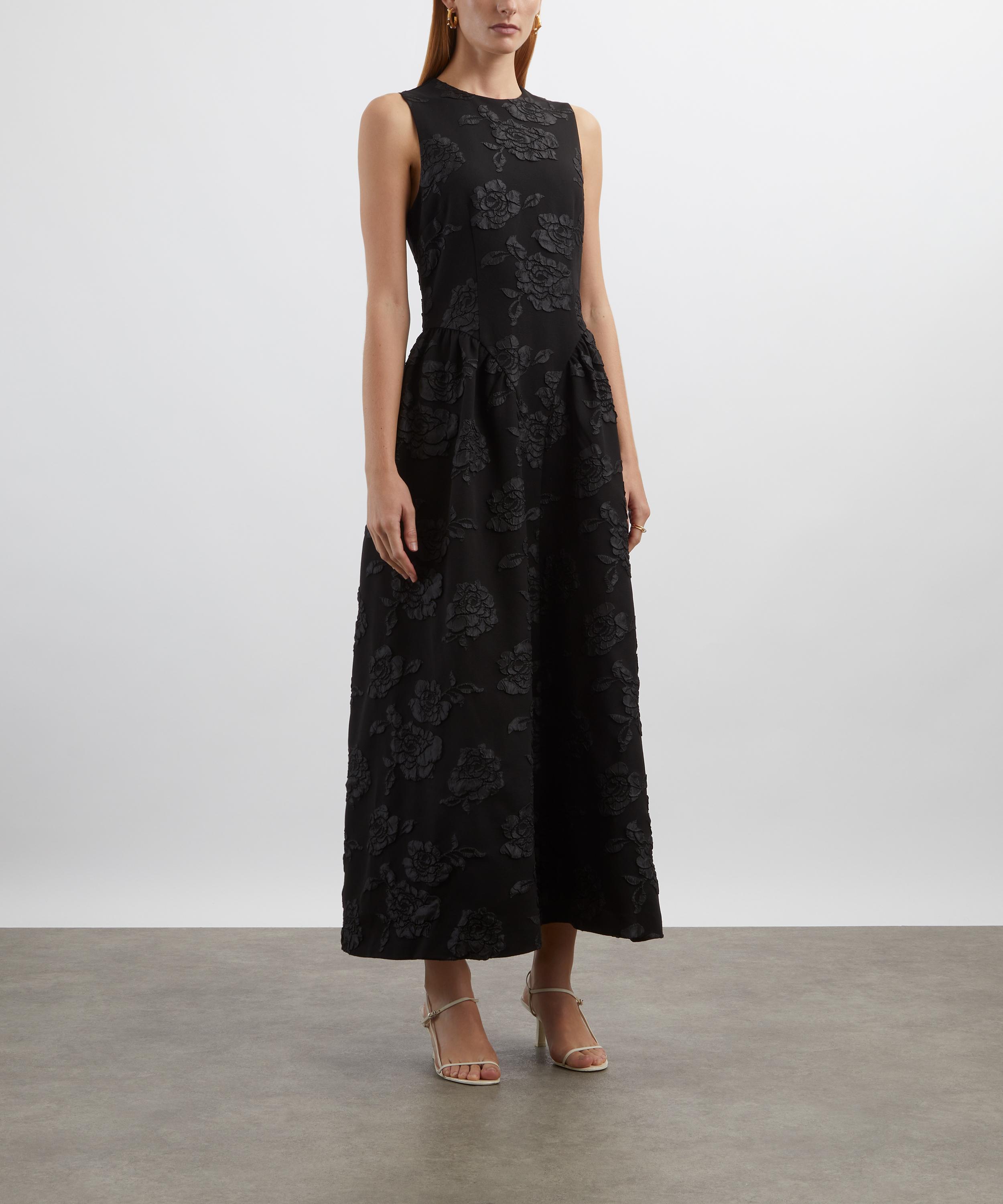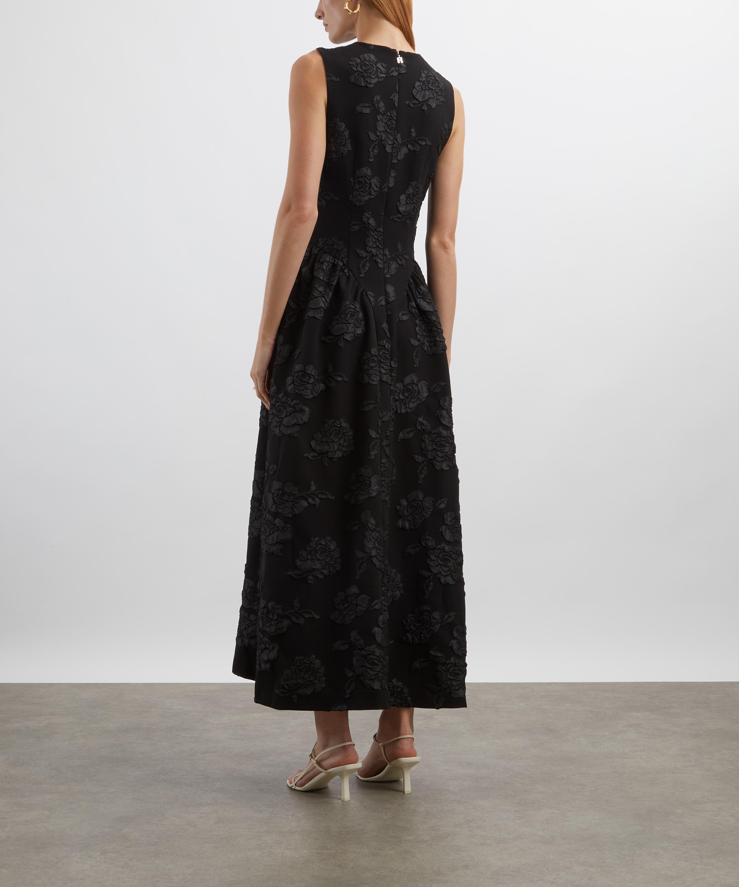 Crafted from a tactile black jacquard fabric, this sleeveless dress exudes elegance with its round neckline, fitted silhouette, and voluminous midi-length skirt.