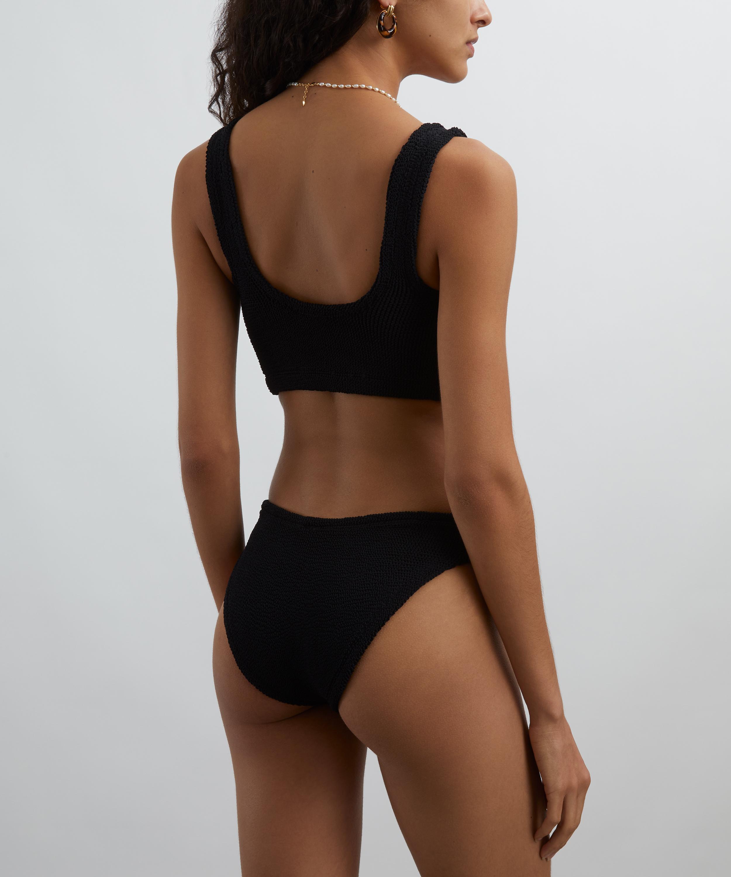 Crafted from the label’s signature crinkle material for a comfortable, flattering fit every time, this black bikini set features a twist-detail top and classic bikini bottoms that can be worn high or low on the hip, capturing a true ‘80s-inspired aesthetic.