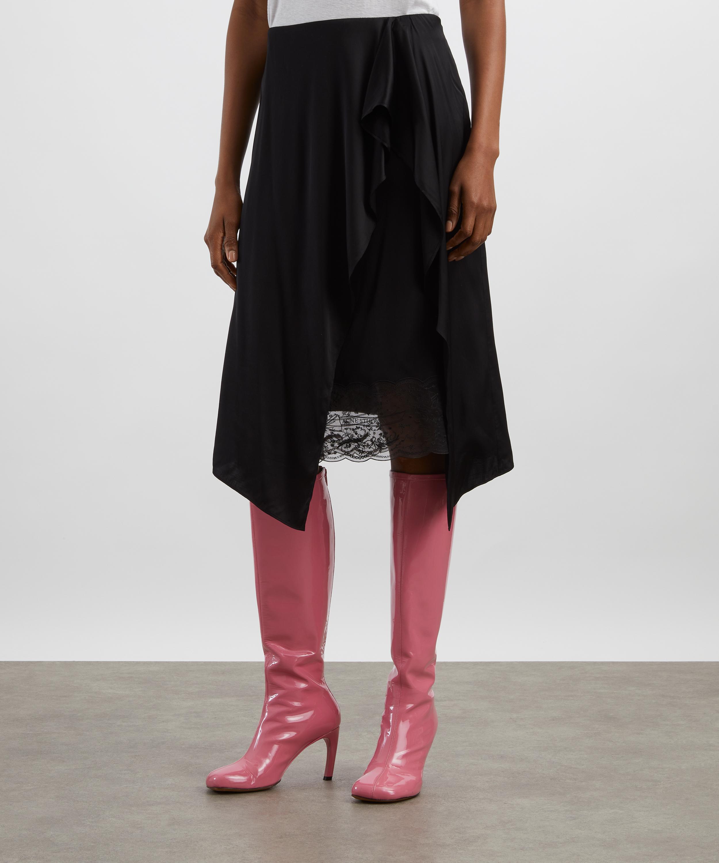 Crafted from lightweight satin, this midi skirt features a ruffled, layered construction with an asymmetric hem and a delicate lace underlayer that adds a subtle, sensuous touch.