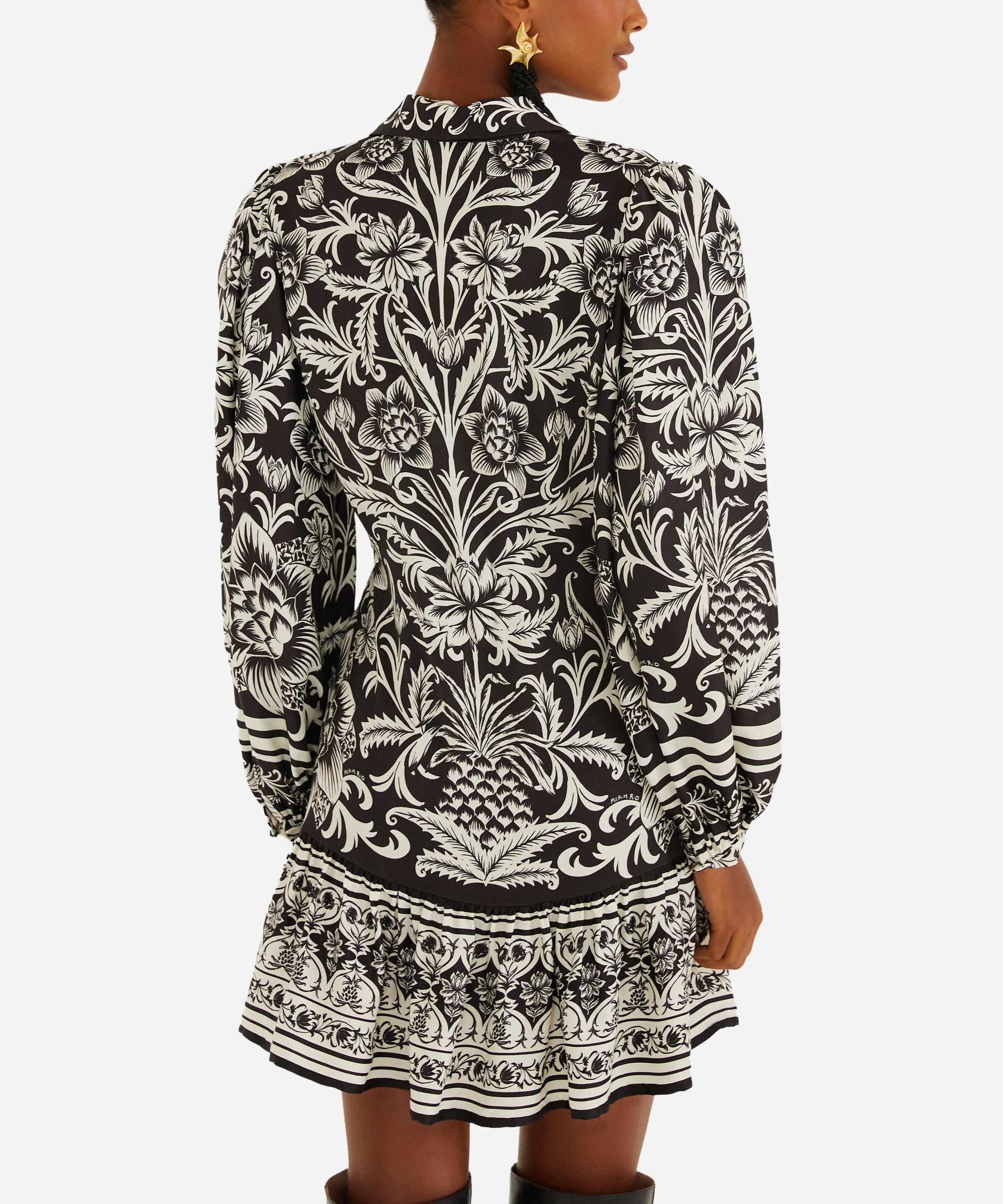 Effortlessly charming, this mini dress showcases bold monochrome florals on lightweight crepe. With a relaxed fit, collared V-neckline, long puff sleeves, button front, and a playful peplum hem, it’s perfect for easy, elevated style.