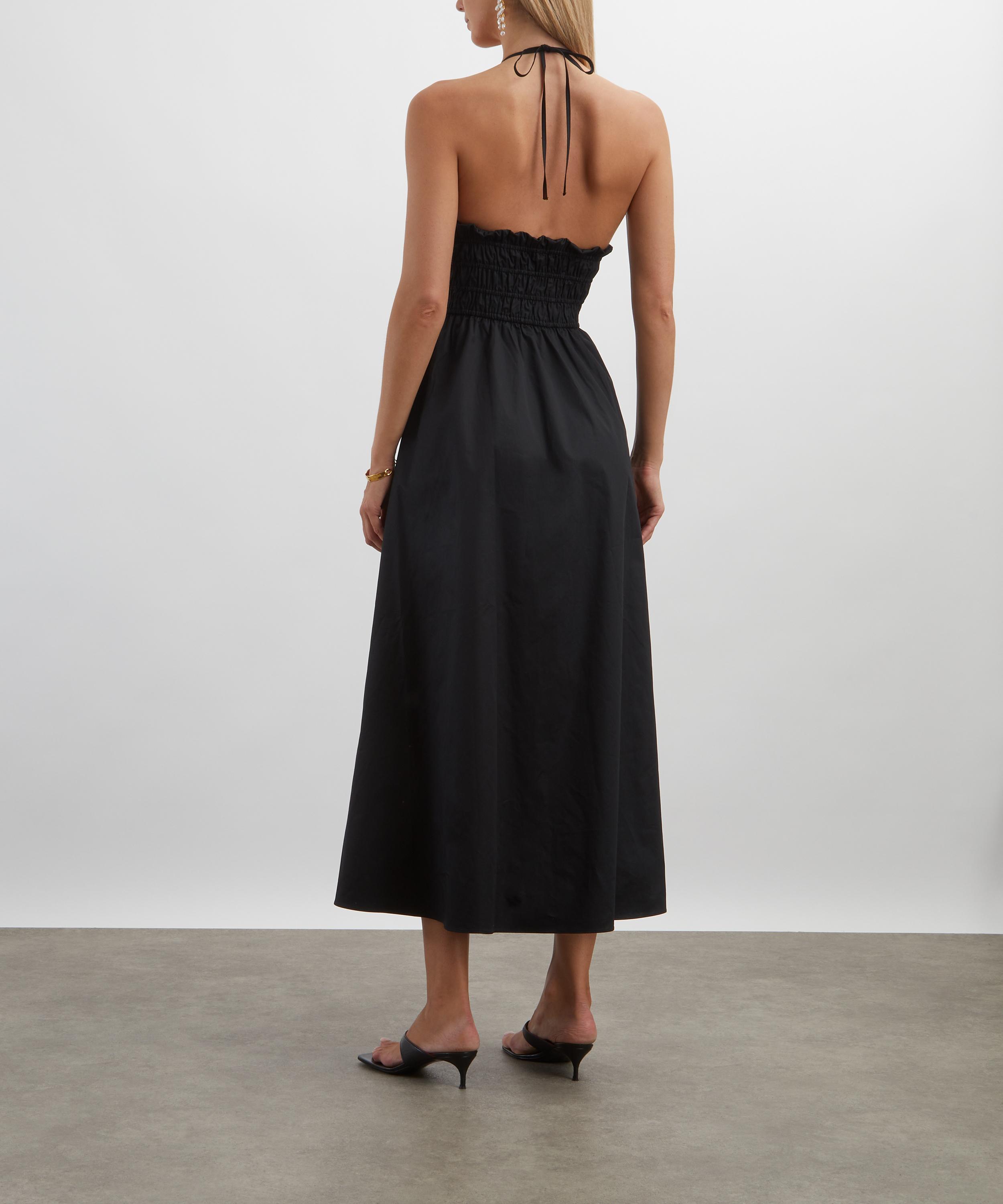 The Lolita Dress is a warm-weather staple crafted from classic sateen poplin. With a fully smocked bodice, separated woven cups, and a delicate bow detail, it offers a flattering, adjustable fit. An adjustable halter tie and front pockets complete the effortlessly stylish look.