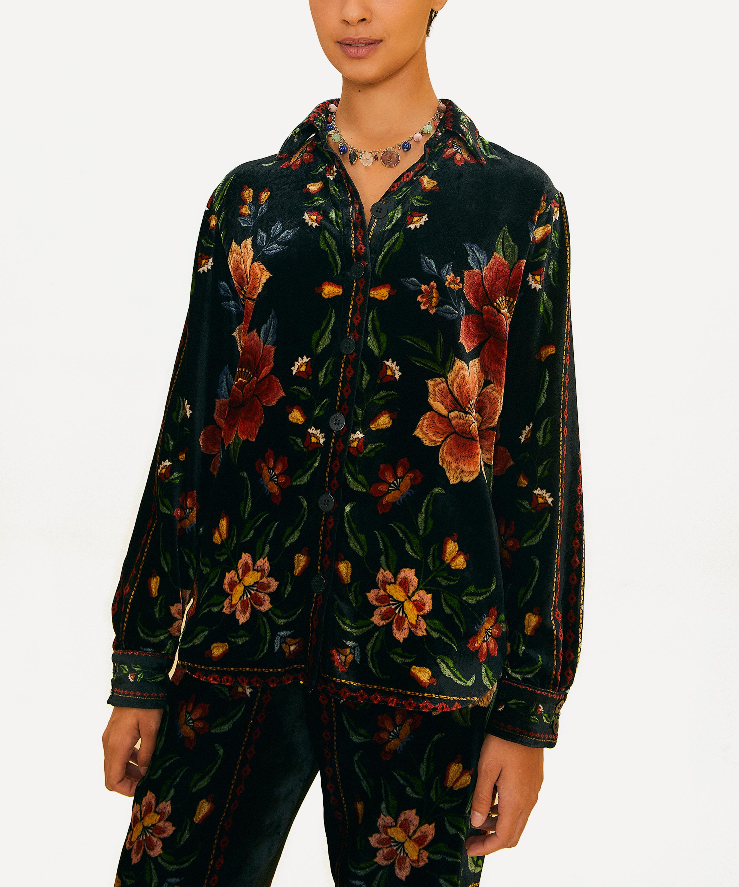 Adorned all-over in the bold and blooming Black Macaws Garden print, this plush velvet shirt is designed for an easy fit with a classic point collar, long cuffed sleeves and a buttoned placket, complete with a decorative trellis border printed throughout.