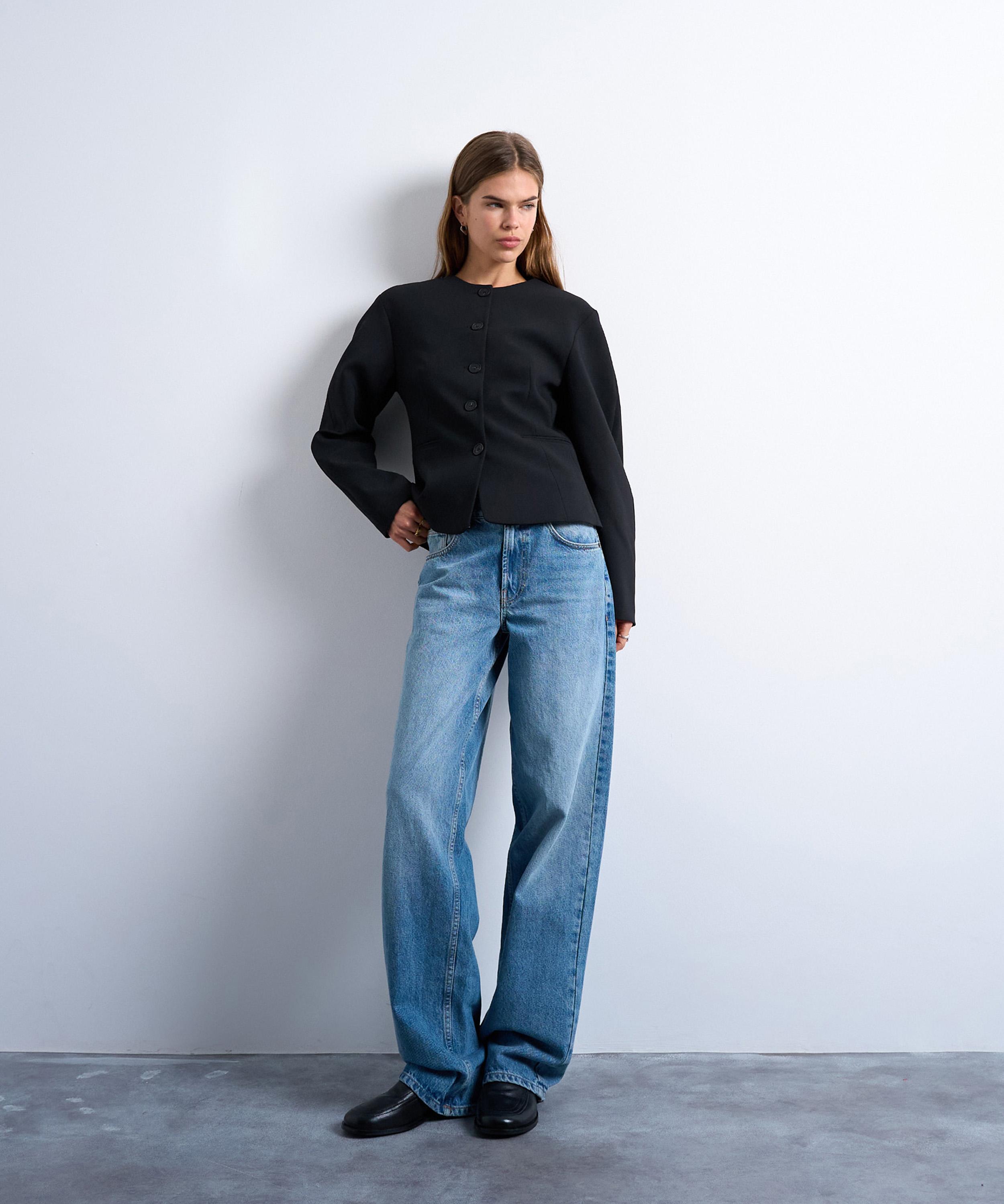 Crafted from a plain woven fabric, this blazer top features a classic regular fit with a round neckline, button placket, and rounded ovoid sleeves - offering a modern interpretation of classic tailoring.