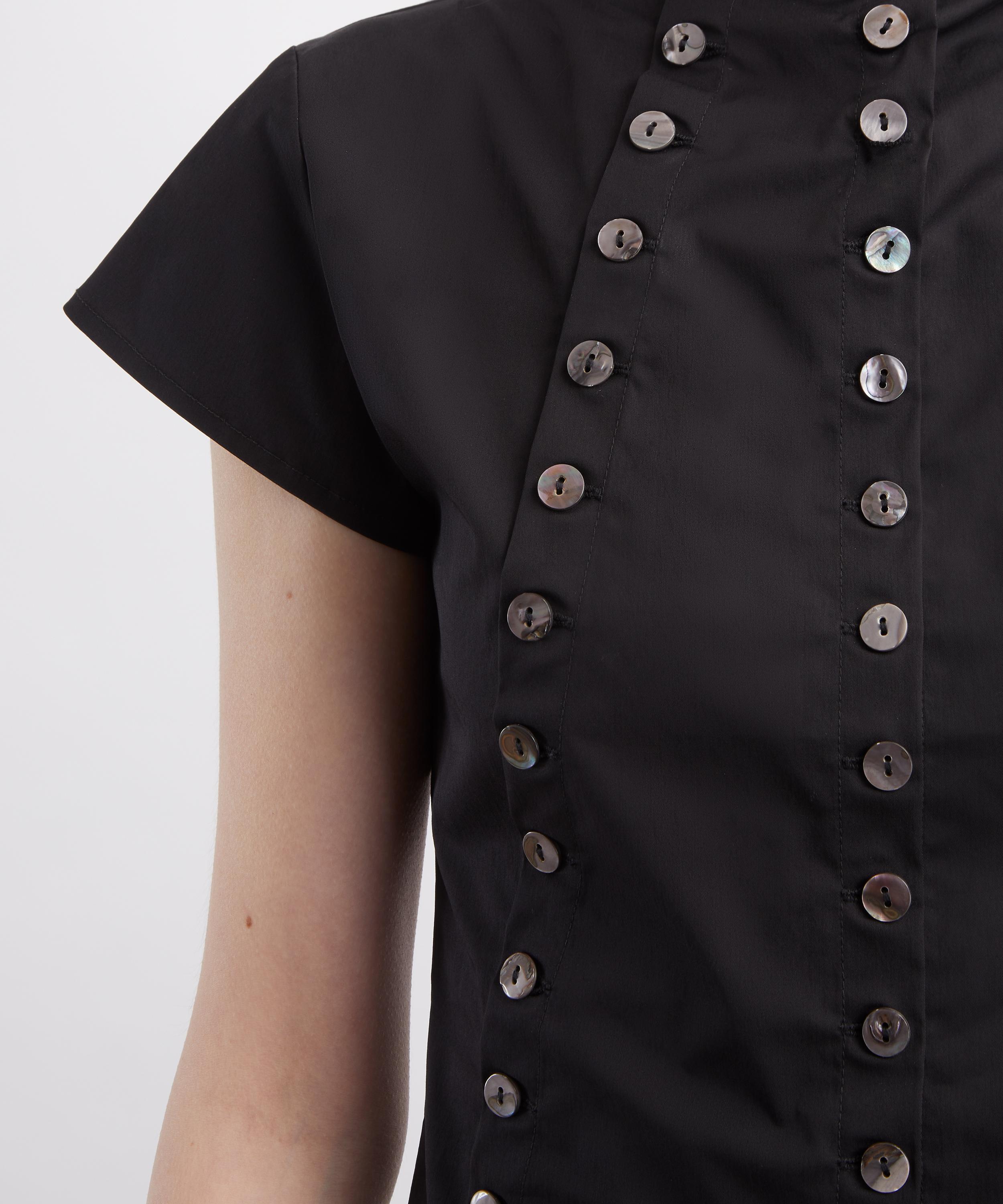 Inspired by a shirt worn by the poet Sylvia Plath, this signature design from Caspar the Label is crafted from premium cotton-nylon deadstock fabric. A convertible mock neckline, double placket, and cap sleeves lend a contemporary yet subtly vintage edge to classic tailored shirting.