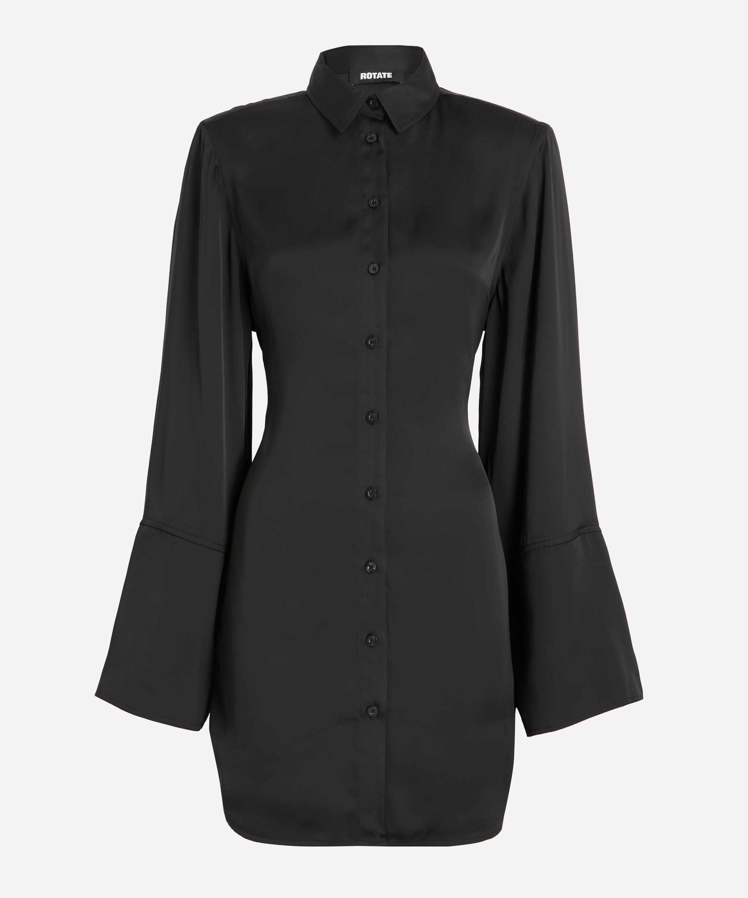 The Black Satin Tie Shirt Dress from ROTATE Birger Christensen brings a bold dose of Copenhagen cool to your evening wardrobe.