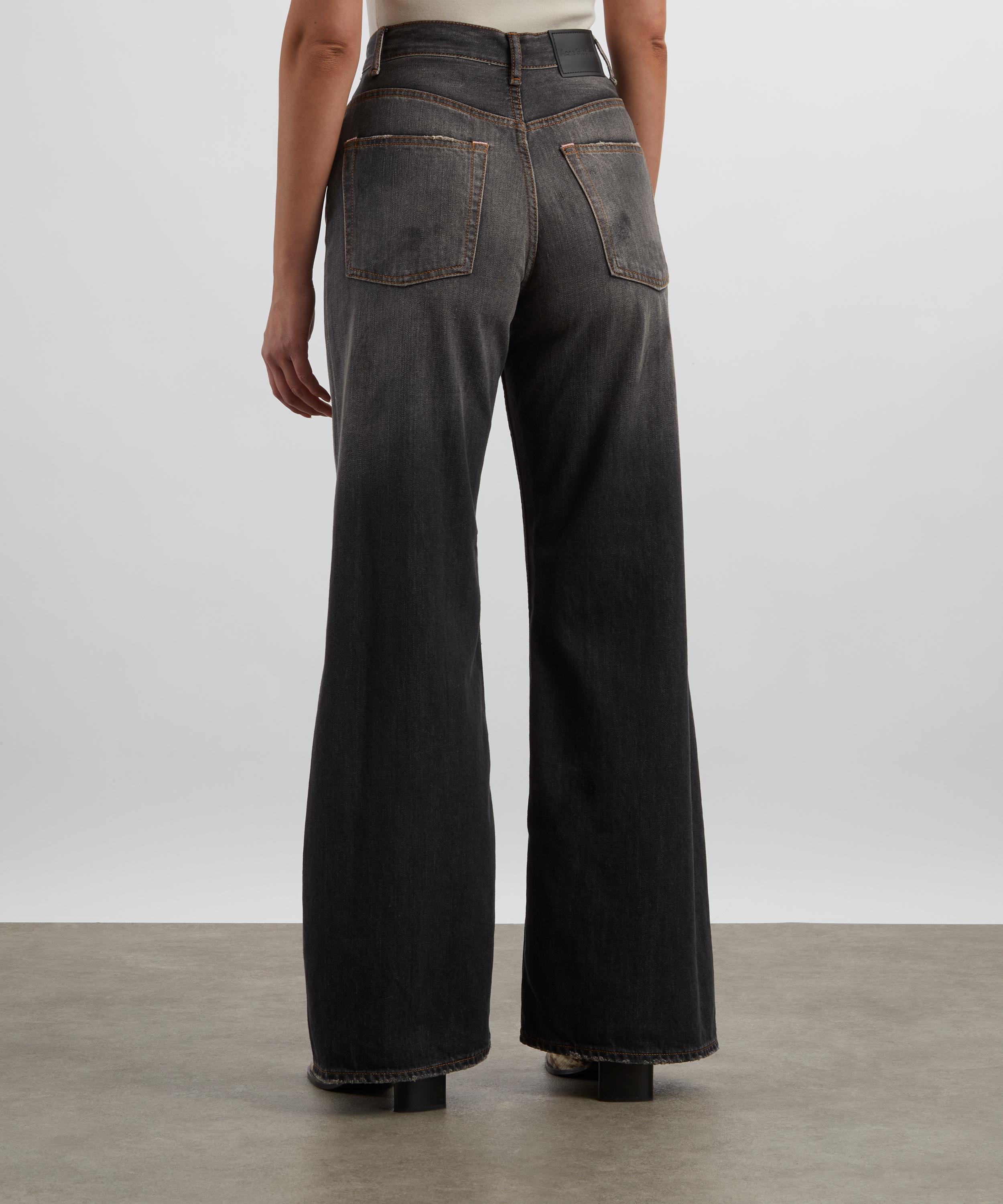 Crafted from rigid cotton denim in a dark black wash, these jeans have a mid-waist, and a wide-leg silhouette with 5-pocket construction and a logo-embossed leather jacron patch, as well as manual dirt and paint marks throughout for a lived-in finish.