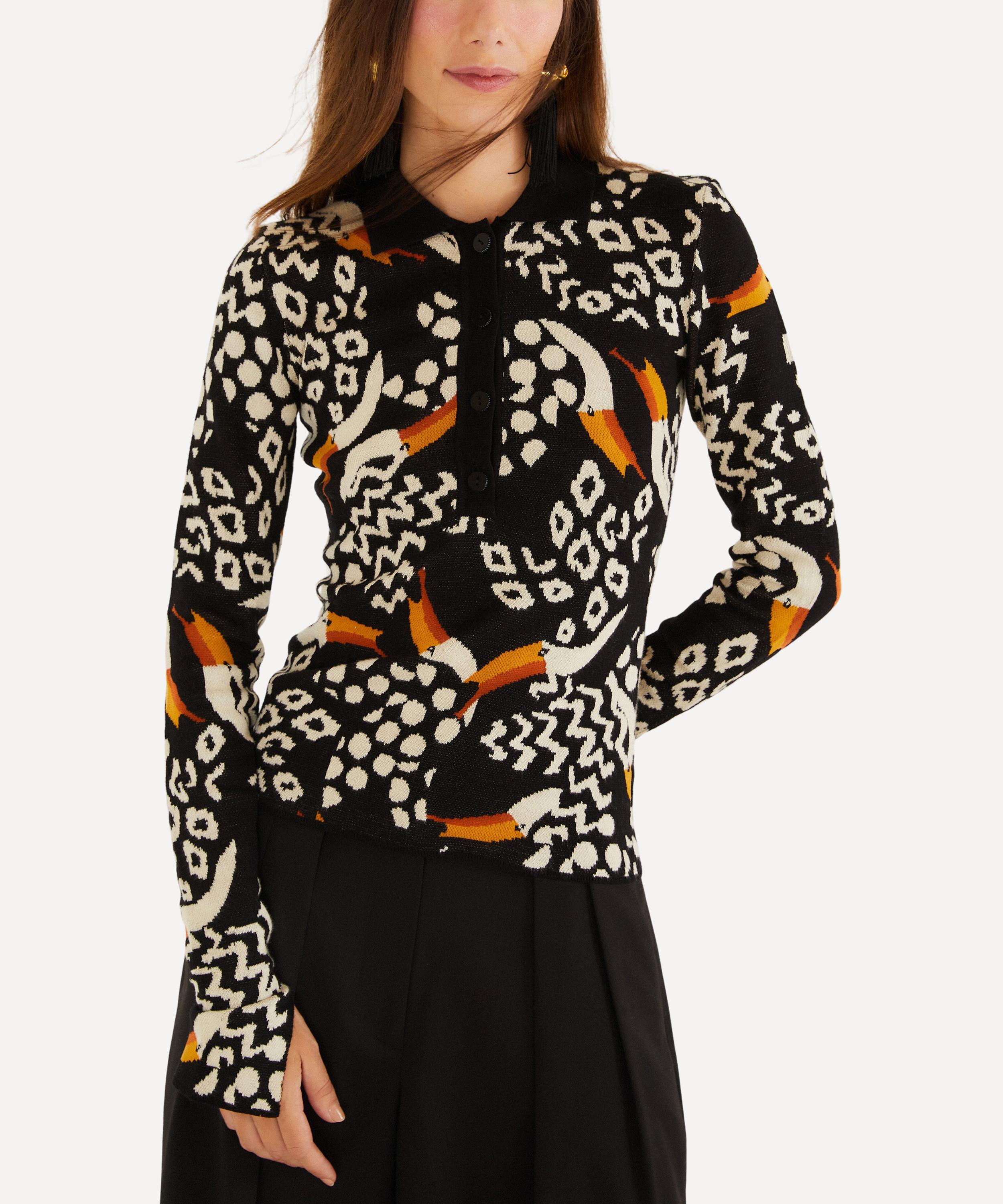 Cozy meets vibrant in the Black Tucanissimo Polo Knit Top, featuring a bold toucan jacquard design. Complete with a polo collar, partial button placket, and long sleeves - making it an effortless knitwear staple with heartfelt charm.