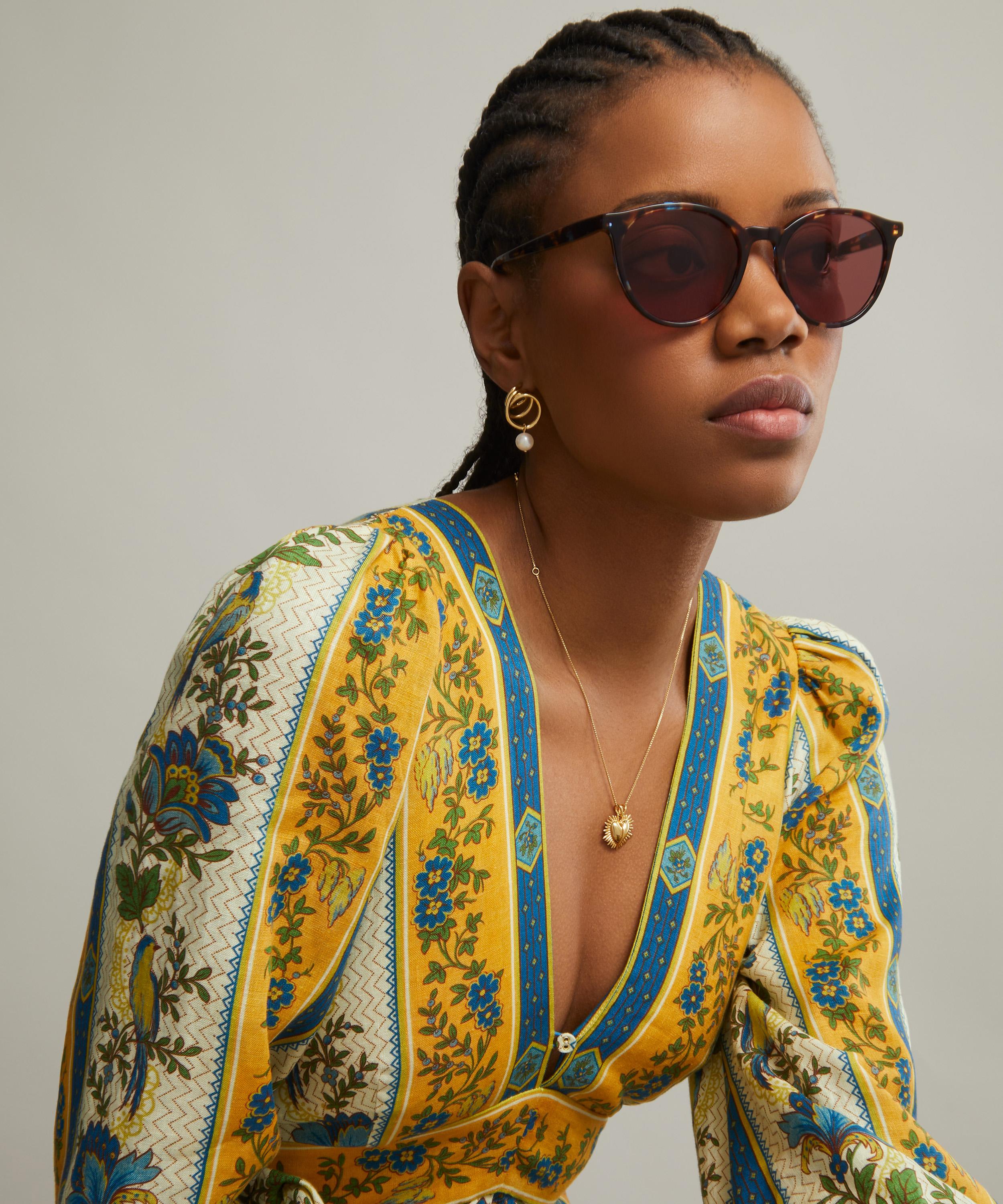 Transforming iconic shades with a touch of Liberty print, these sleek sunglasses are crafted to a round silhouette from durable acetate, accentuated by brown tinted lenses. Complete with subtle branding to the left temple, the coveted design stands out with a vibrant floral print on the inside arms, perfect for adding a stylish finish to any outfit.