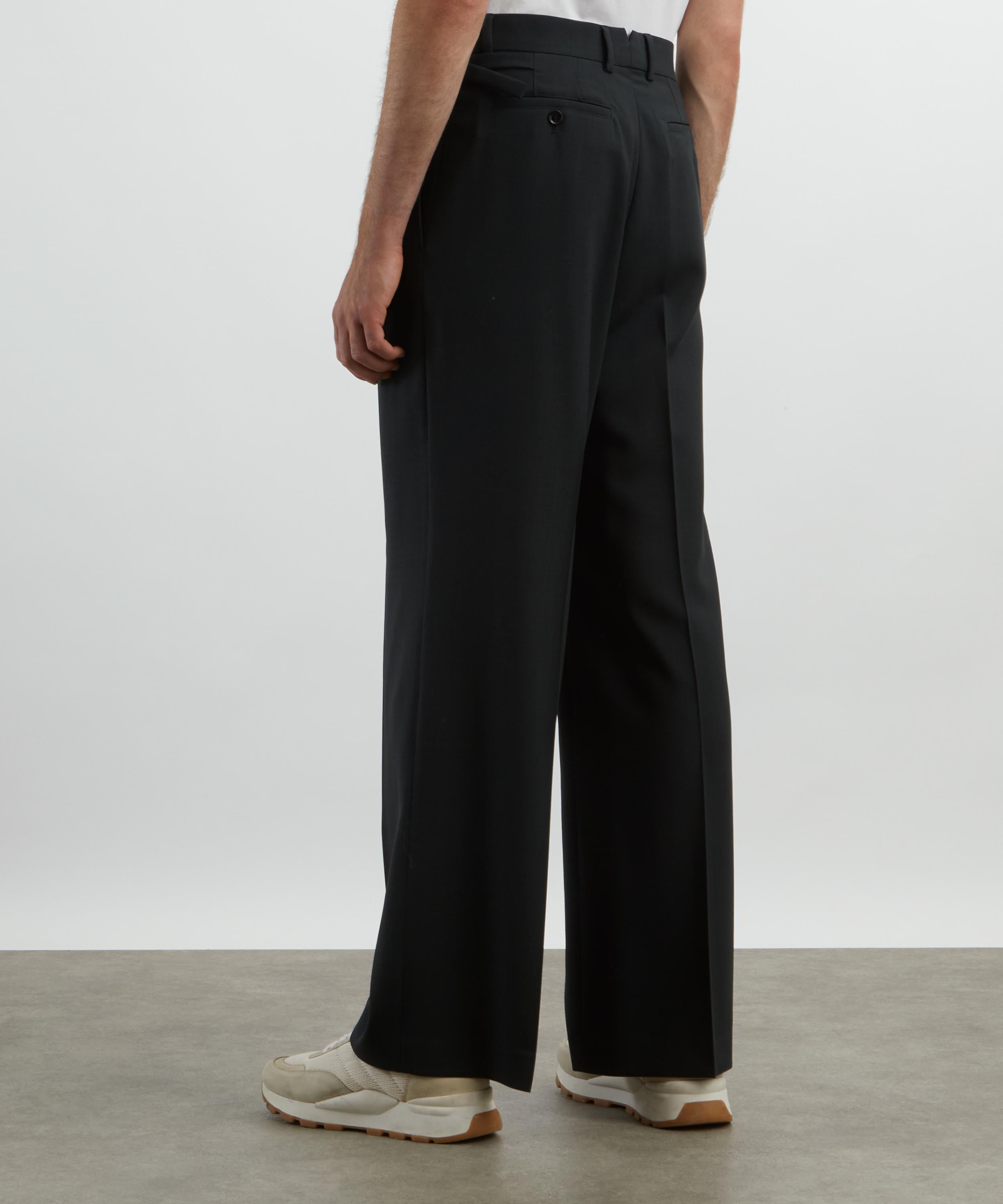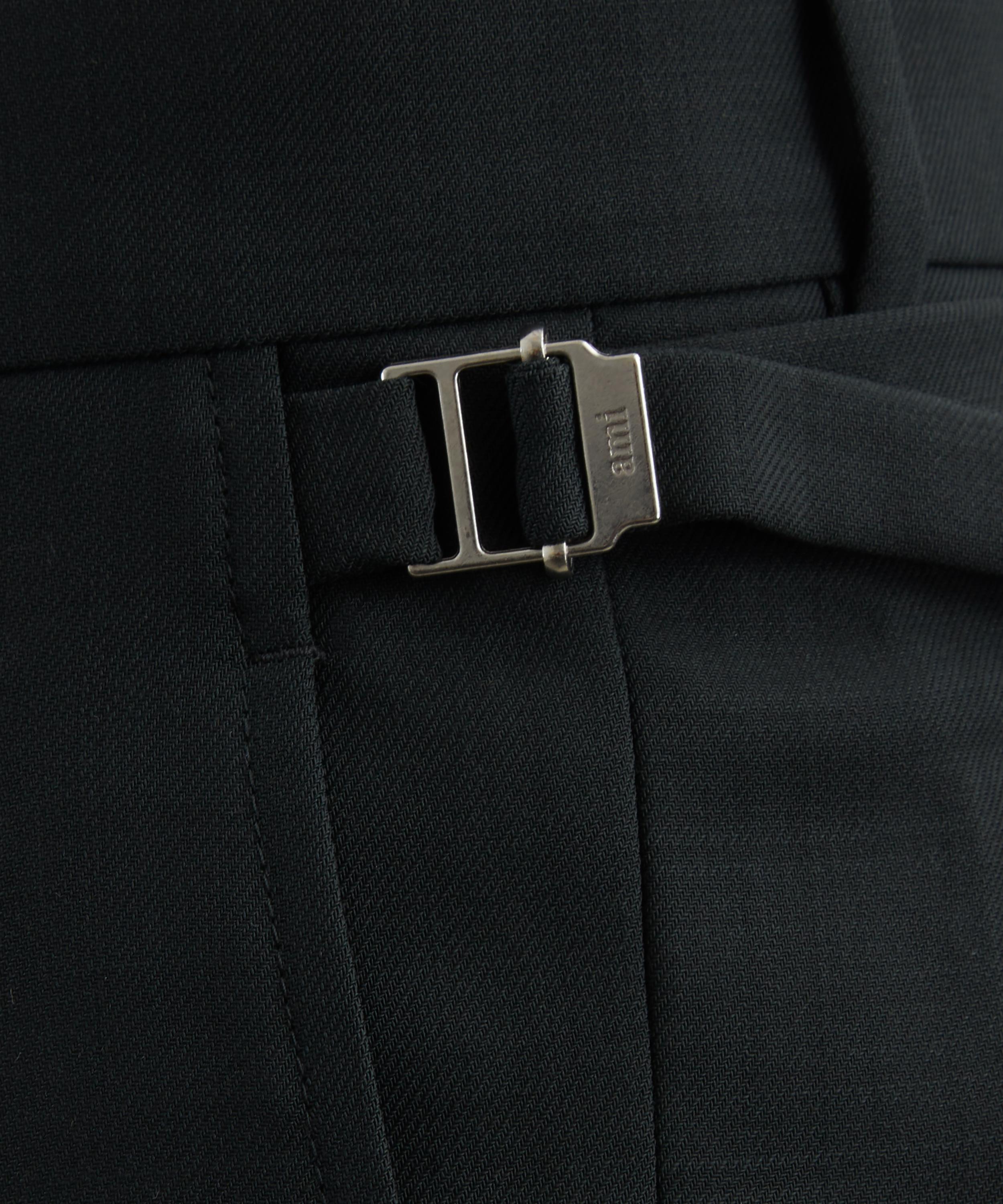 Crafted from wool tricotine, these trousers feature a low waist and wide-leg silhouette, accented with double pleats, adjustable side tabs, and a back V detail for a timeless, tailored finish.