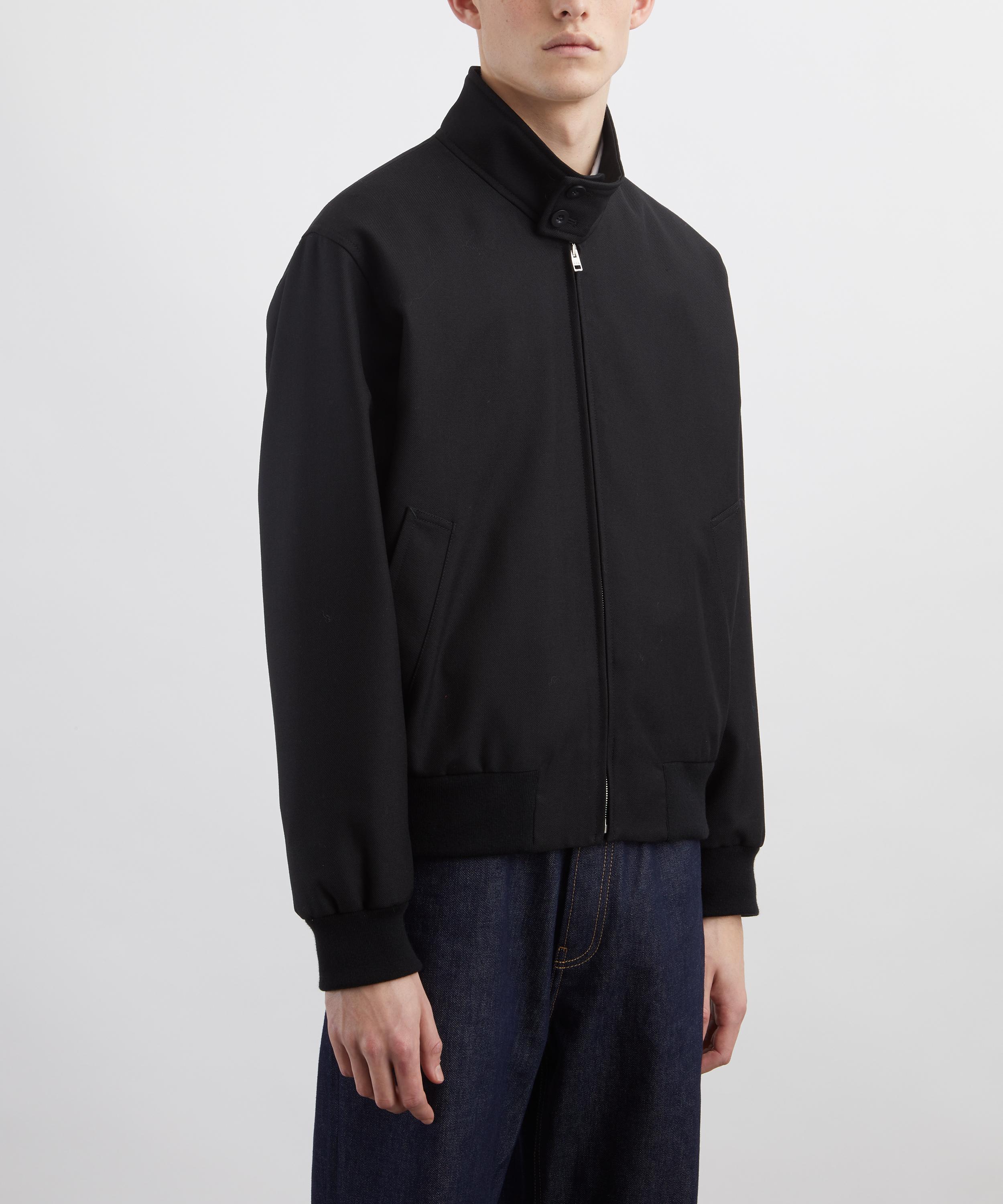 Crafted from woollen fabric, this blouson-style jacket is defined by a clean straight cut and a high collar with a buttoned flap. Finished with a zip closure, side pockets, and ribbed trims, it offers a refined yet versatile option for transeasonal dressing.