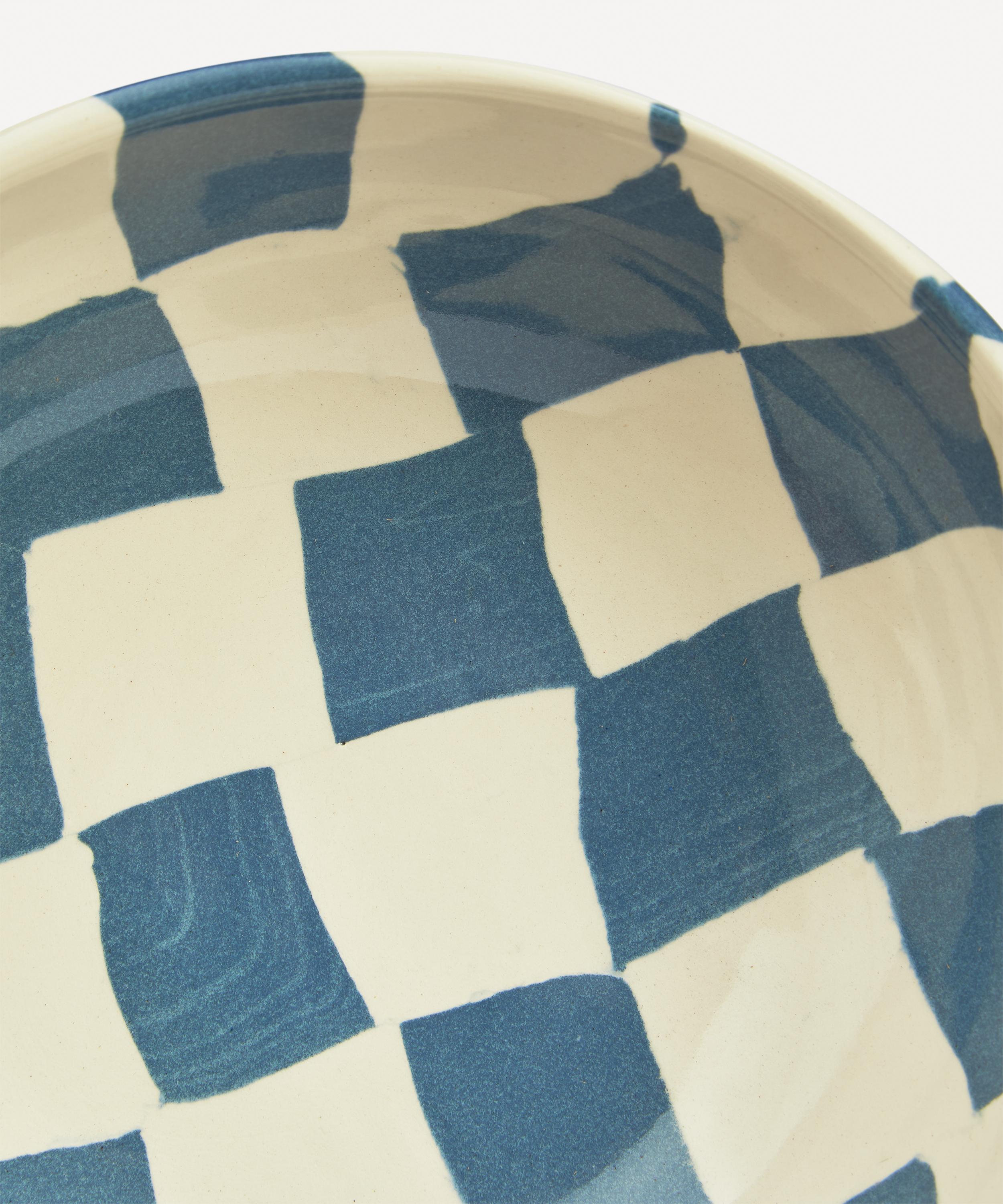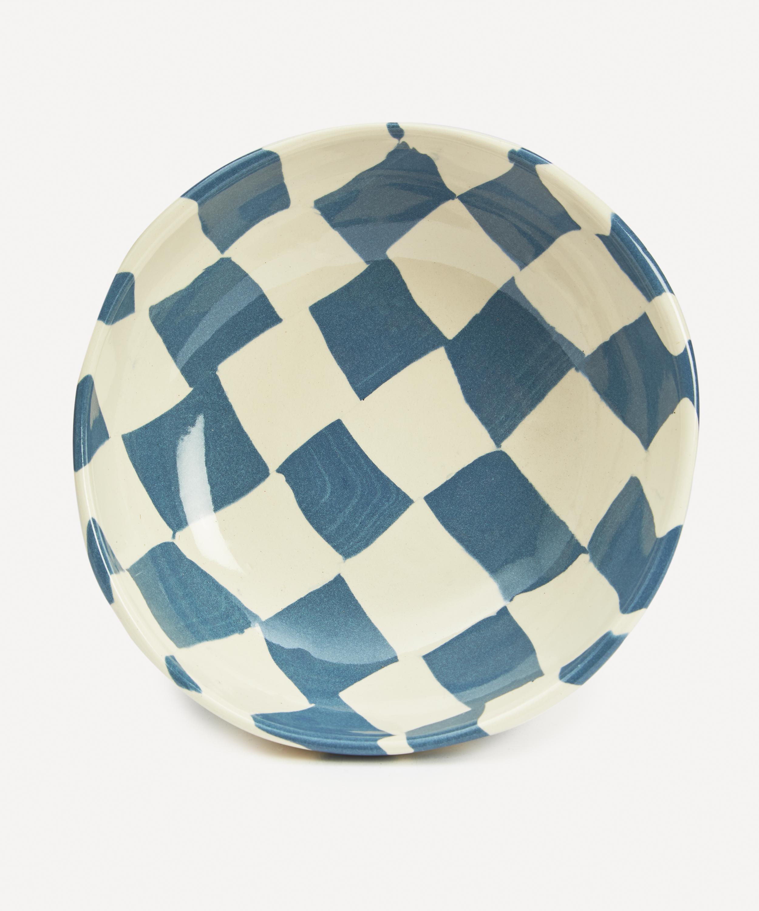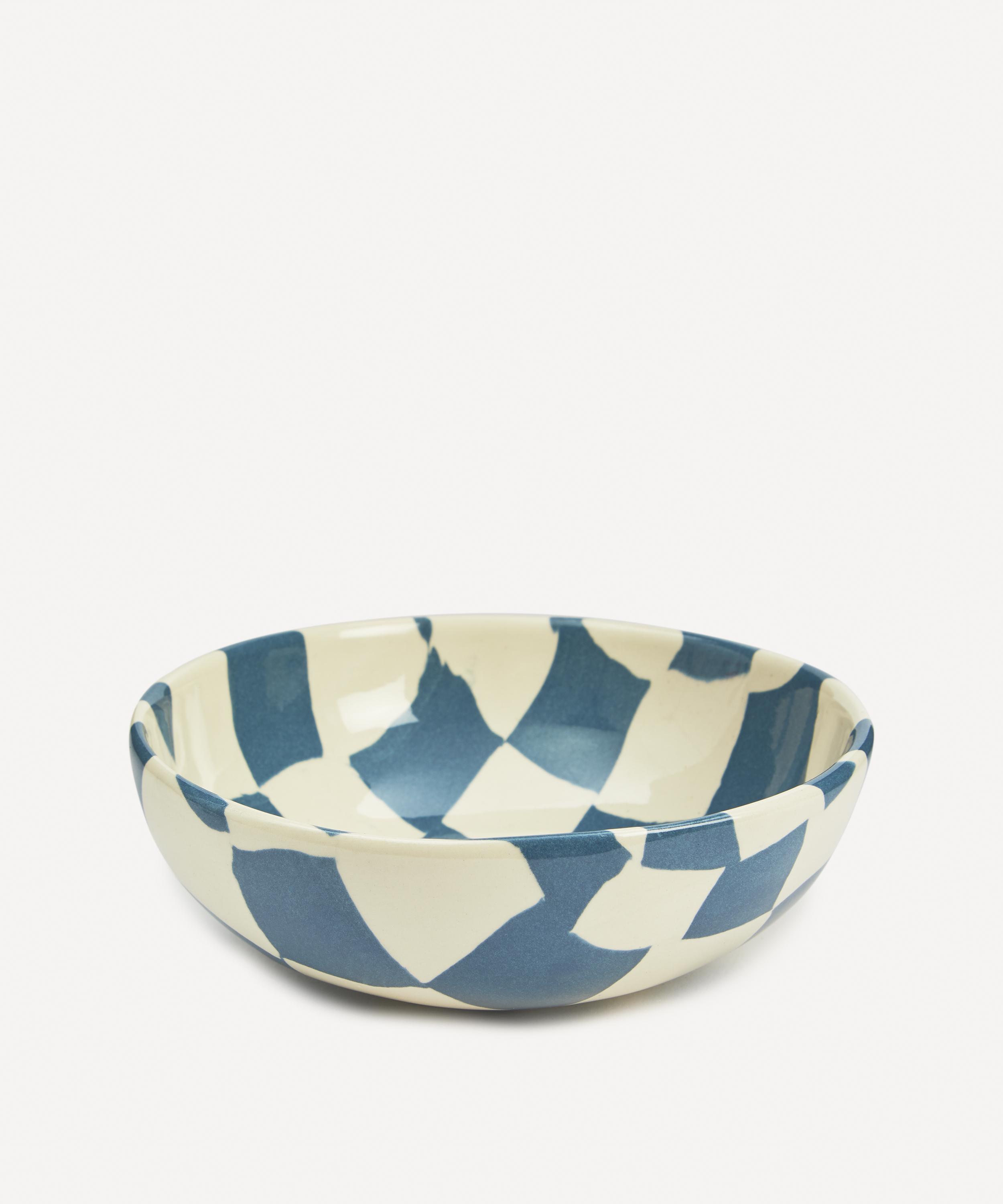 The small bowl, seen here in blue and white earthenware clay, is hand-built using a drape moulding technique, resulting in slight imperfections that add to the unique look and feel. Finished with a transparent high-gloss glaze to reveal the intricate checkerboard pattern beneath, each bowl is a statement piece in its own right. The perfect addition to any tablescape, it features a small foot to help it stand tall.