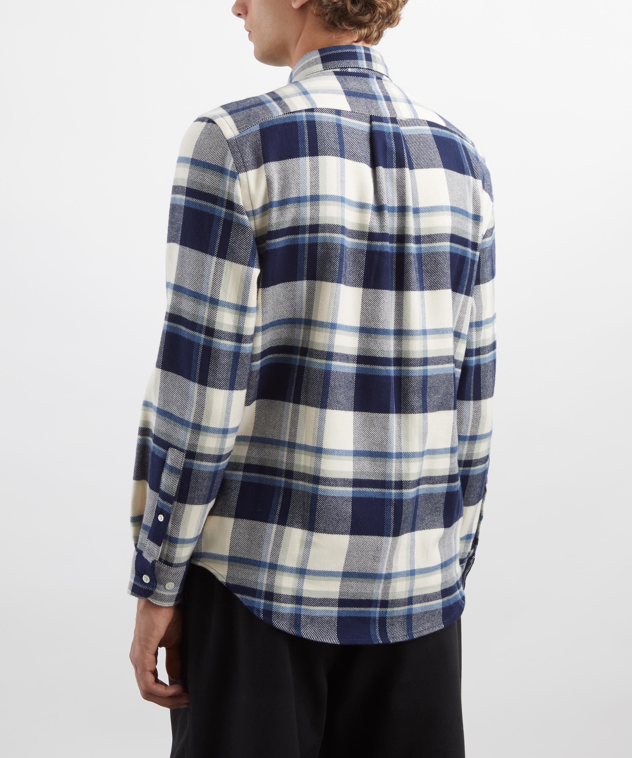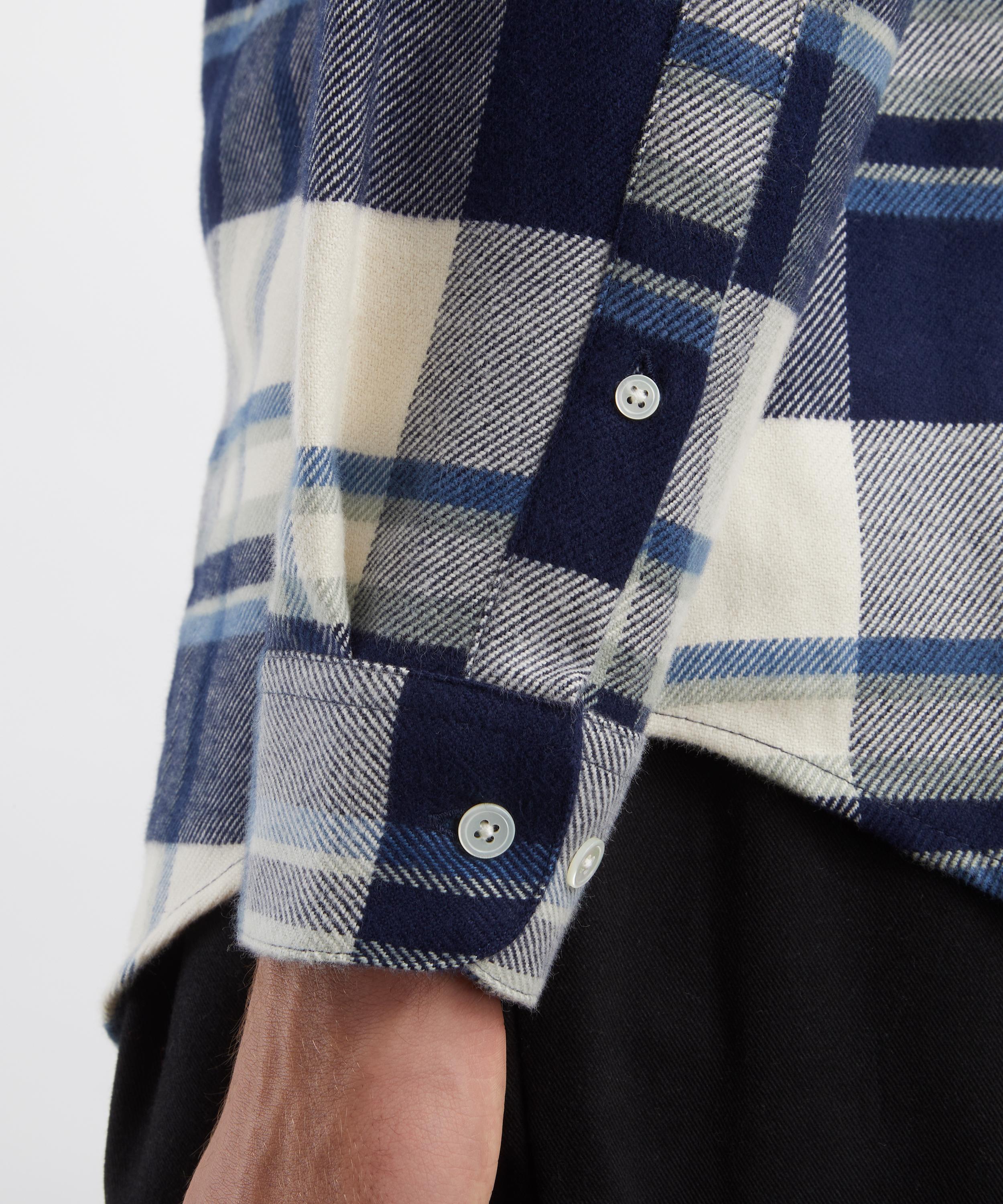 Crafted from soft cotton adorned with a blue madras check, this shirt features a classic collar, mother-of-pearl button fastening, and a single chest pocket - offering timeless utilitarian style with a modern edge.