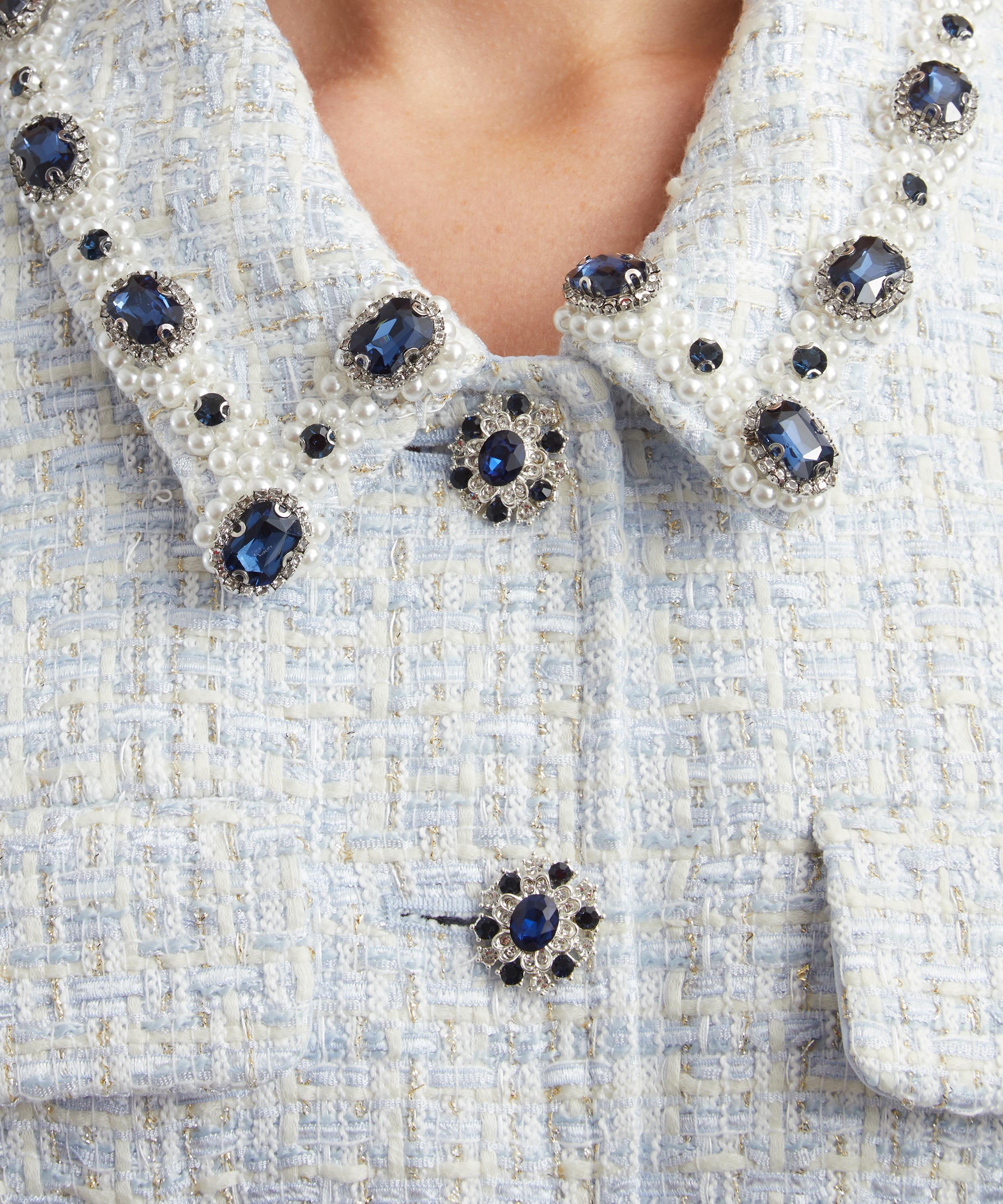 With its waffle knit construction and sculpted fit, this blue mini dress exudes sophistication. Framed by a revere collar and a fitted waist that flows into a pleated skirt, diamanté trims and sparkling buttons add a touch of luxury and refinement to this elegant piece.