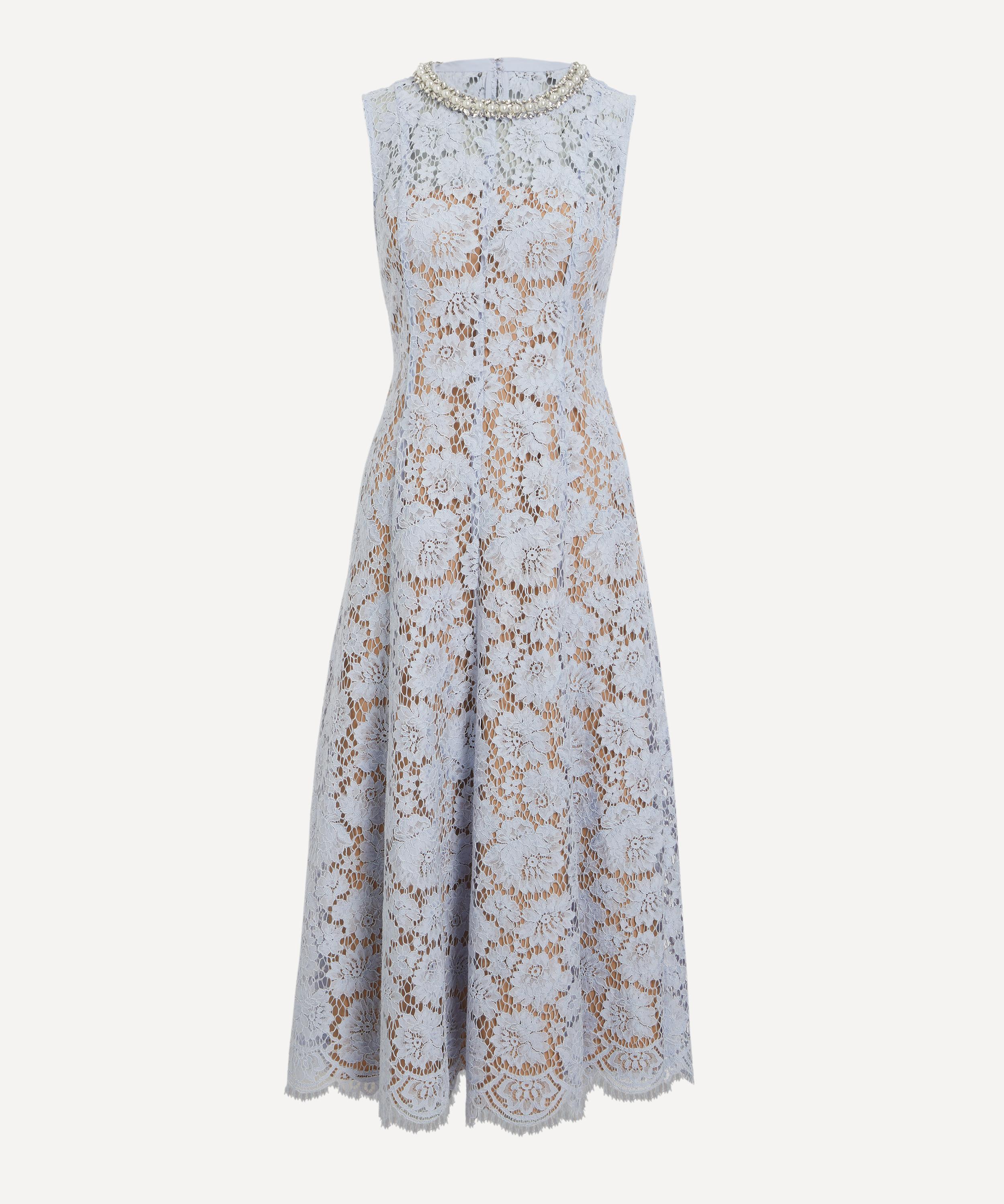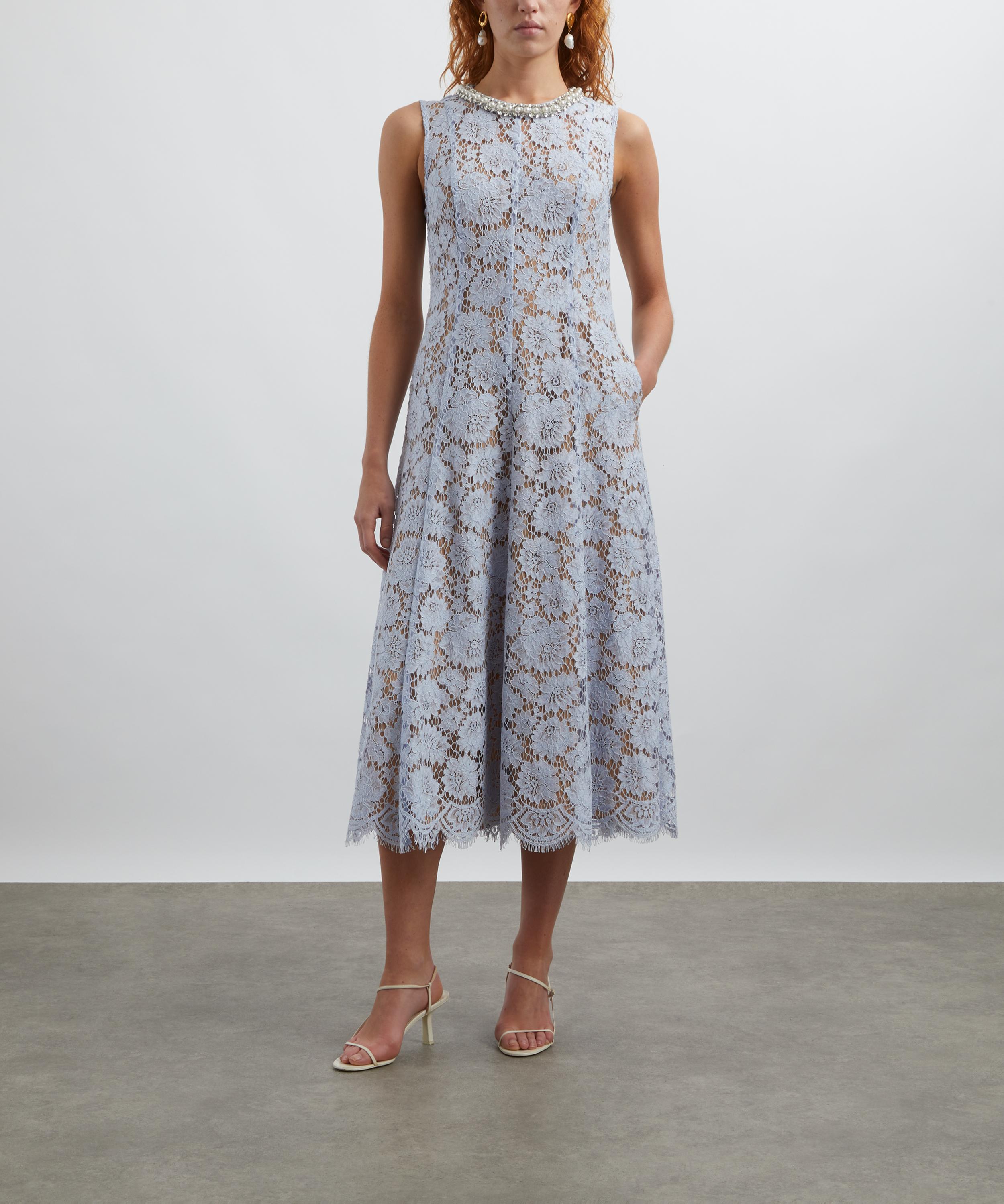 Classically feminine, the Blue Fine Lace Pearl Midi Dress from Self-Portrait defines effortless elegance.