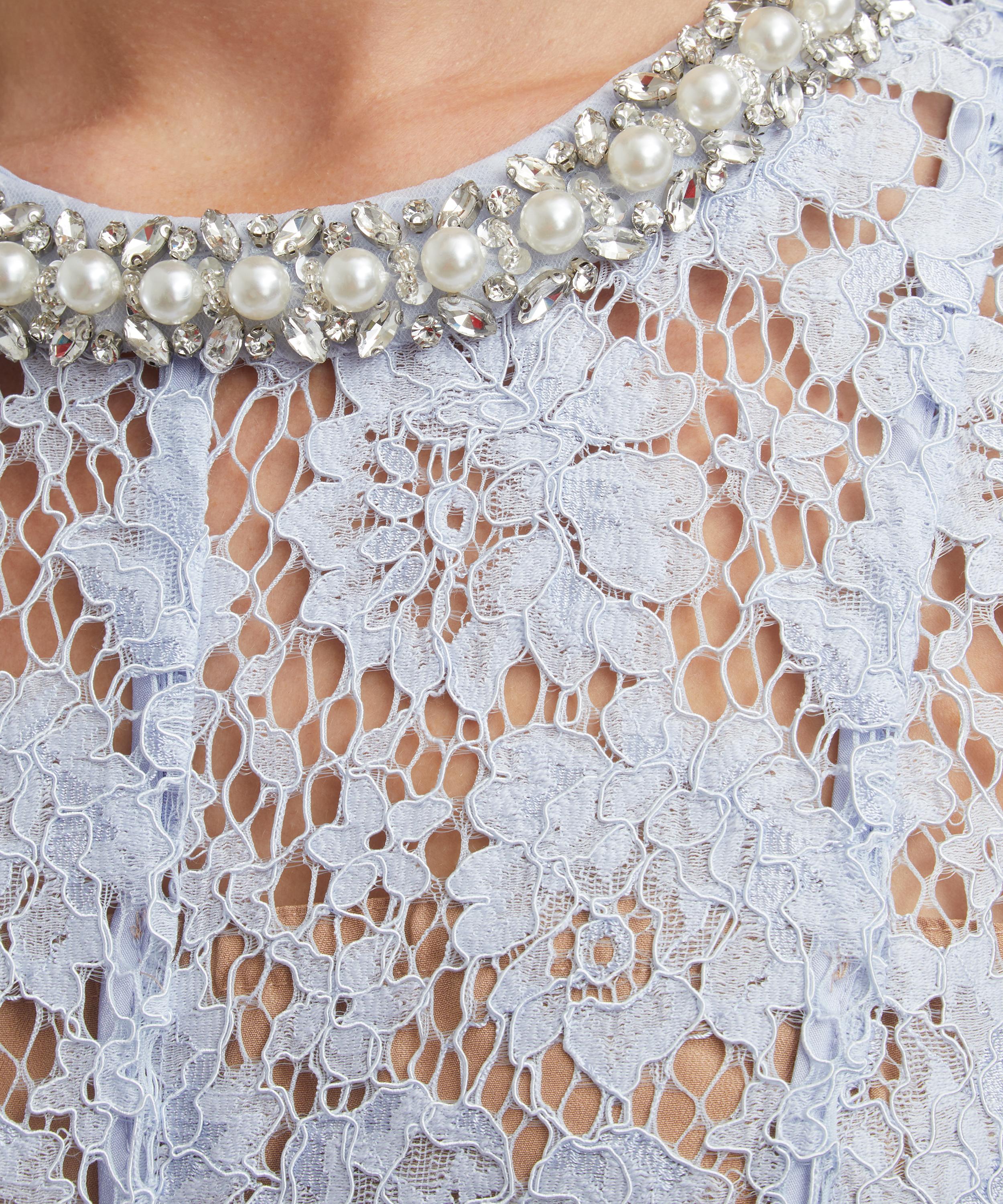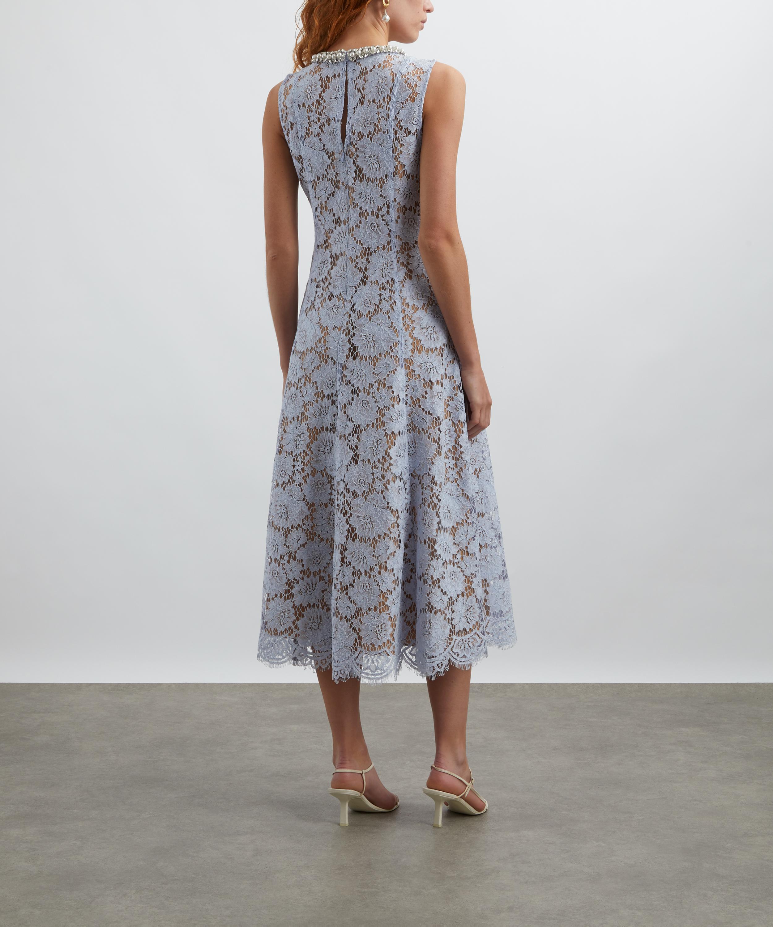 With its delicate blue lace construction and flattering flared hem, this flowing midi dress exudes sophistication. The intricate diamanté and pearl embellishment adds an extra touch of glamour, making it the perfect choice for a special occasion or an unforgettable event.
