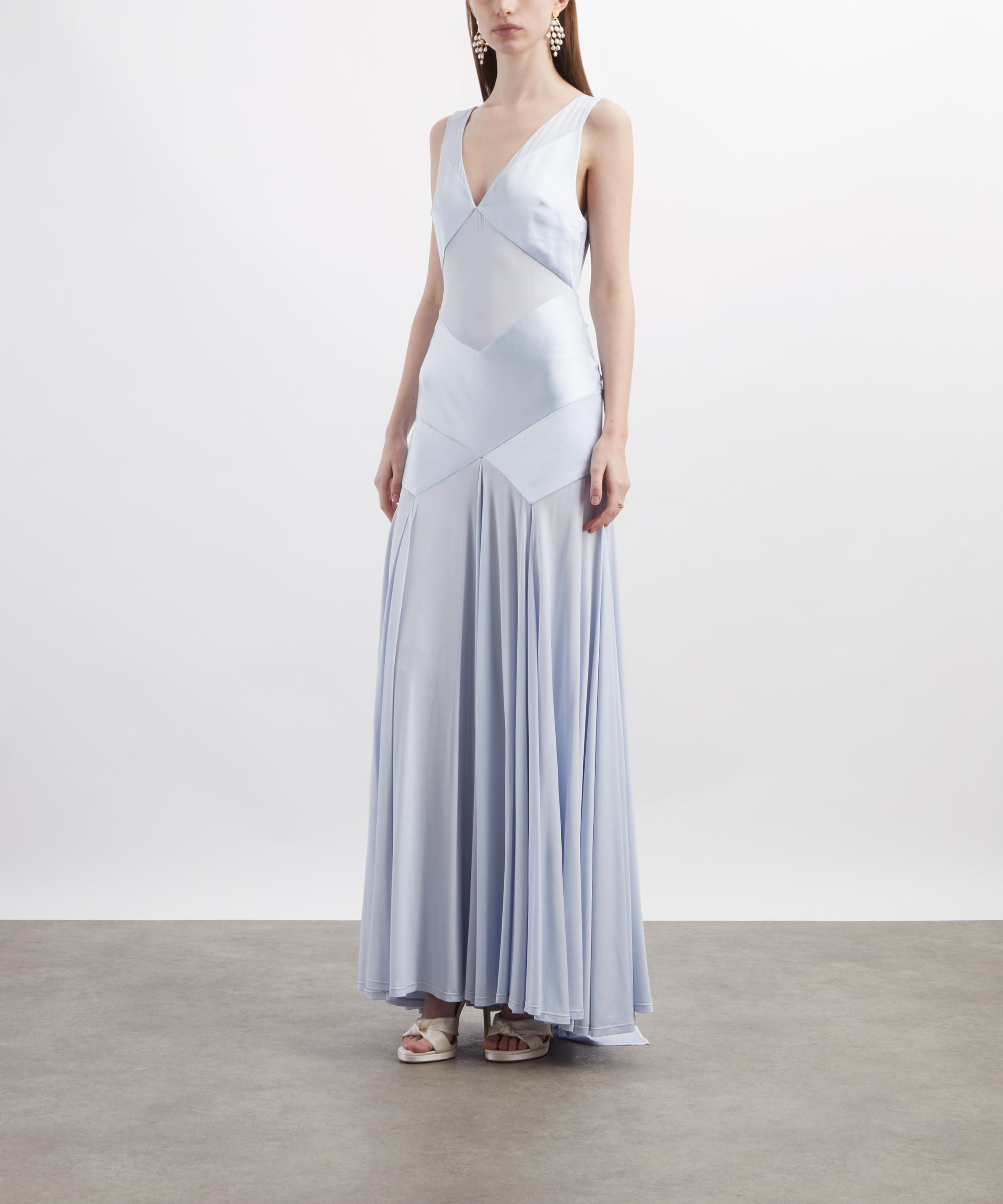 A vision of timeless elegance, this pale blue dress evokes 1920s glamour with a V-cut neckline and back, gathered back detailing, chic satin panelling, and a dropped waist that flows into a floor-grazing mermaid hem.
