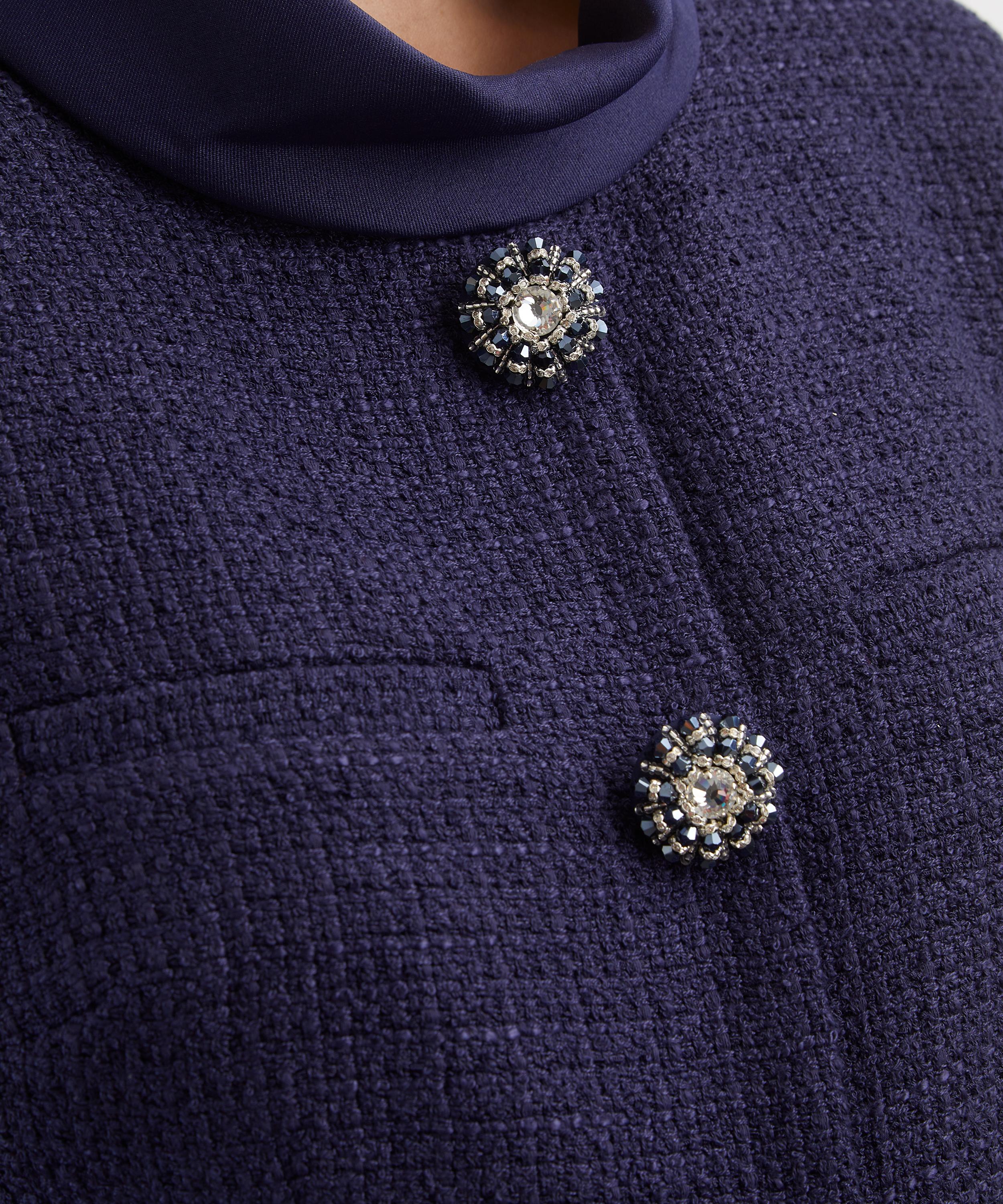 A masterclass in tailoring and silhouette, it features a slim-fit bouclé bodice contrasted with a voluminous taffeta skirt. Diamanté statement buttons trace the front for a touch of sparkle, while a concealed zip fastens the reverse. Pair with glittering heels to echo the dress’s luminous detailing.