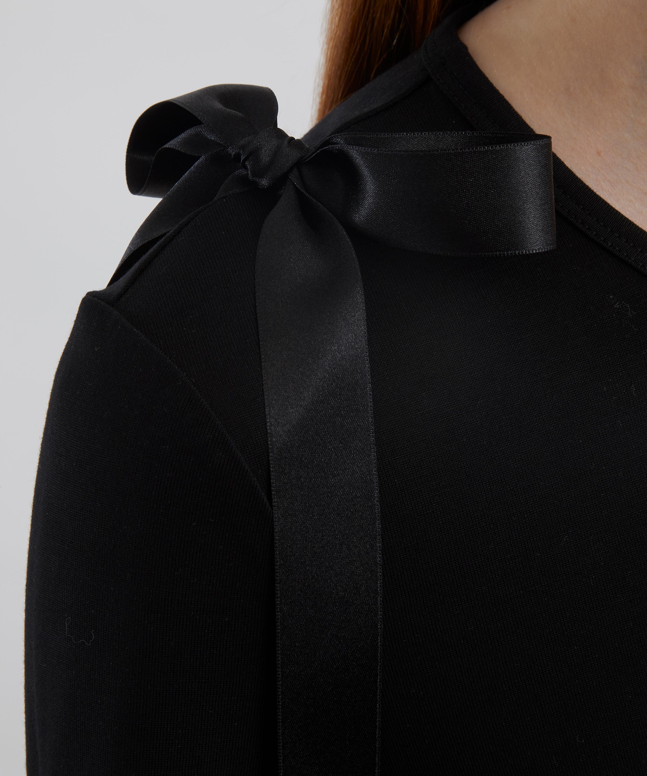 Crafted from lightweight jersey, this black long-sleeve top is accented with decorative bow ribbons at the shoulders, adding a soft, draped touch of romantic elegance.