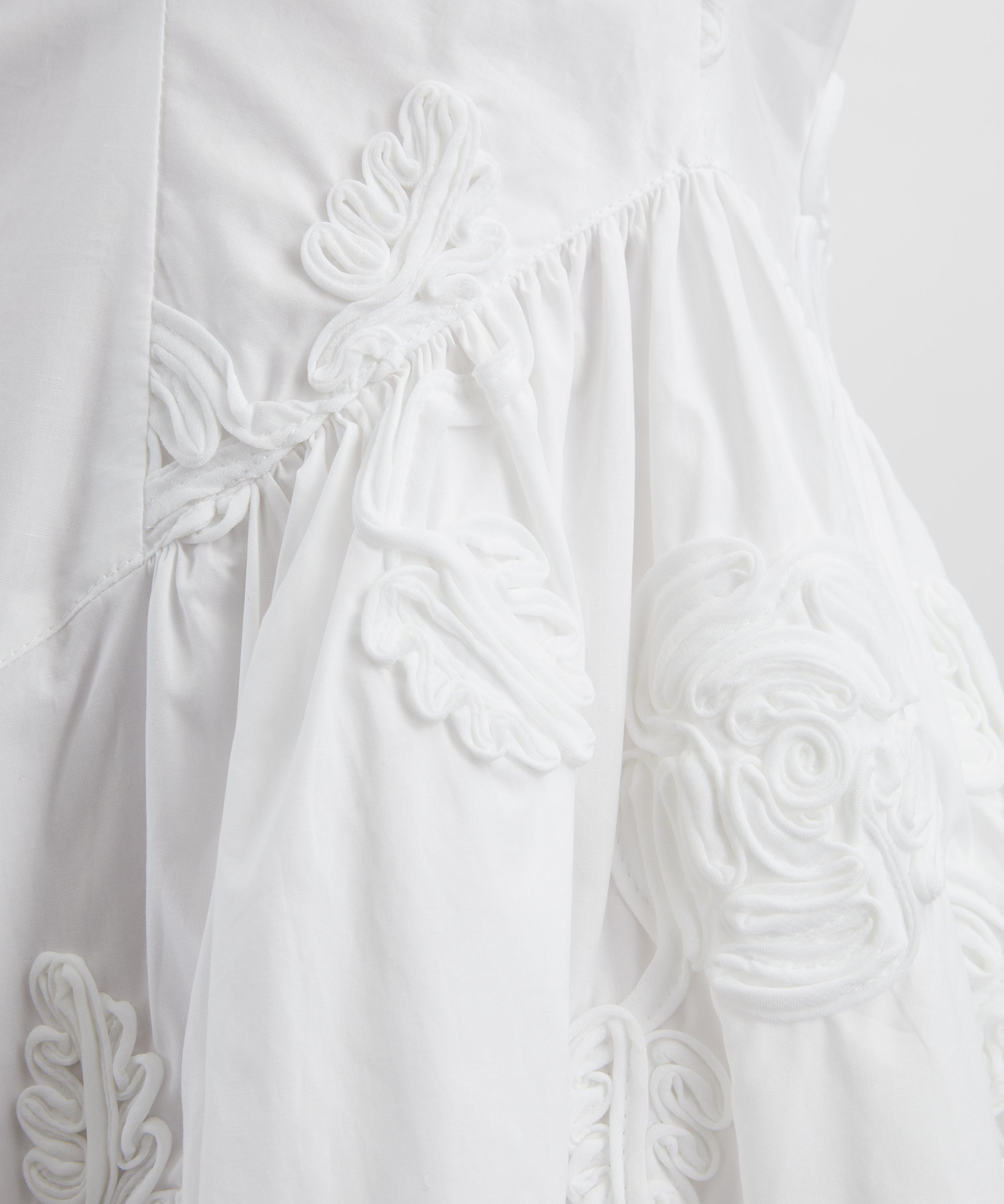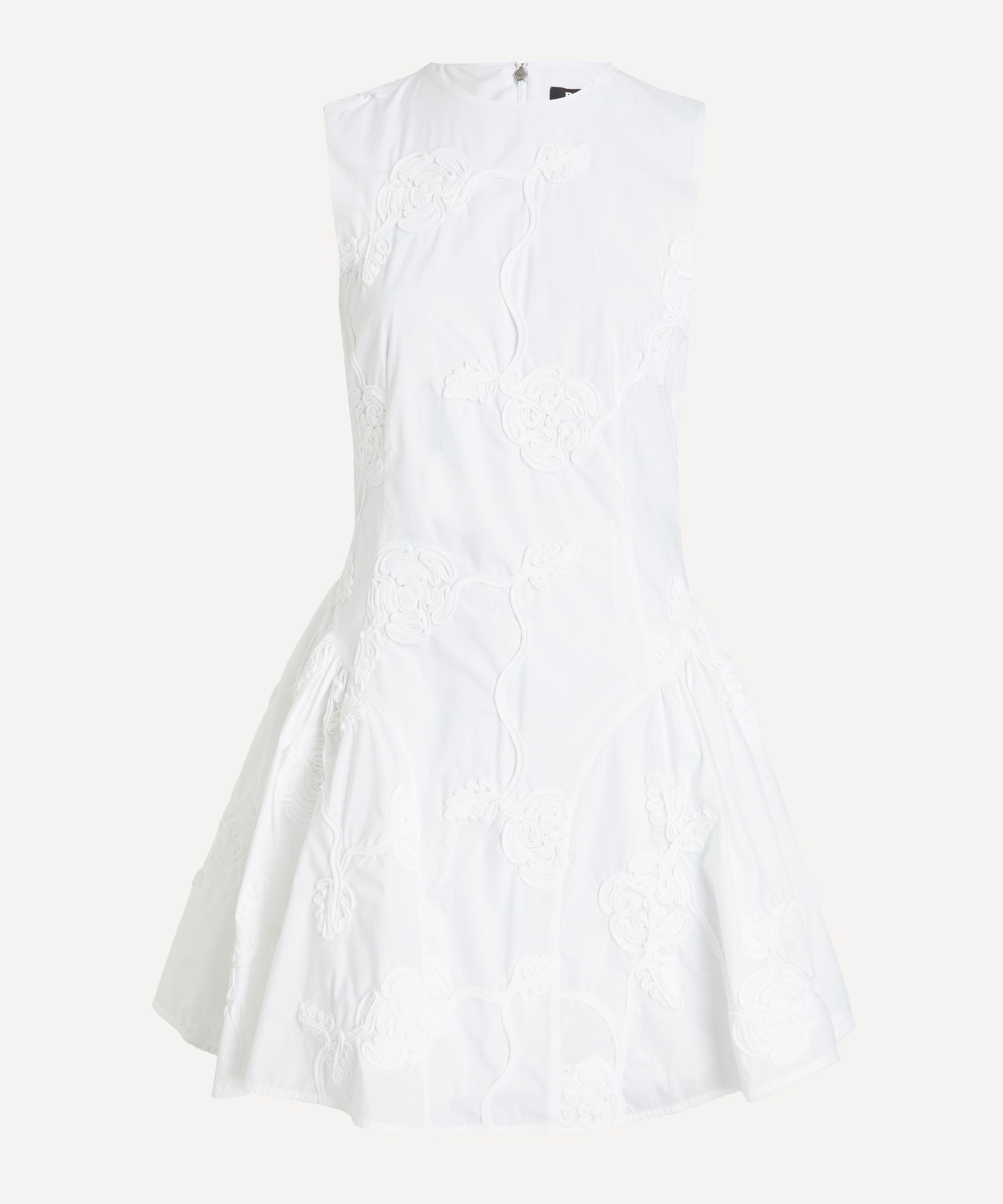 Adorned with tonal floral embroidery throughout, this cotton poplin mini dress features a sleeveless, fitted silhouette with a round neckline and a dropped waist that flares into a playful mini skirt.
