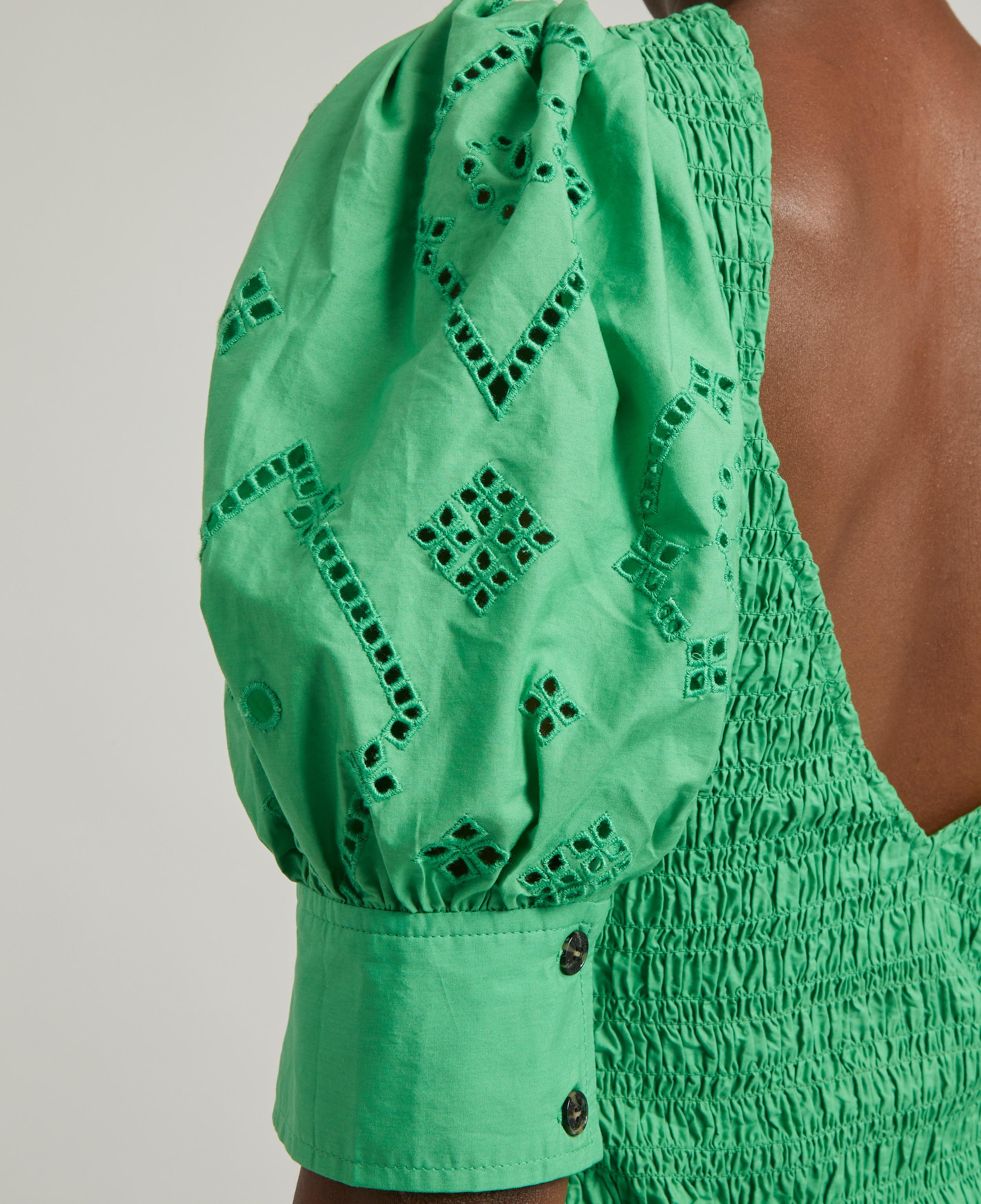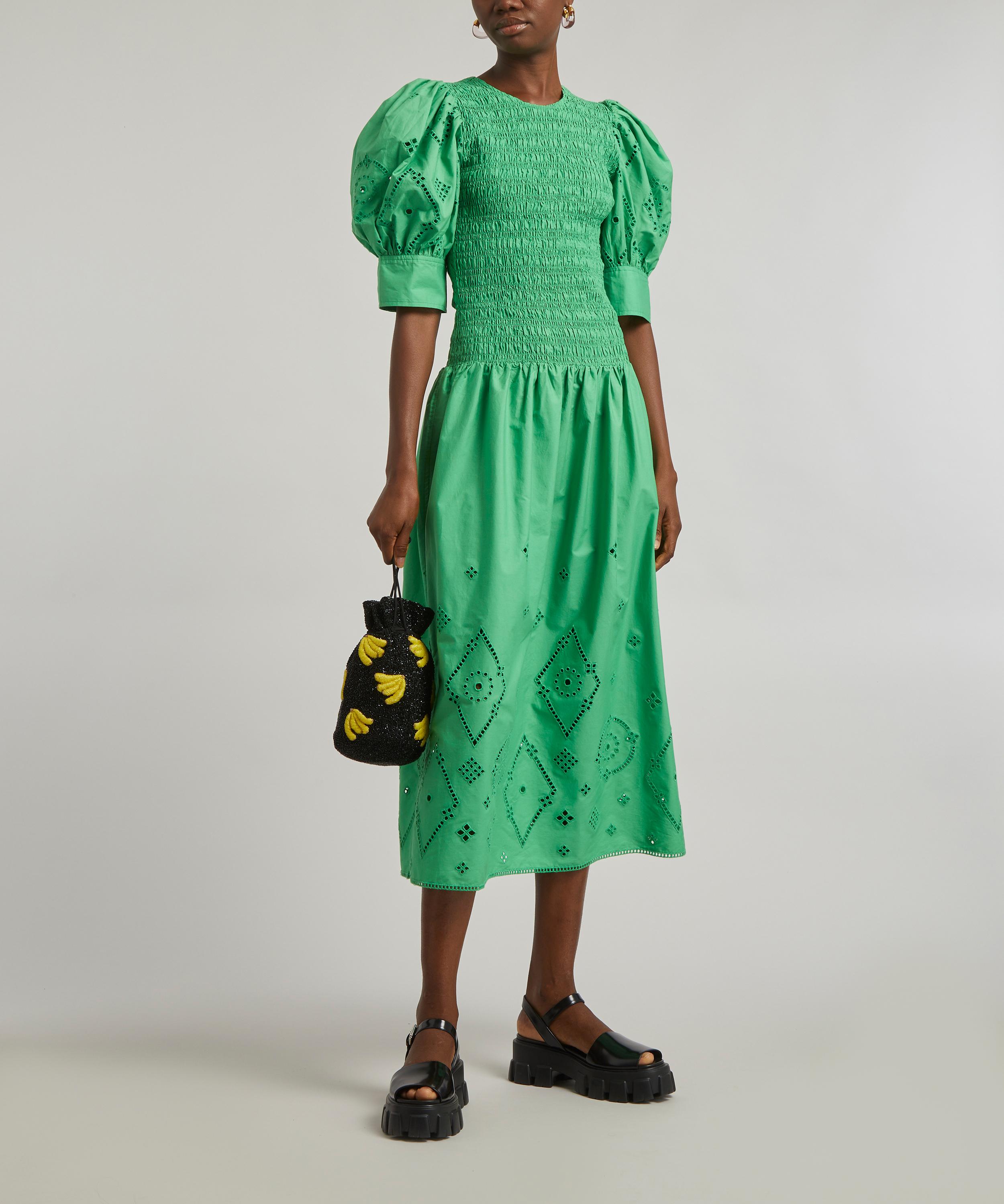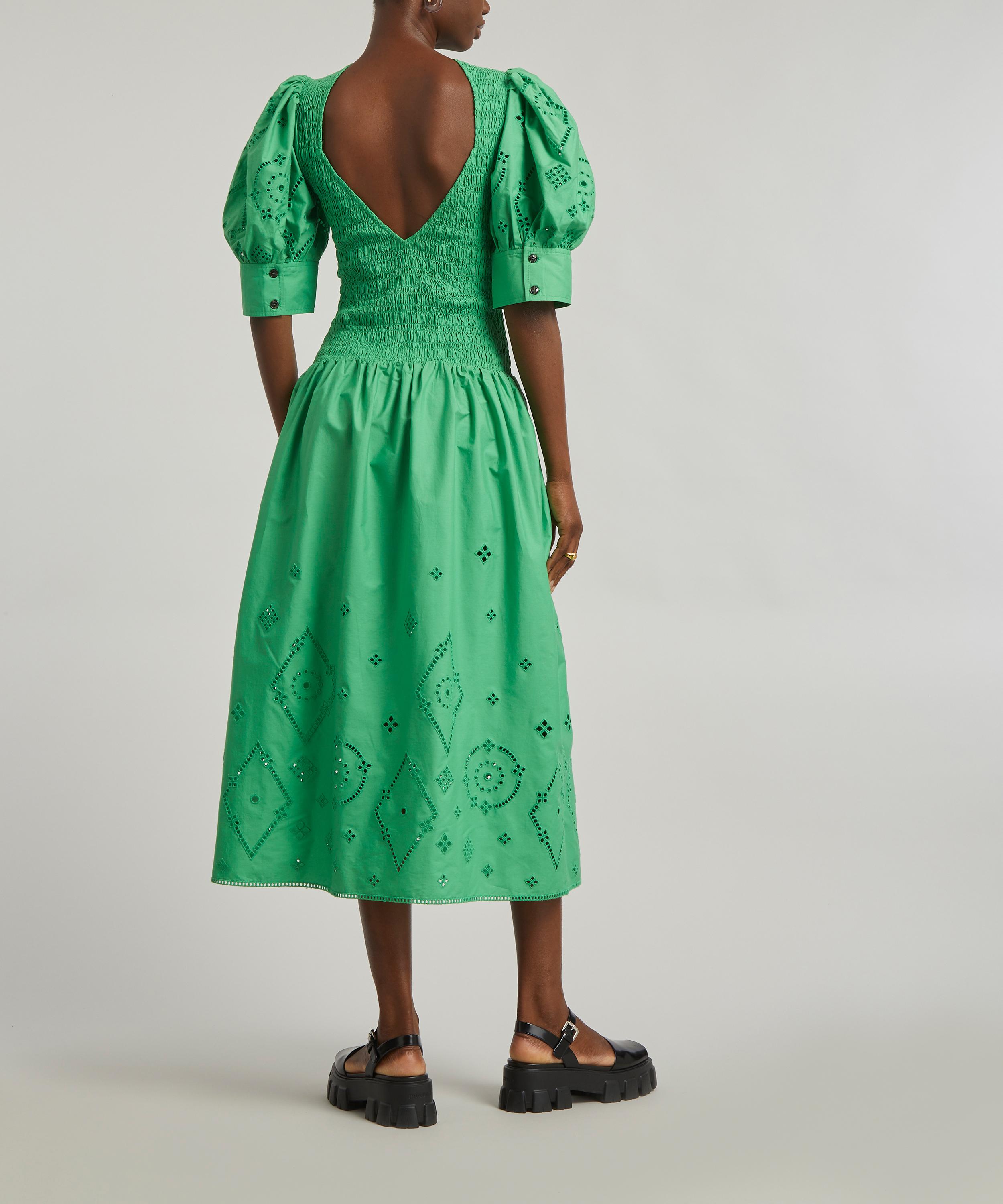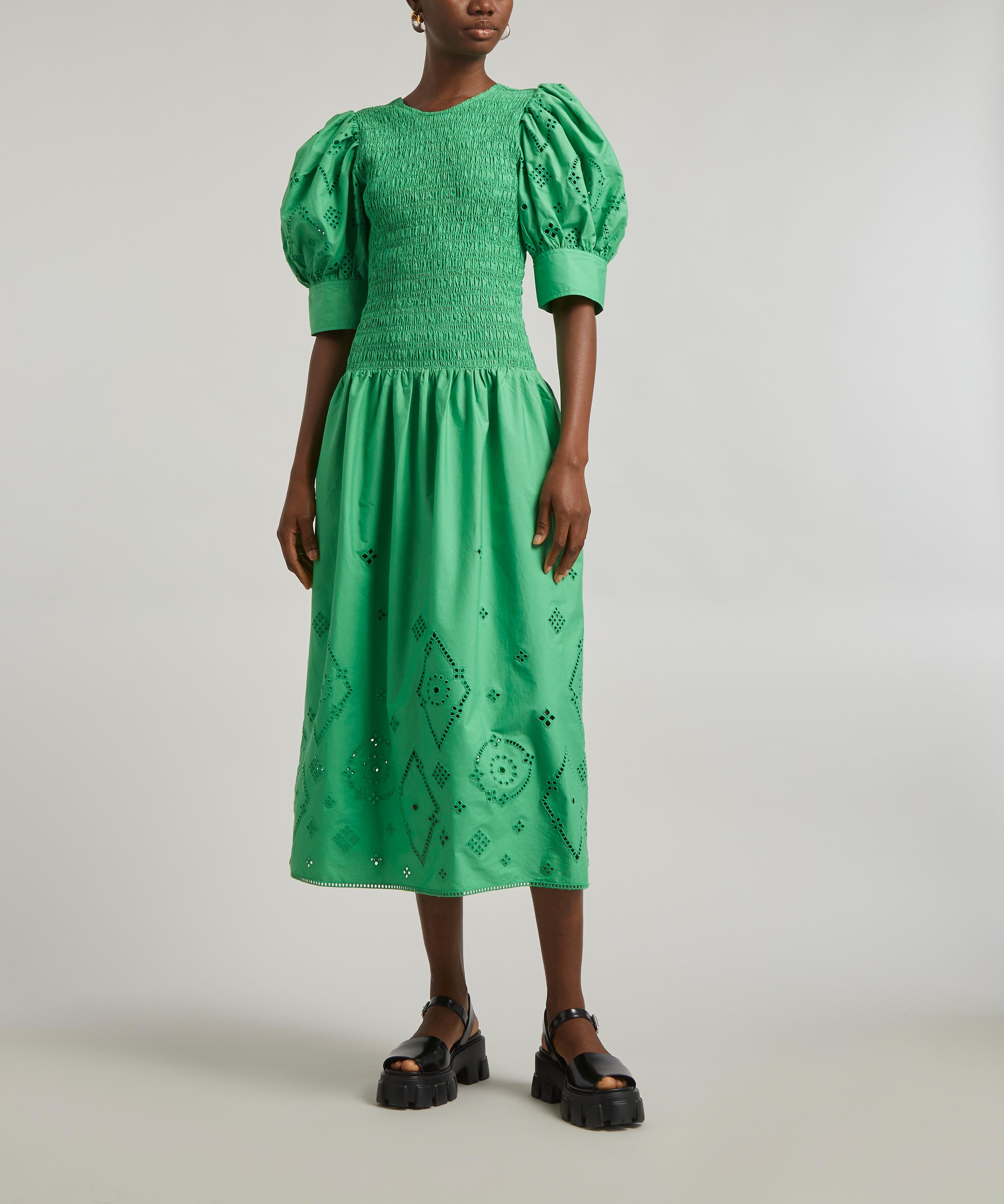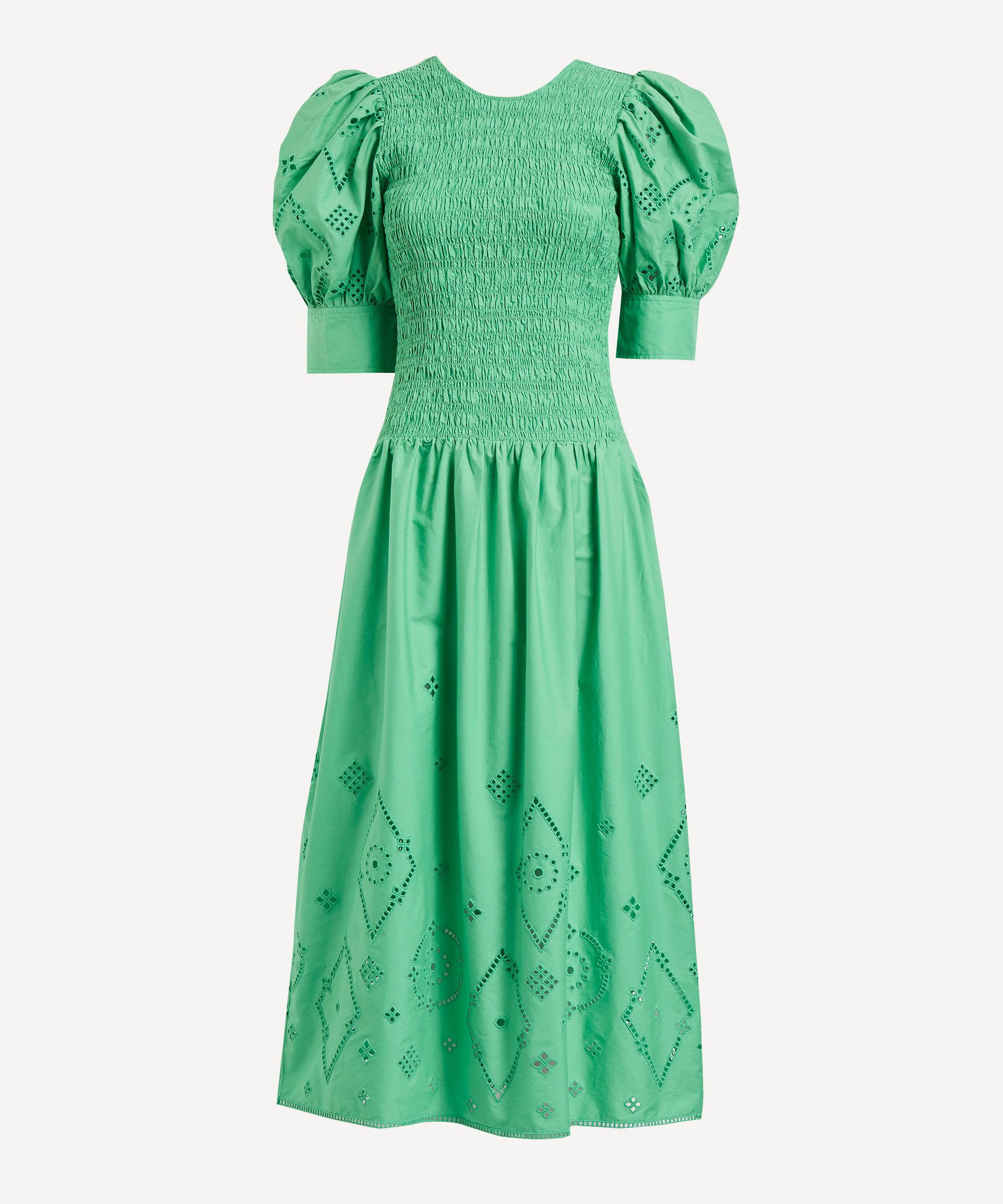 Putting a playful twist on traditional prairie styles, this Broderie Anglaise midi-dress is from cool girl Scandinavian label, Ganni. Crafted from lightweight organic cotton and finished with delicate broodier anglaise detailing throughout, this effortlessly twee dress exudes elegance with its puffed sleeves, shirred bodice and low back.