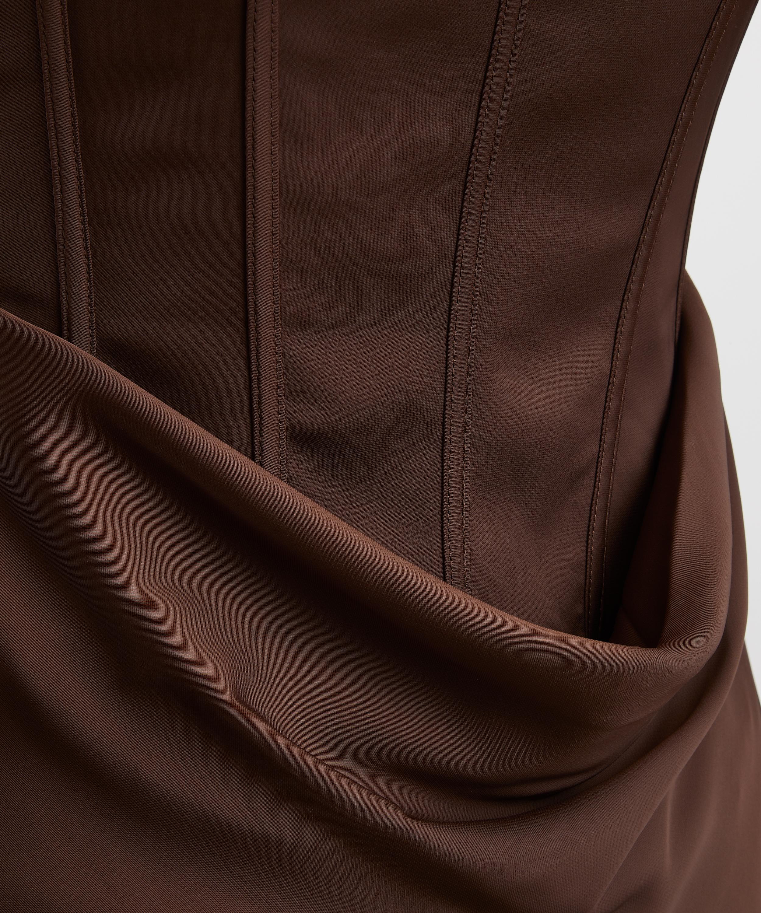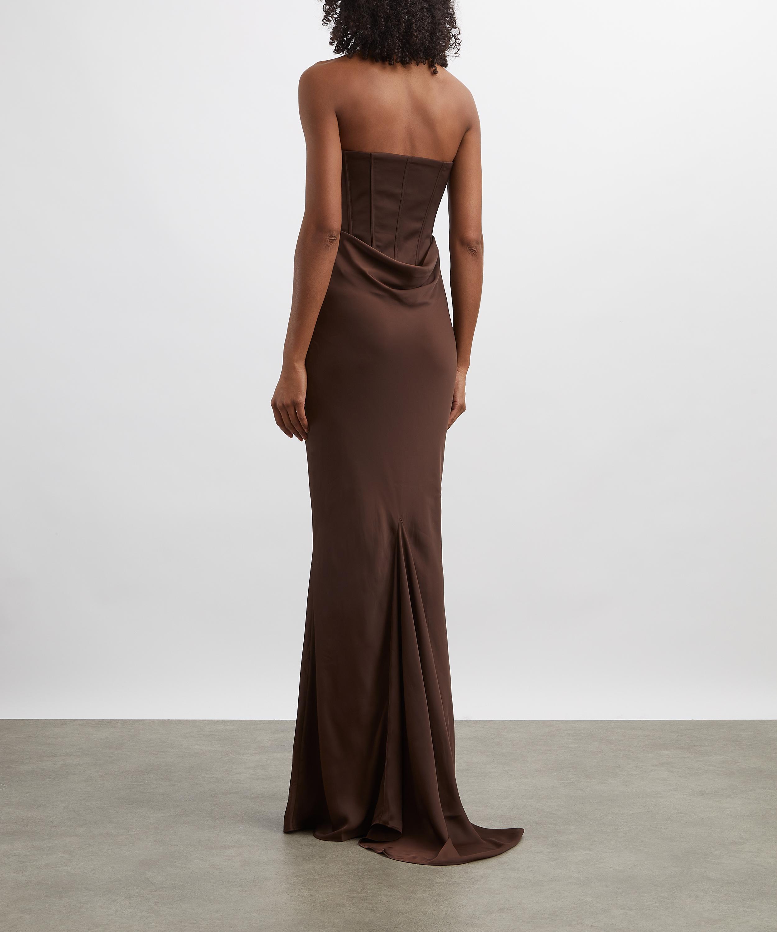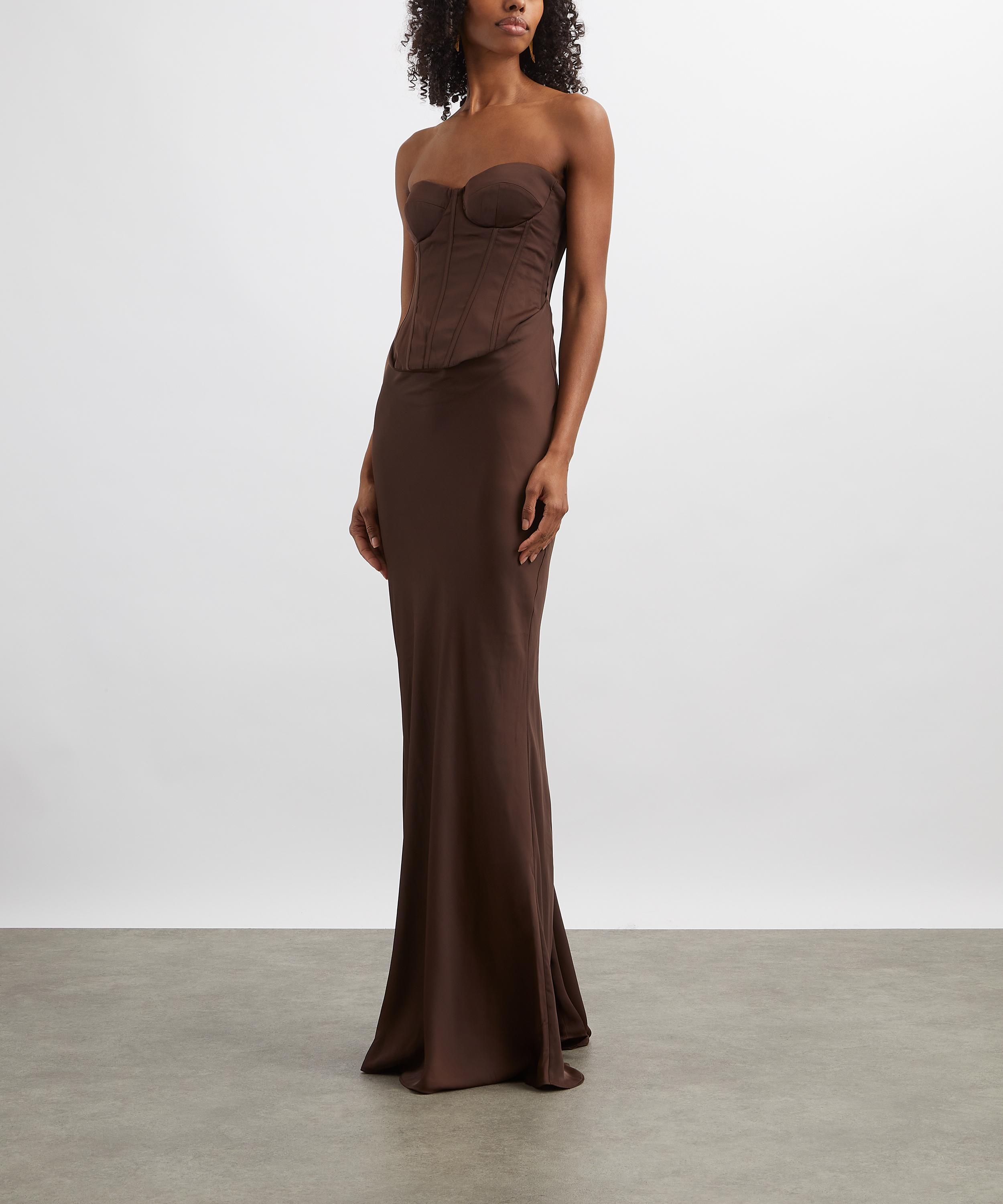 The Brown Satin Corset Maxi Dress from ROTATE Birger Christensen brings a bold dose of Copenhagen cool to your evening wardrobe.