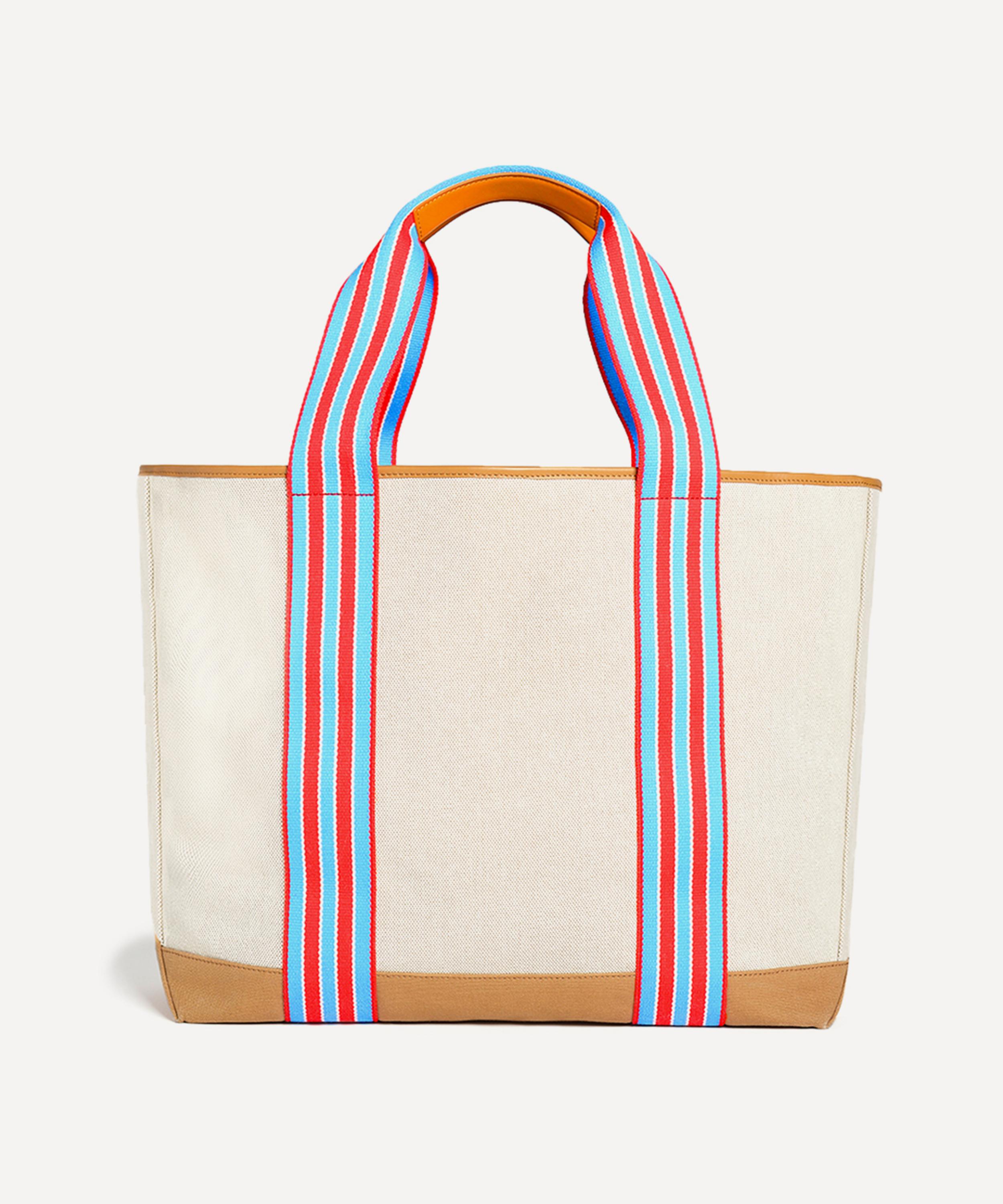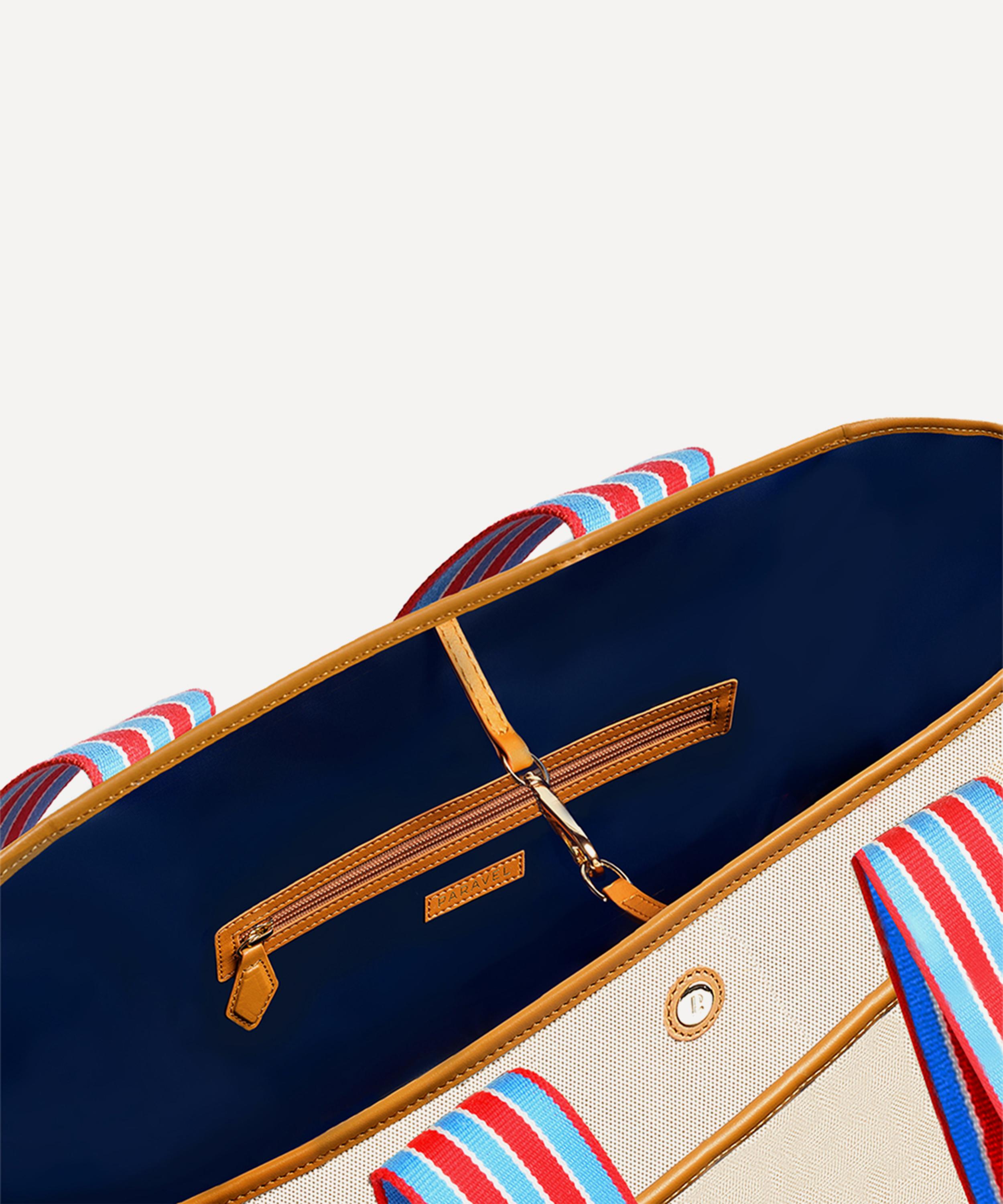 A timeless style crafted from long-lasting, innovative recycled and eco-friendly materials, the Cabana tote bag boasts recycled vegan leather details and an Ecocraft canvas exterior made from 30 upcycled plastic bottles. Elegant and extraordinarily functional, this water-resistant and ultra-lightweight carry-all features an easy access front pocket, interior slip and zipped pockets with a hook-and-eye top closure. Featuring a sturdy leather base with matching tan trims, it's complete with statement, blue and red ‘Paloma’ striped handles. Cradle this piece over the shoulder or carry it in one hand for effortlessly sophisticated style no matter where your travels take you.