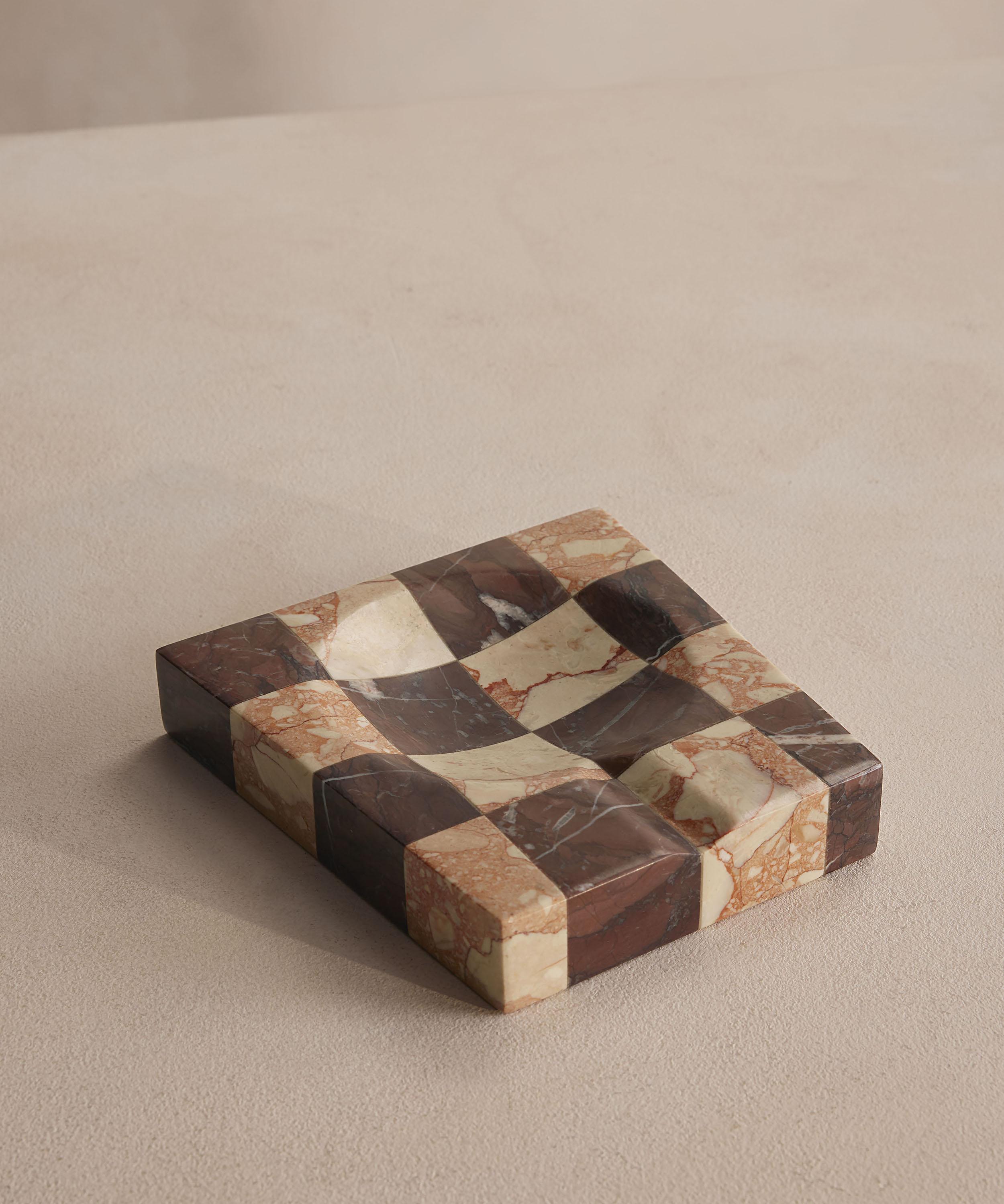 This elegant ashtray is crafted from tonal pieces of solid Rosso Levanto and Breccia Pernice marble create a chequerboard pattern. Ideal for elevating your dressing table or mantlepiece alike with its strikingly sleek design and tonal variations.