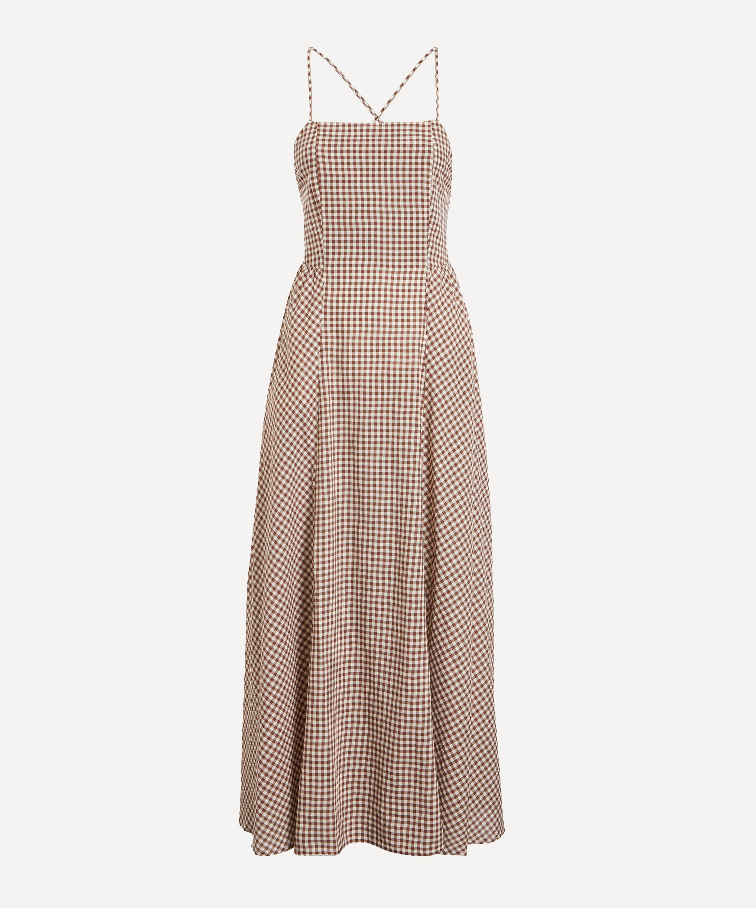 Cut from lightweight cotton in a charming brown and cream gingham, the Callie dress exudes effortless femininity with its graceful square neckline, fitted bodice, and flowing full skirt. An open back with adjustable crossover straps adds a playful touch to its elegant silhouette.