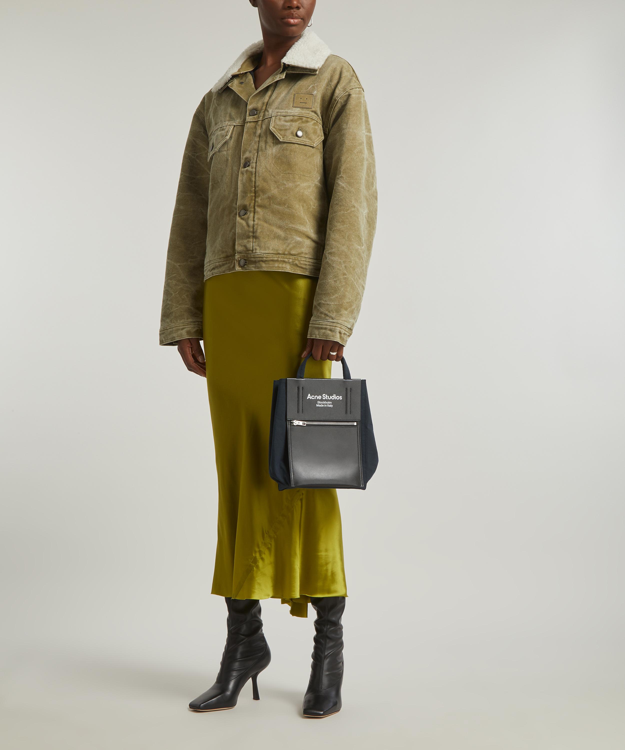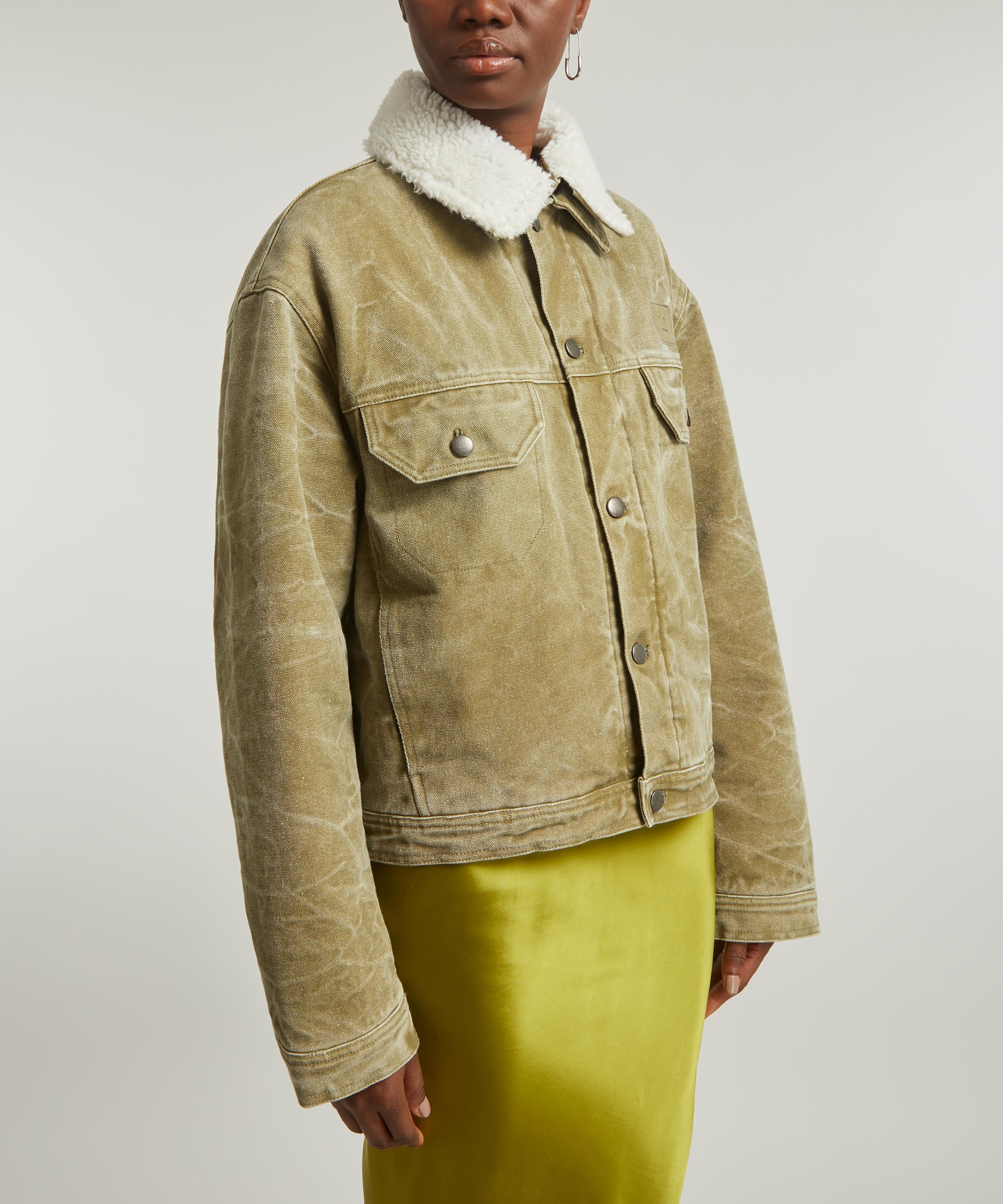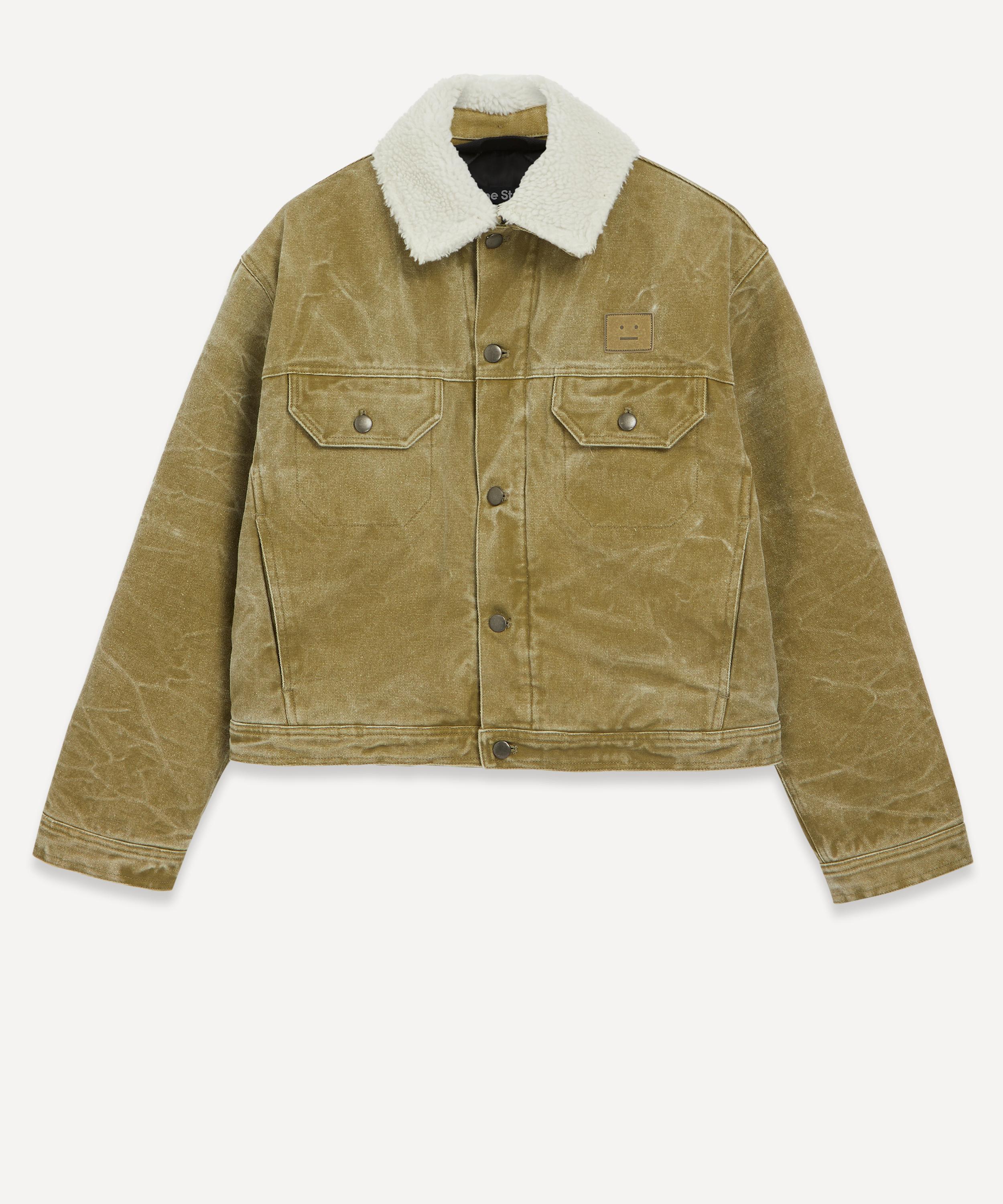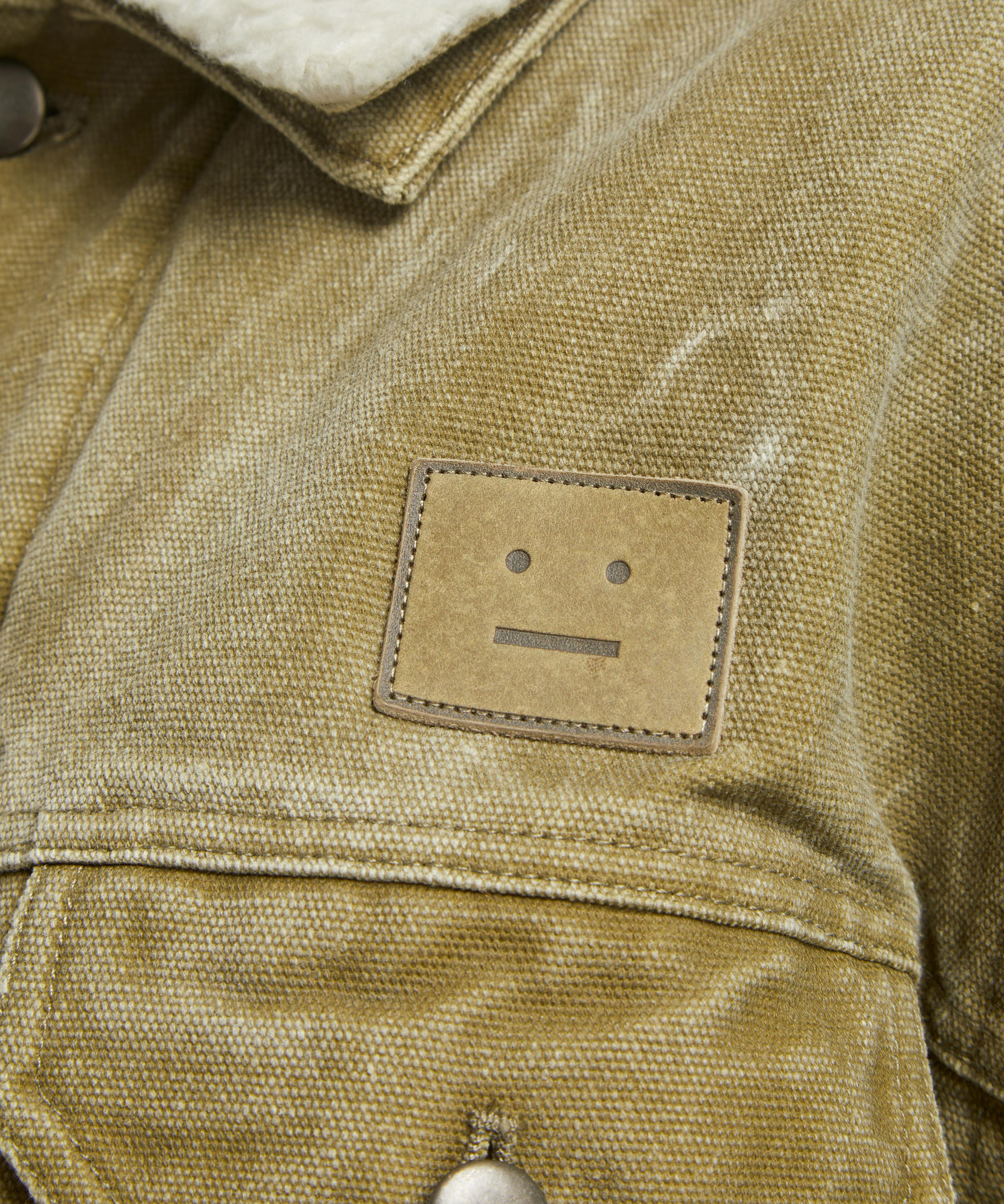 Super-snug with its detachable shearling collar, this khaki-beige jacket is crafted from sturdy canvas cotton with a mottled, pigment-dyed finish. Complete with a stud-button closure and two flap pockets, its chest is detailed with a signature leather face logo patch on the front.