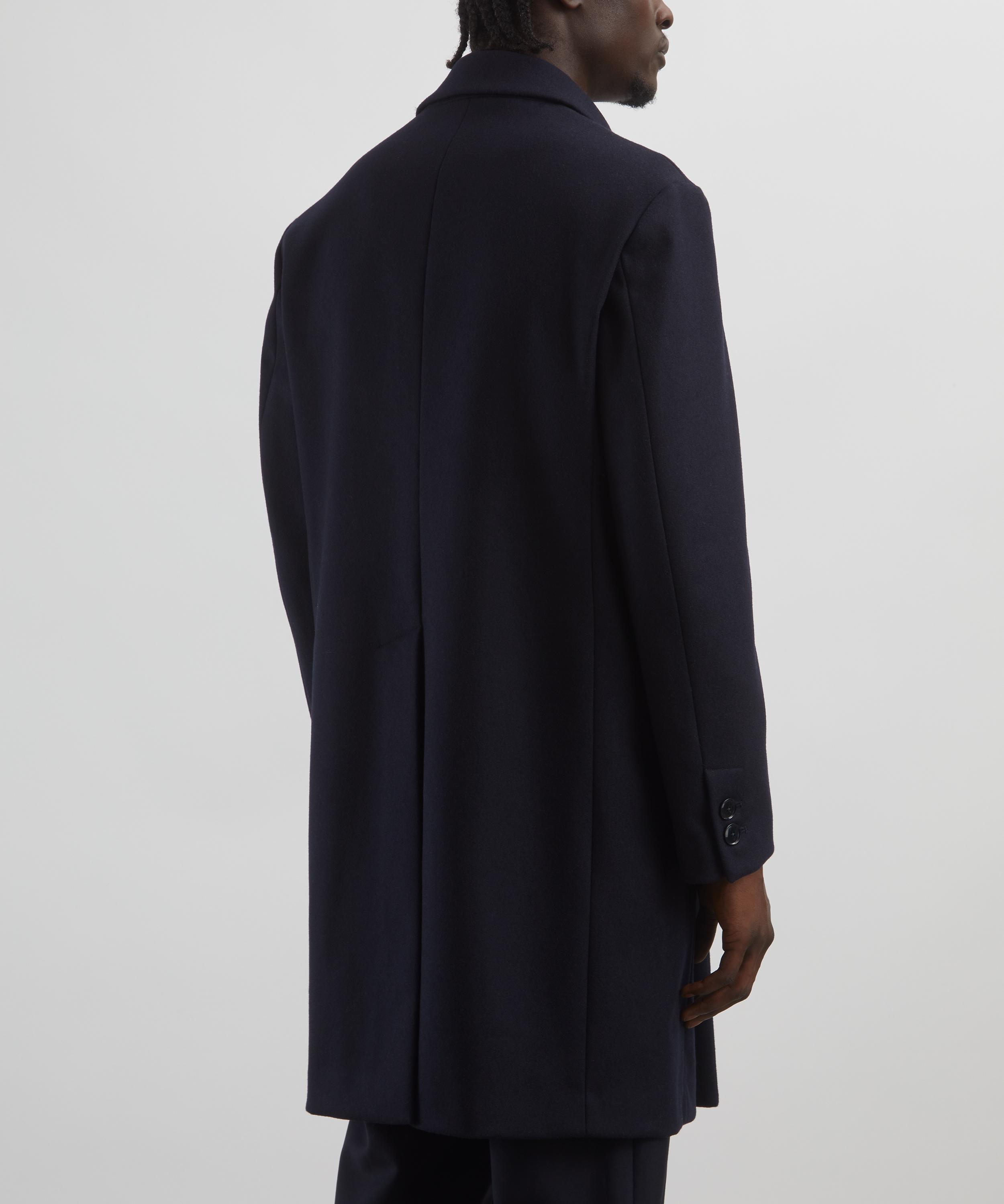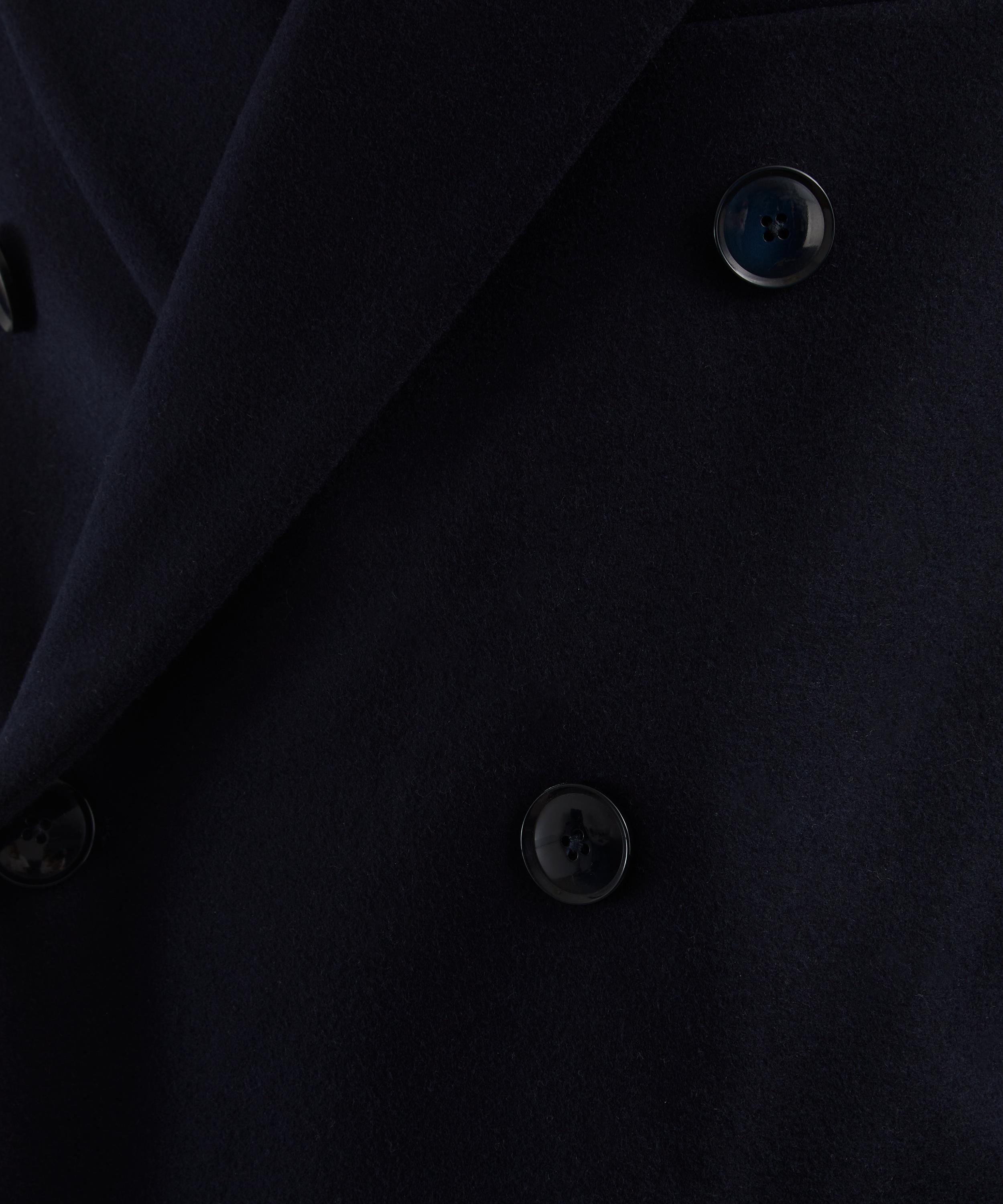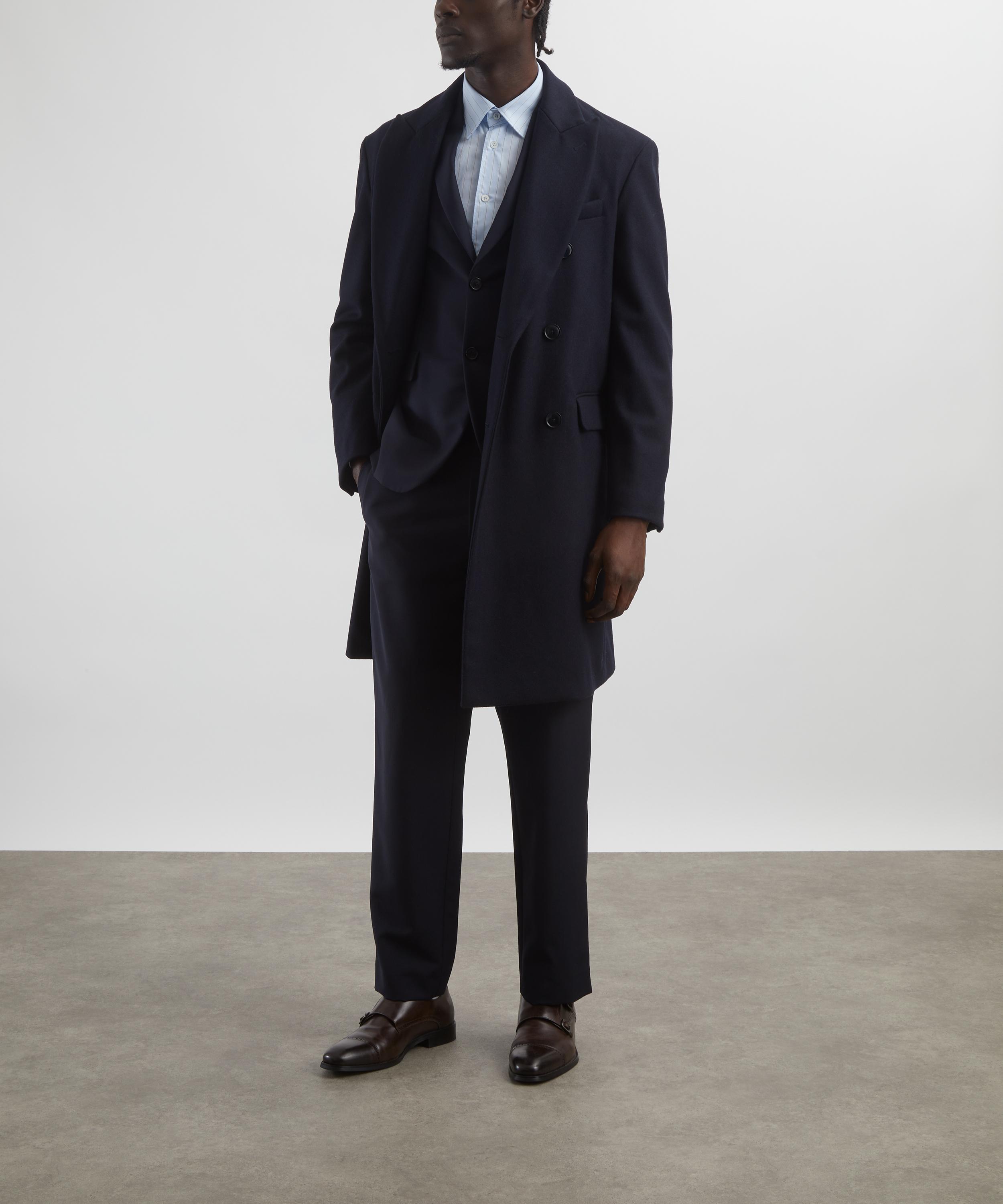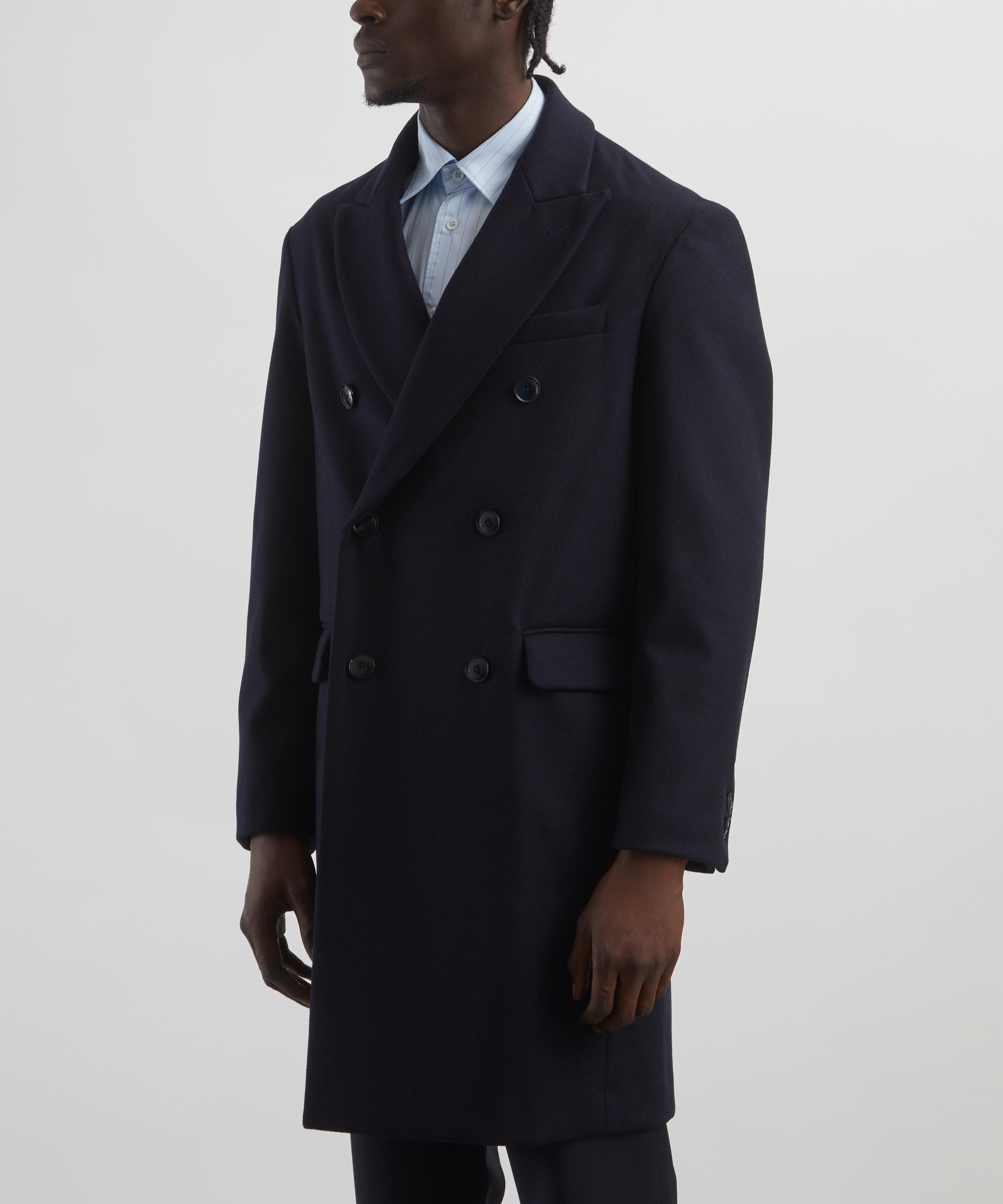 Made in Italy, this tailored wool-blend coat features a double-breasted silhouette complete with a peak lapel, two flap pockets, and a single welt pocket to the chest.