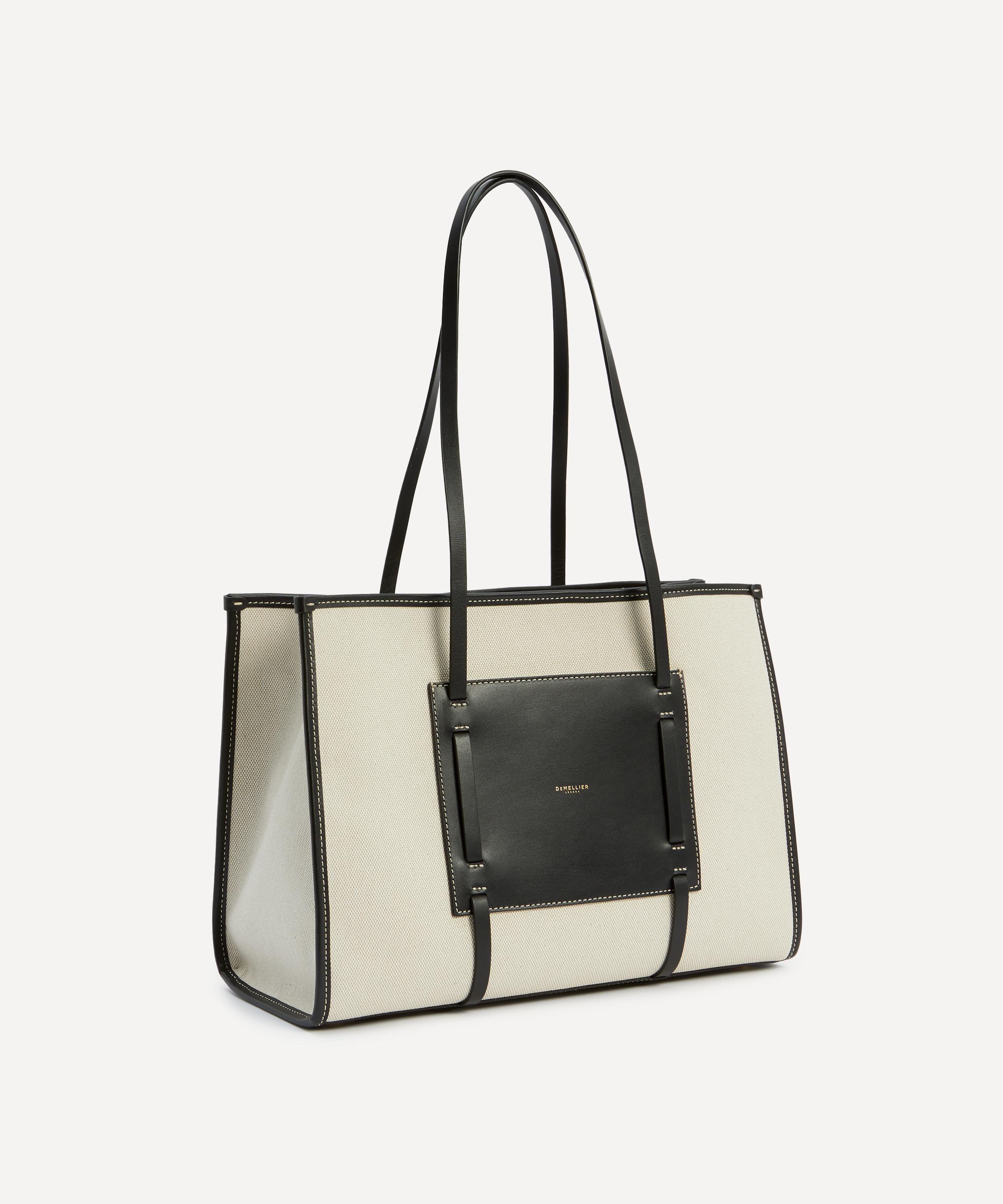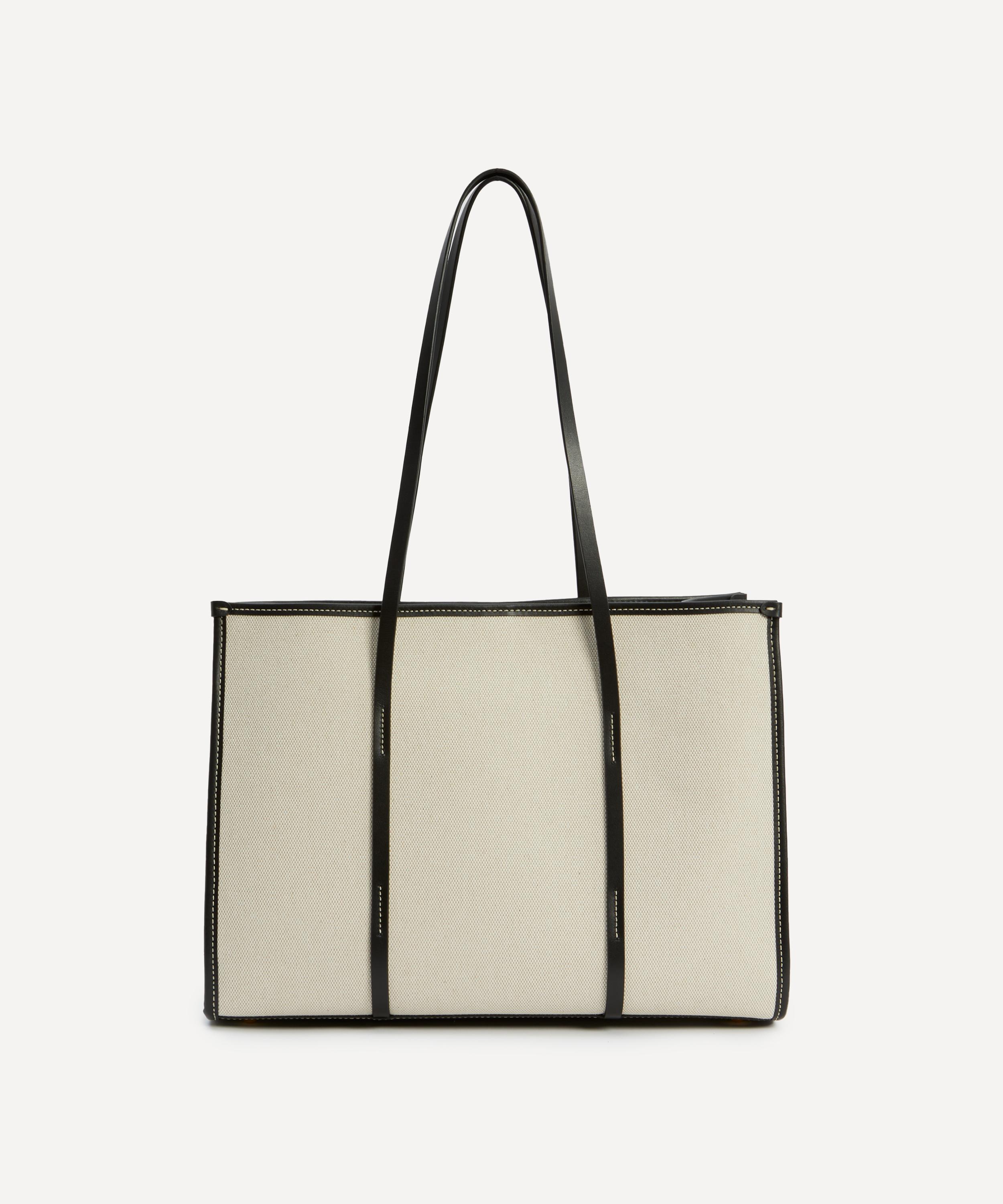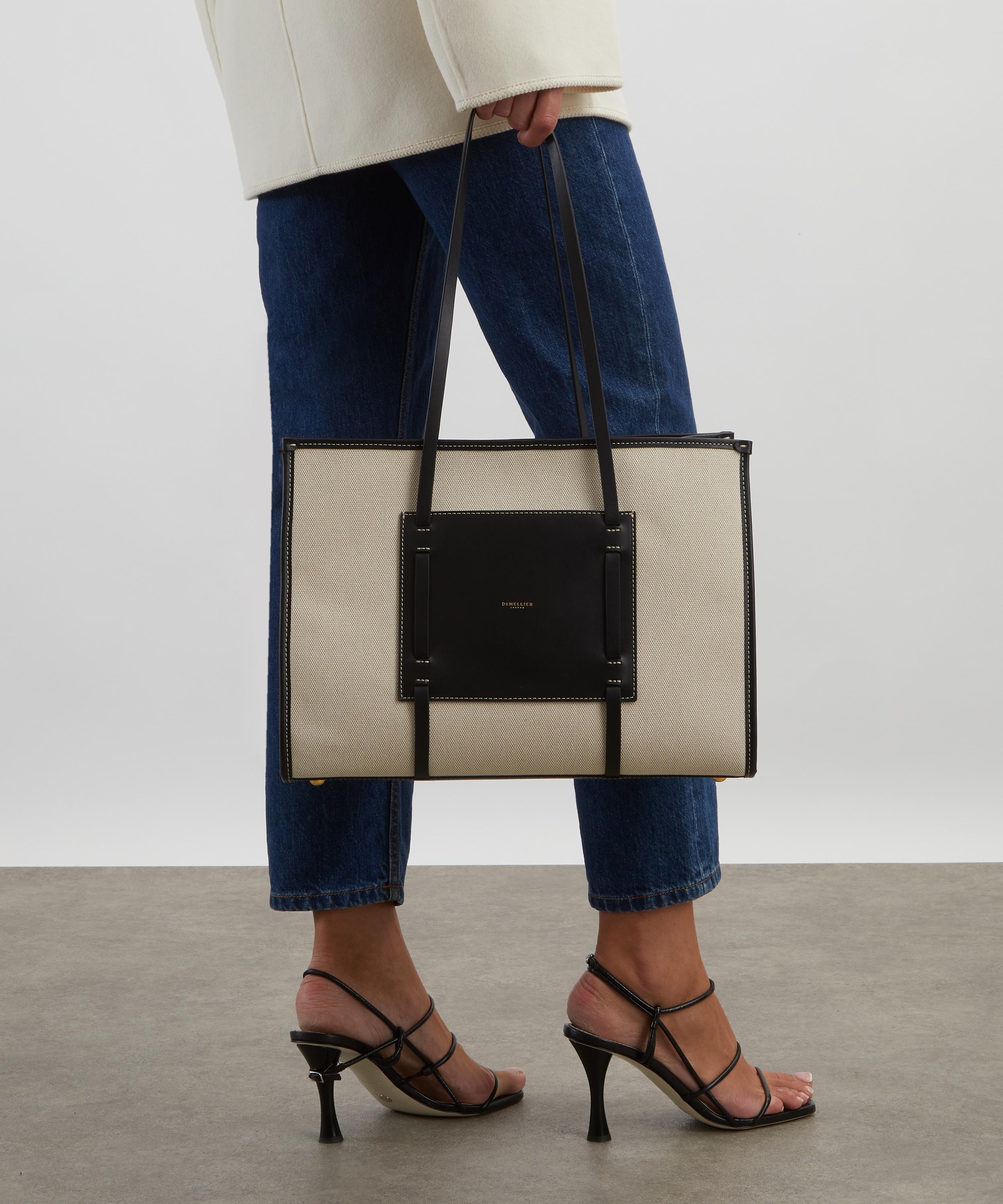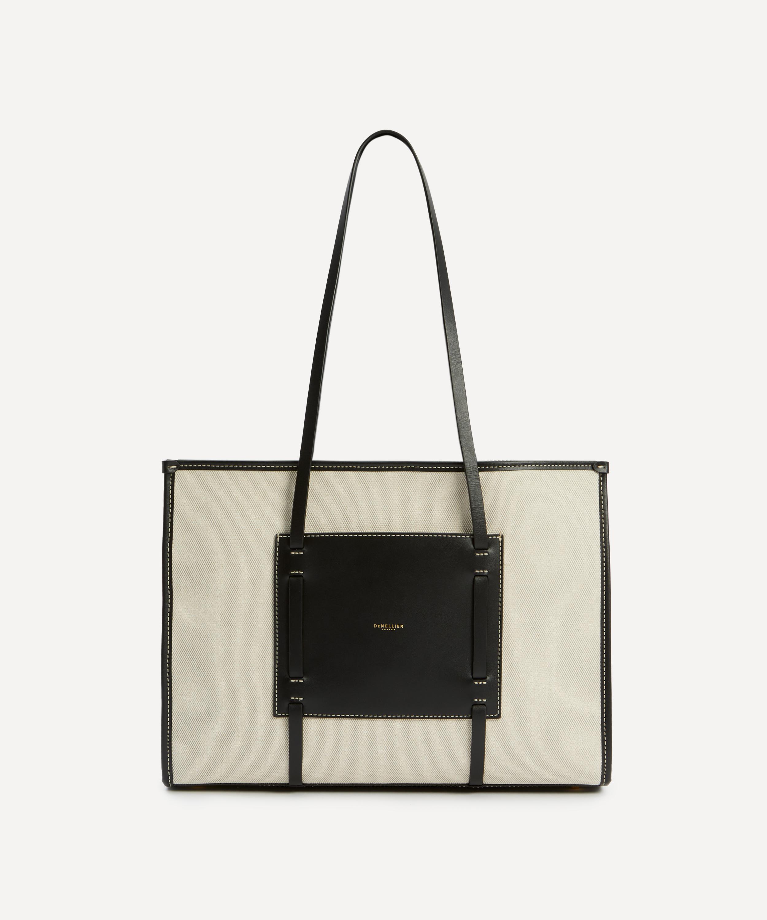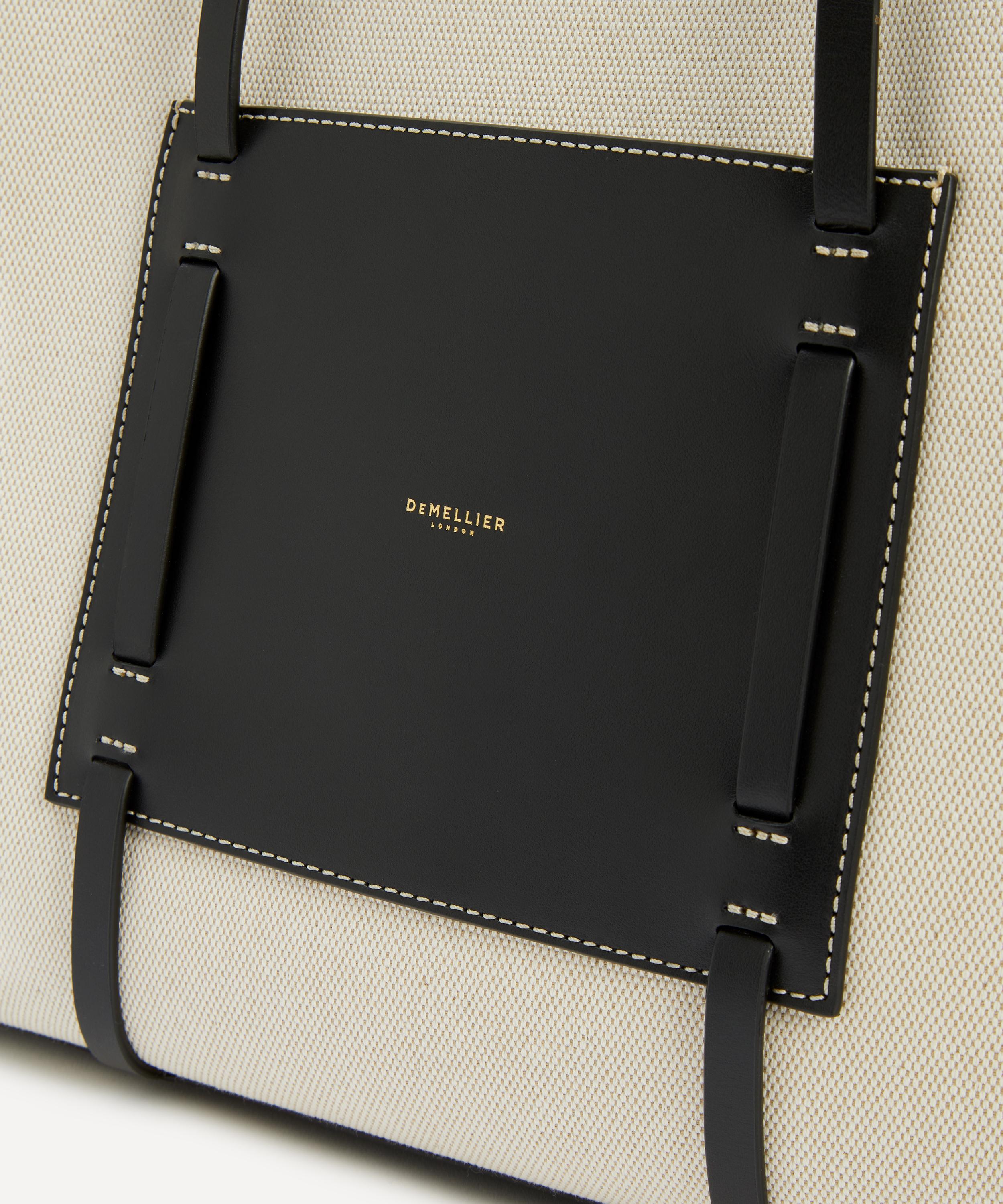 Handcrafted with integrity from cotton canvas, this bag features a boxy silhouette with leather trims and stitching. It’s defined by two top handles, a spacious main compartment and tie fastening at the opening. Complete with a stamped brand logo to the front, wear it with a flowy sundress and open-toe sandals to lean into summer-ready styling.About DeMellier