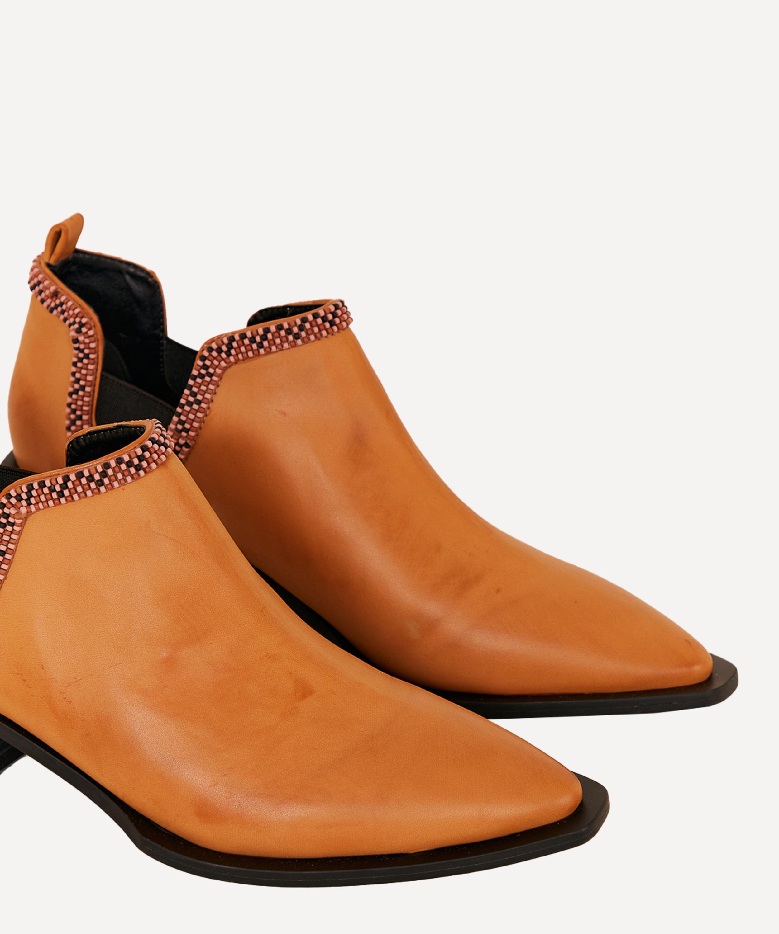 The Caramel low-cut boots from Rio de Janeiro-based label FARM Rio brings some Brazilian vivacity to your new-season edit. Crafted to a low-cut, feminine silhouette adorned with beaded detailing to the collar, this pair feature a classic Cuban heel and pointed toe box.