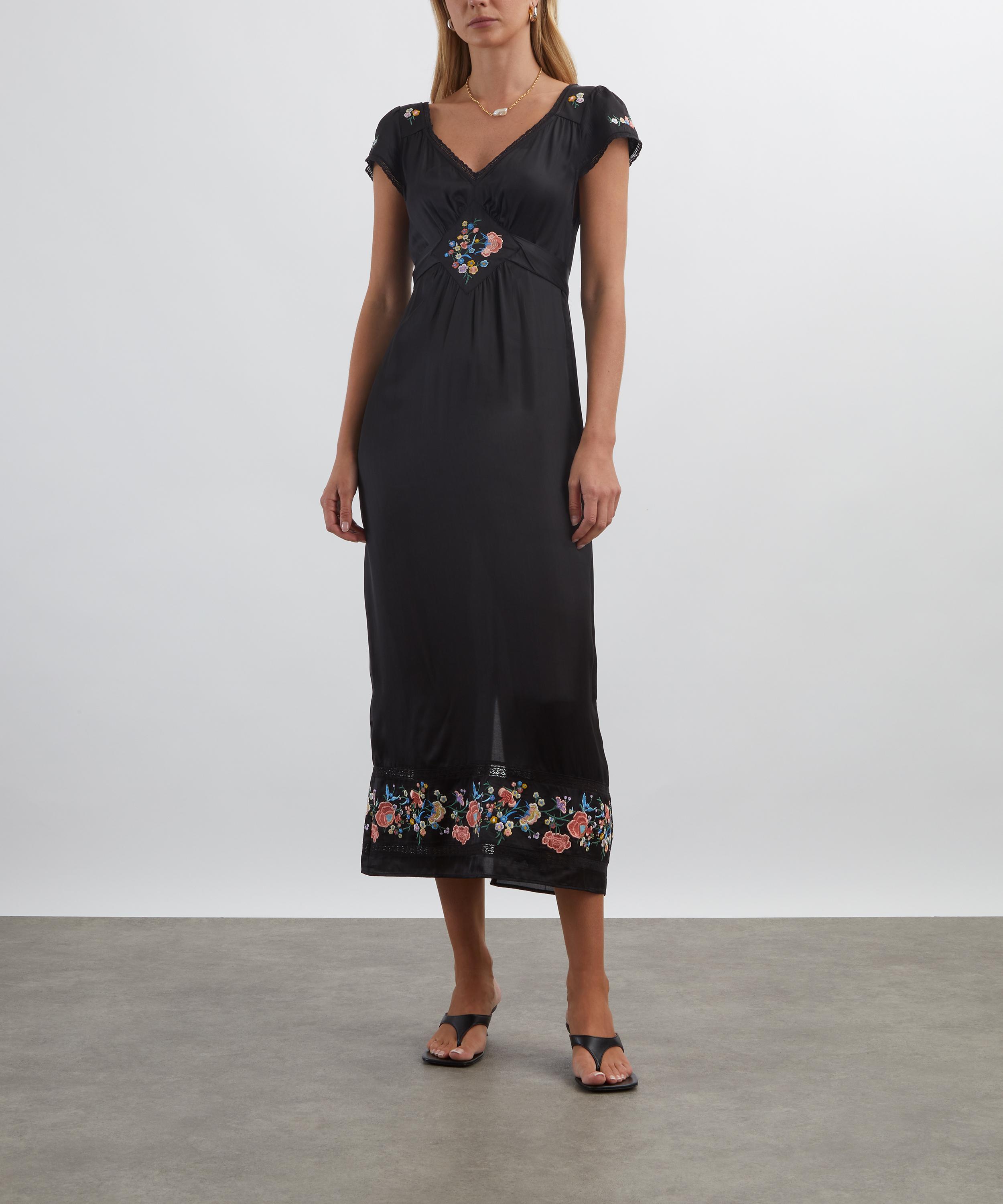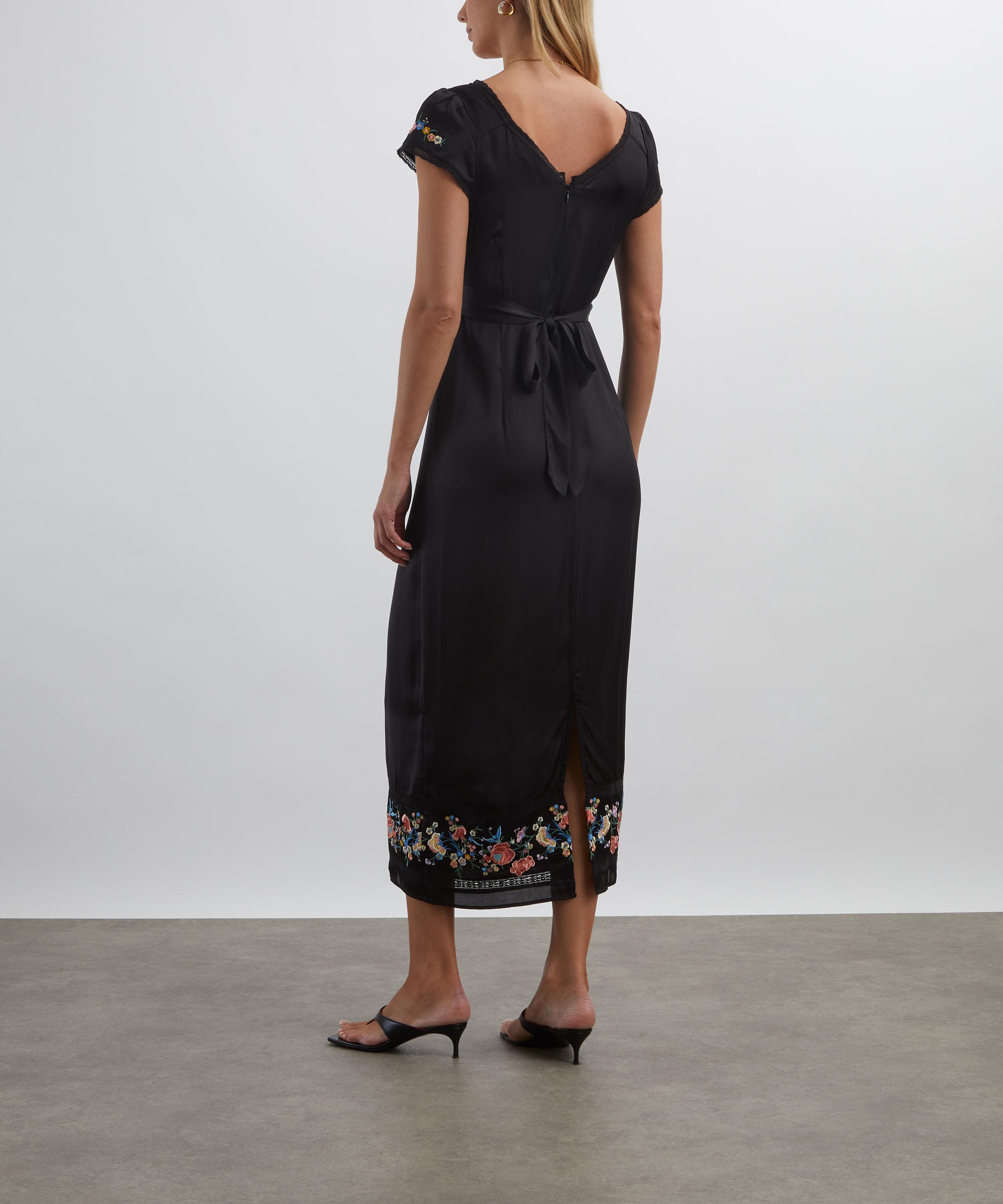 Crafted from sheeny black satin, this midi dress embodies effortless elegance. The classic V-neckline, empire waist, and short sleeves create a graceful silhouette, while intricate floral embroidery and lace trims add a romantic, bohemian touch.