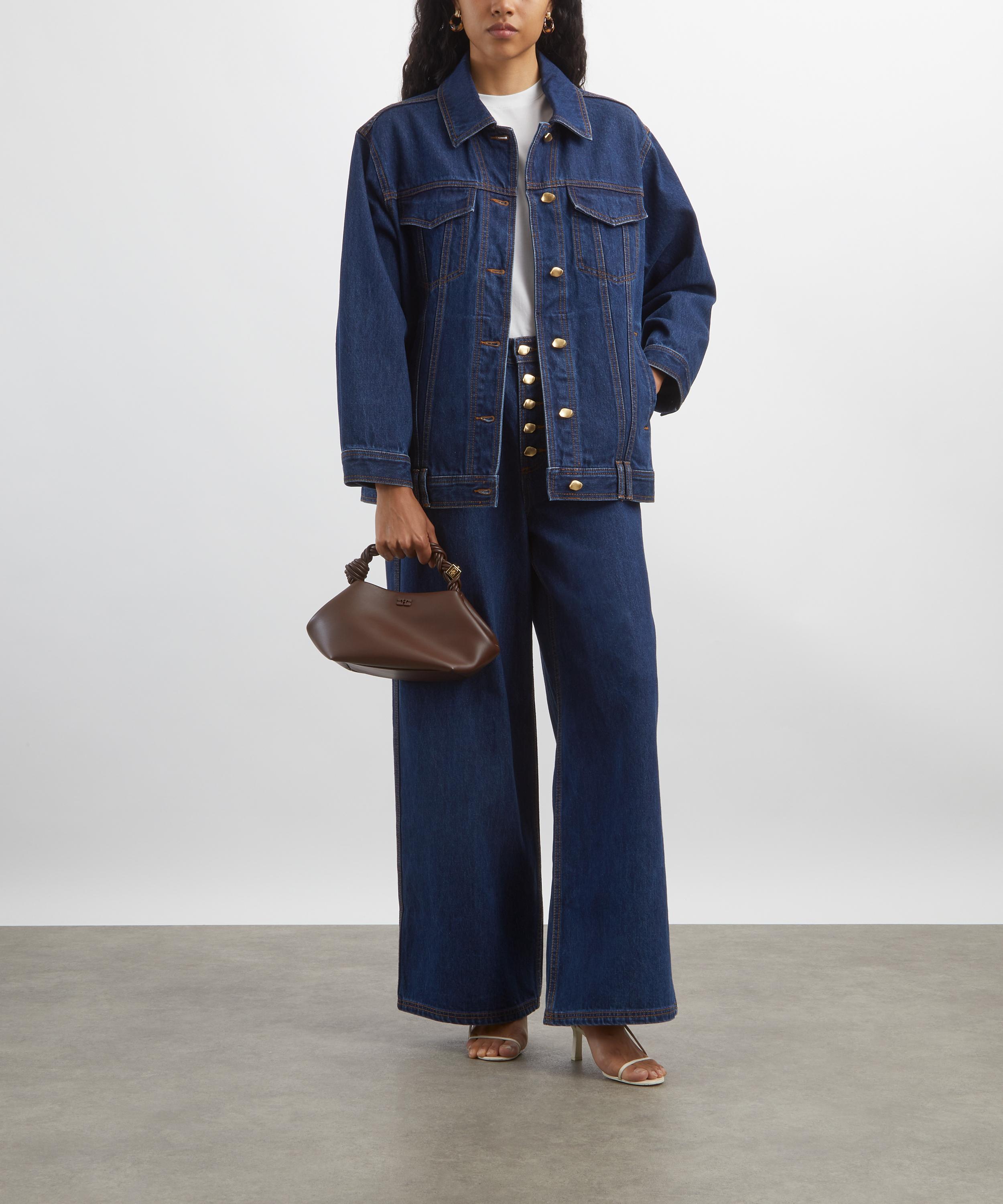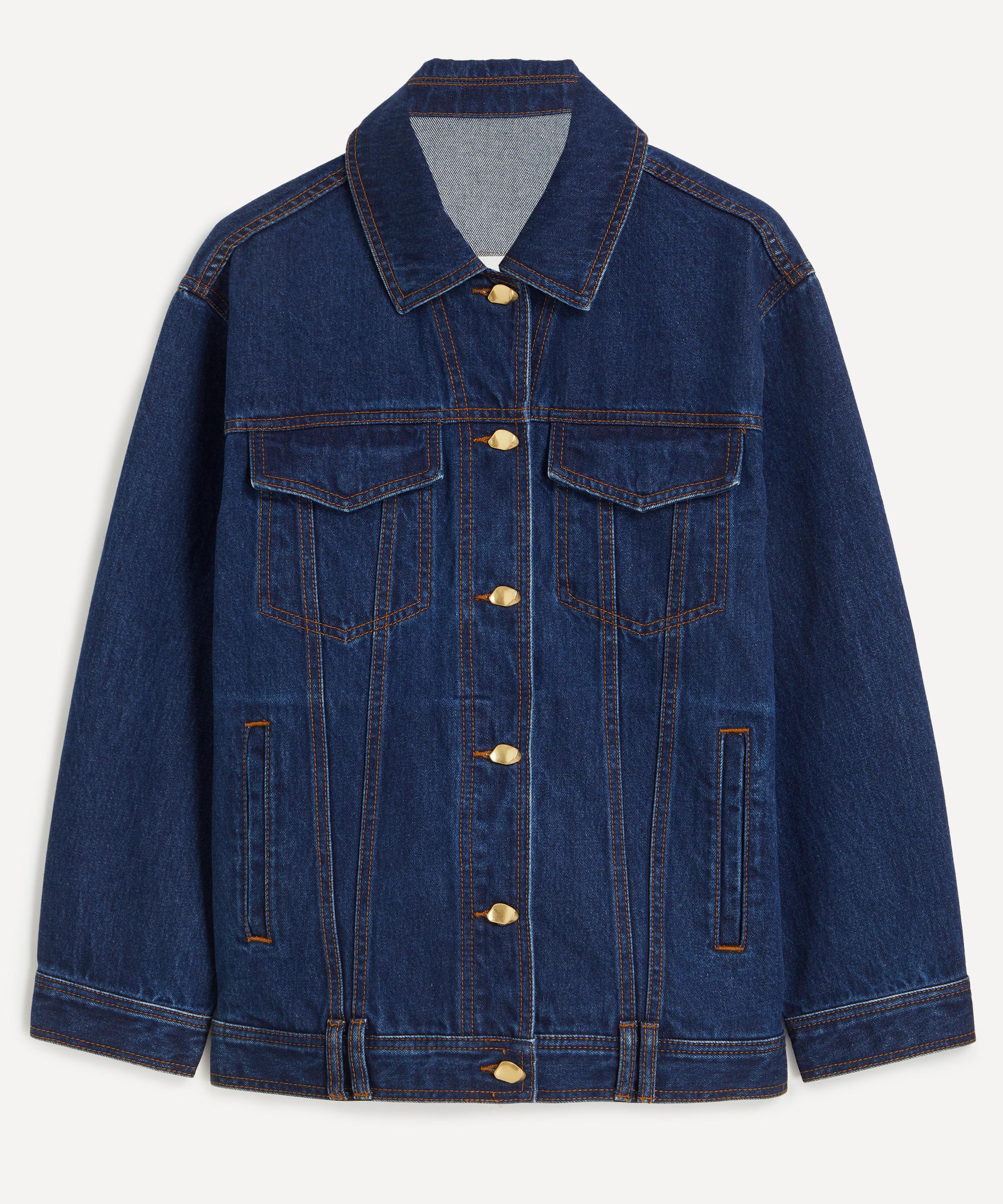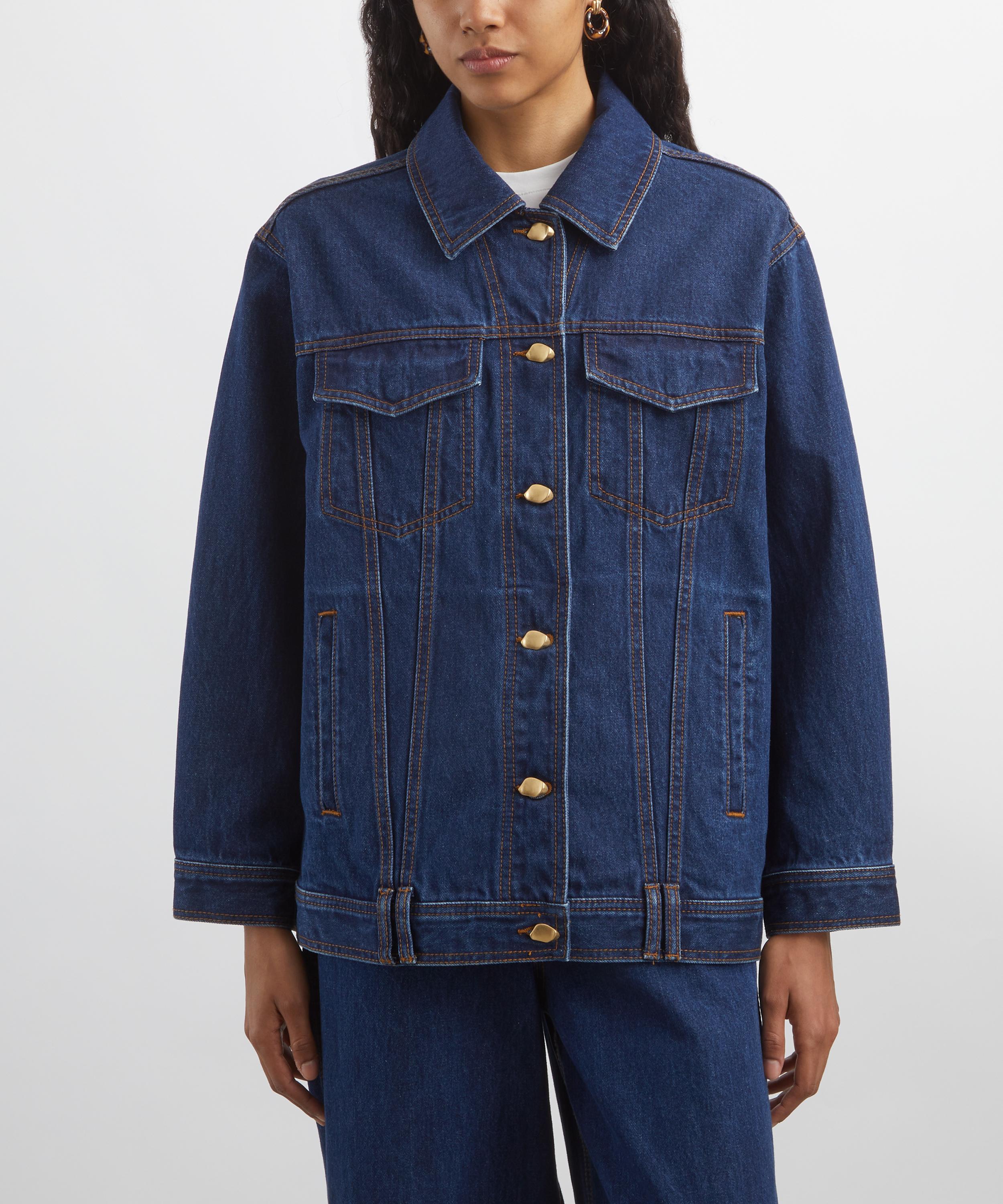 In a deep indigo-blue hue, the Carmen jacket offers a modern, feminine take on the classic denim silhouette with its boxy fit. It’s detailed with gold shell buttons for a refined touch and finished with a signature branded jacron patch at the back.