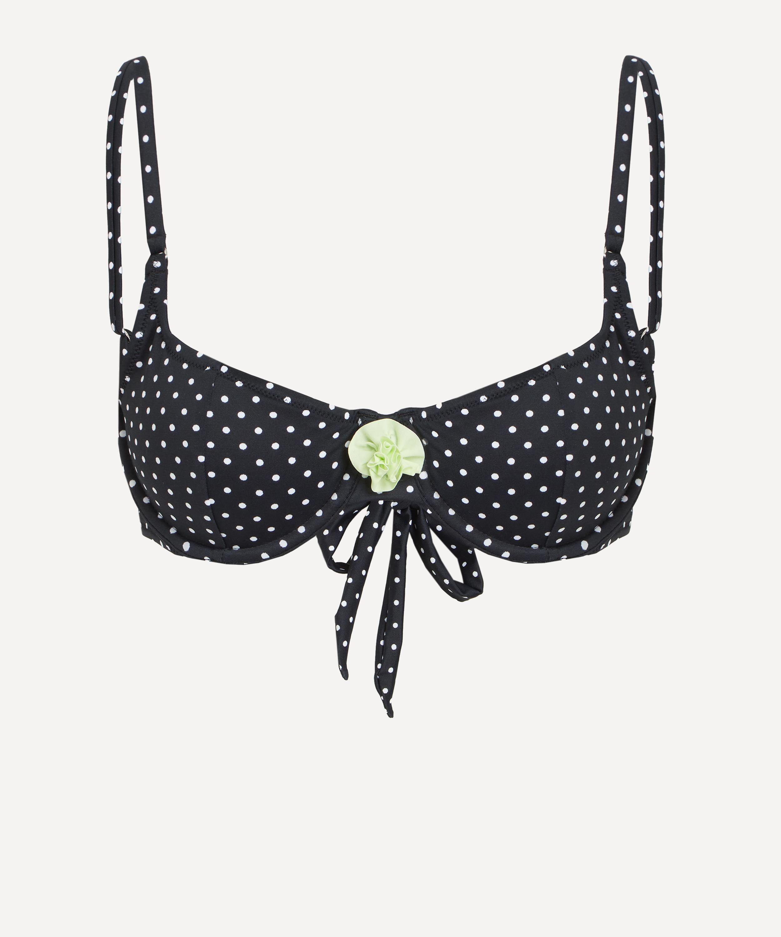 Adorned with a classic micro polka-dot print, the Carmen Bikini Top features an underwired design and adjustable tie back for a supportive, personalised fit. A lime rosette at the centre adds a playful, romantic touch.