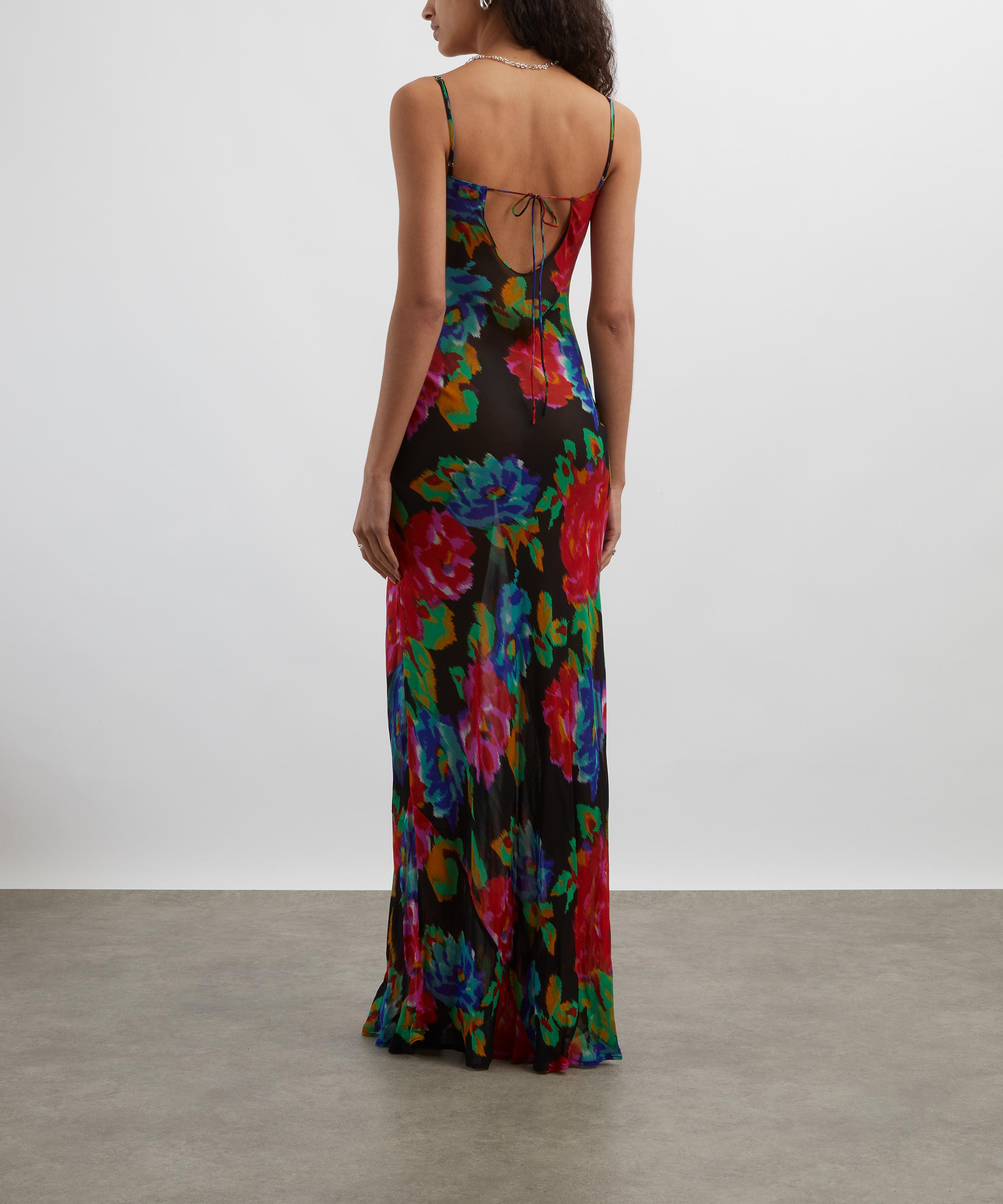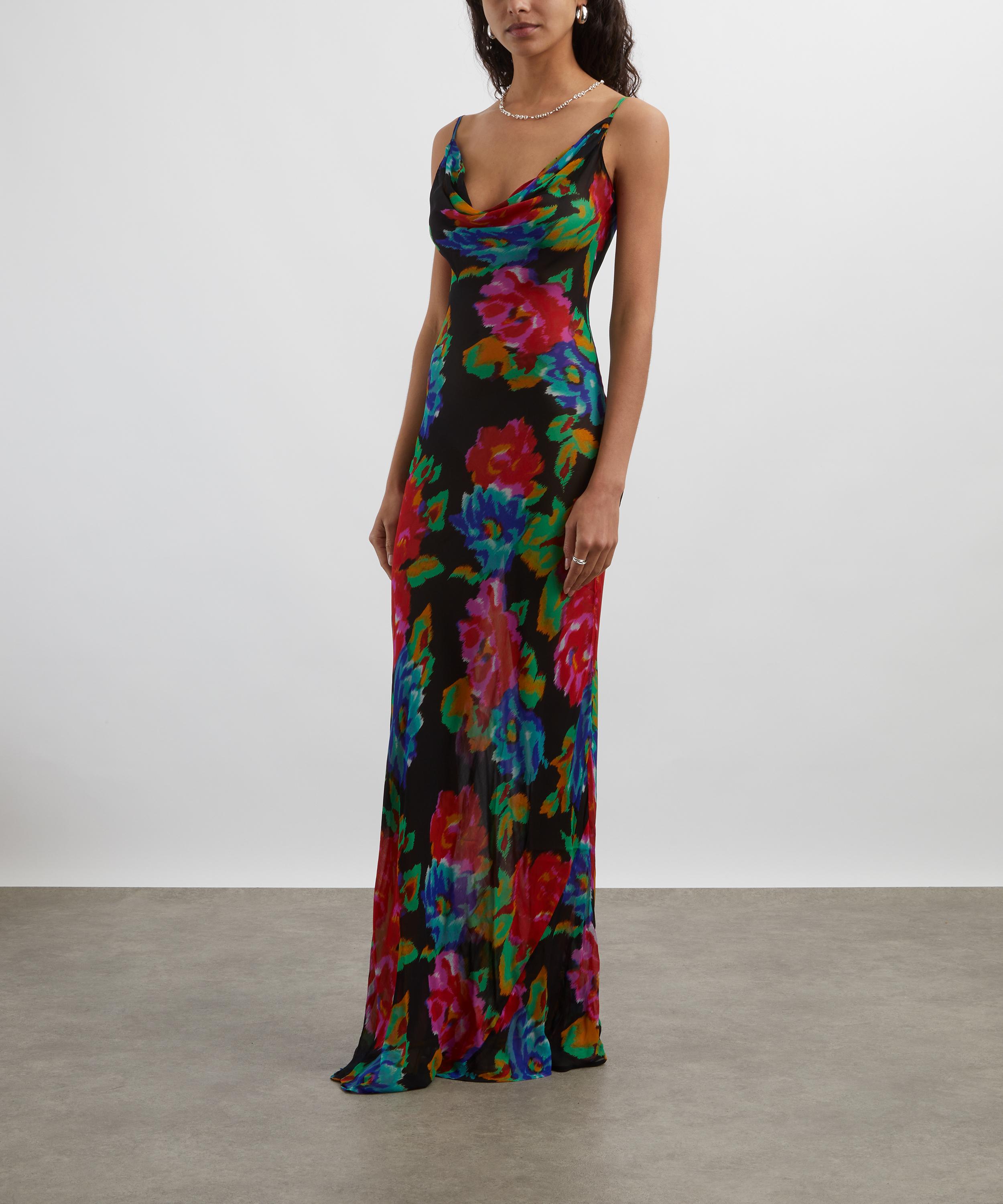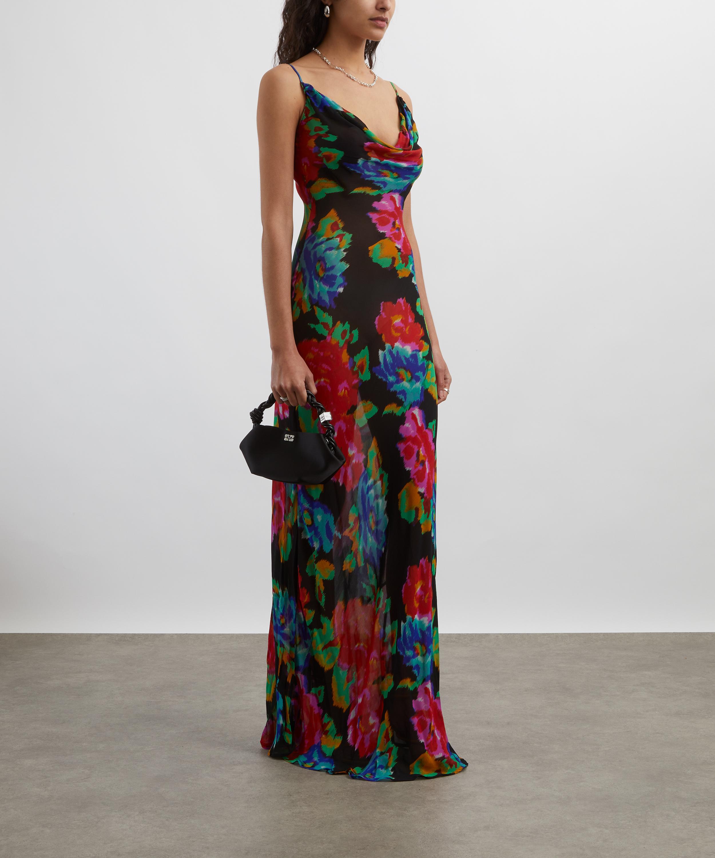 Crafted from semi-sheer viscose georgette and emblazoned with a striking, oversized floral print, this maxi dress exudes sophistication with its figure-skimming bias-cut silhouette, cowl neckline, and open back.