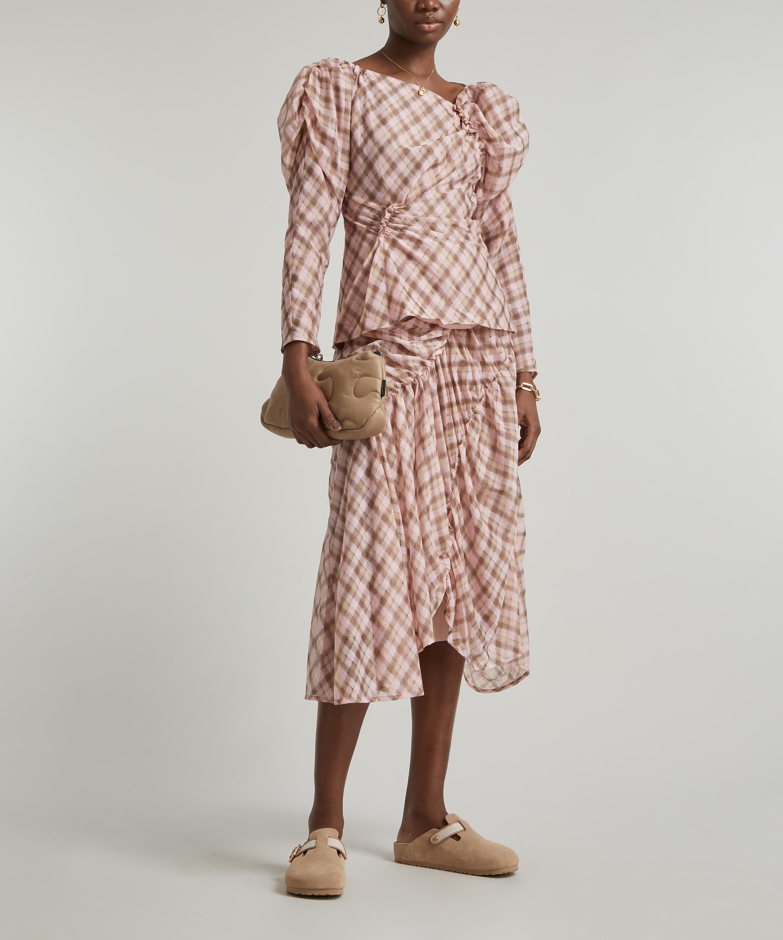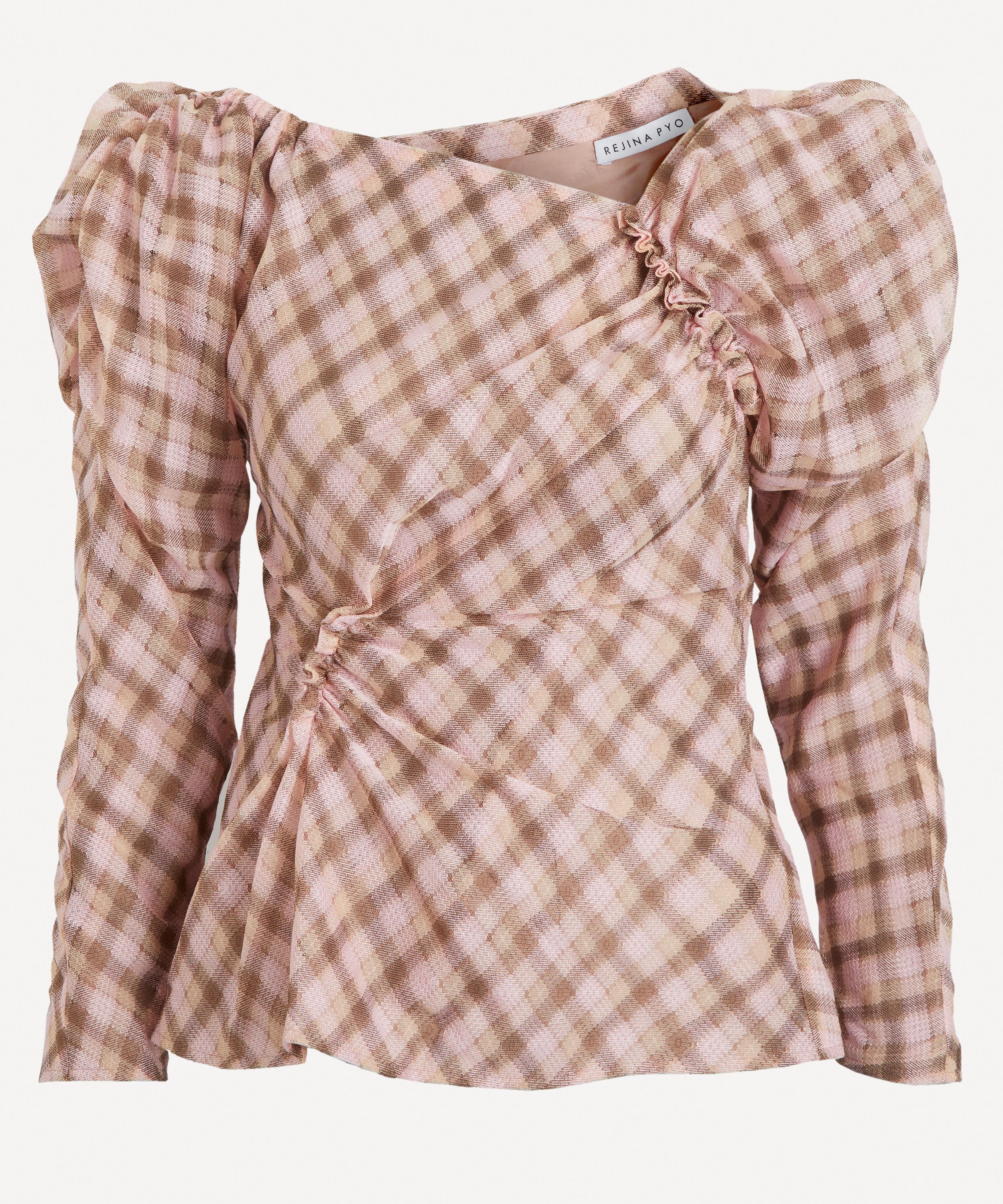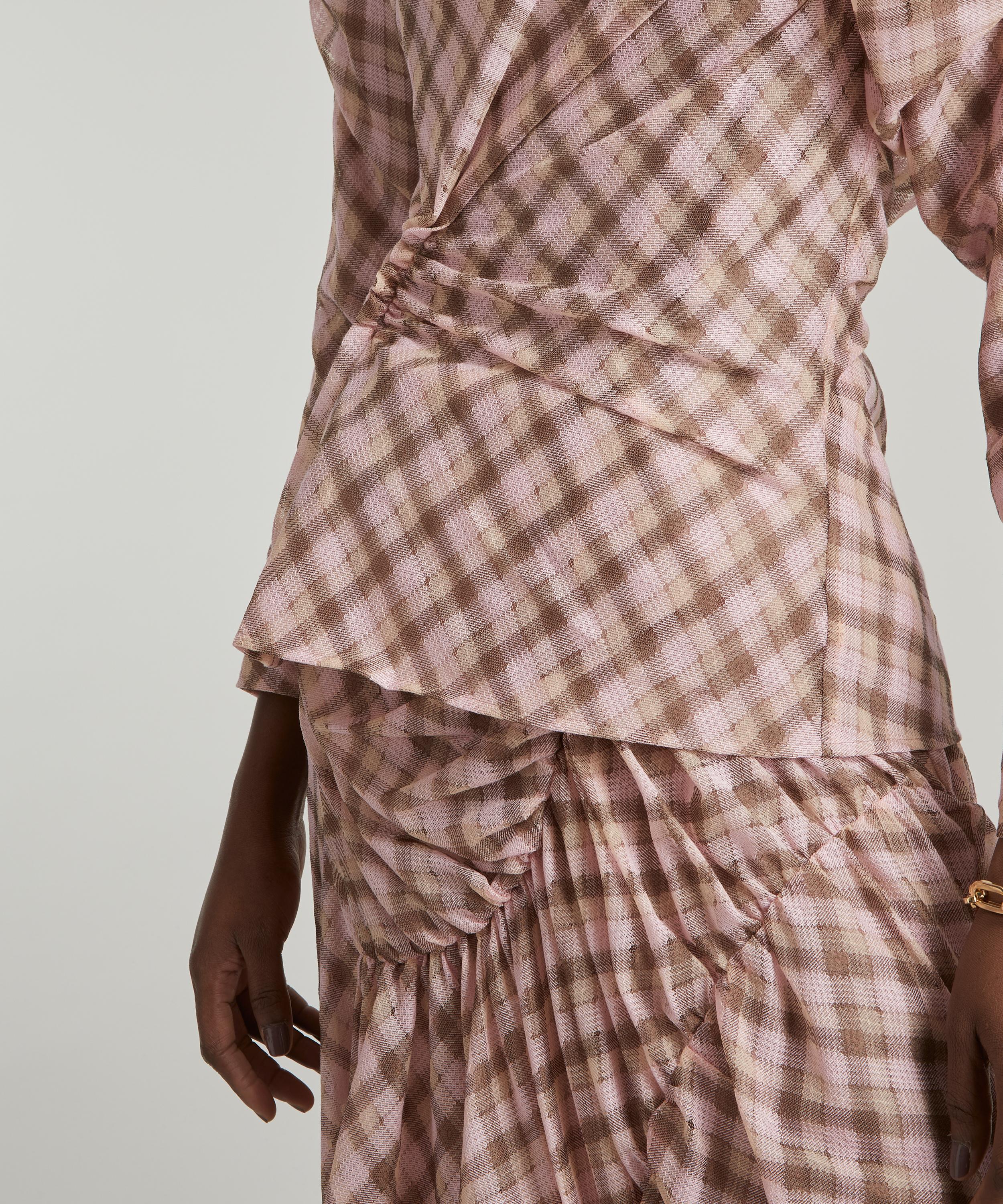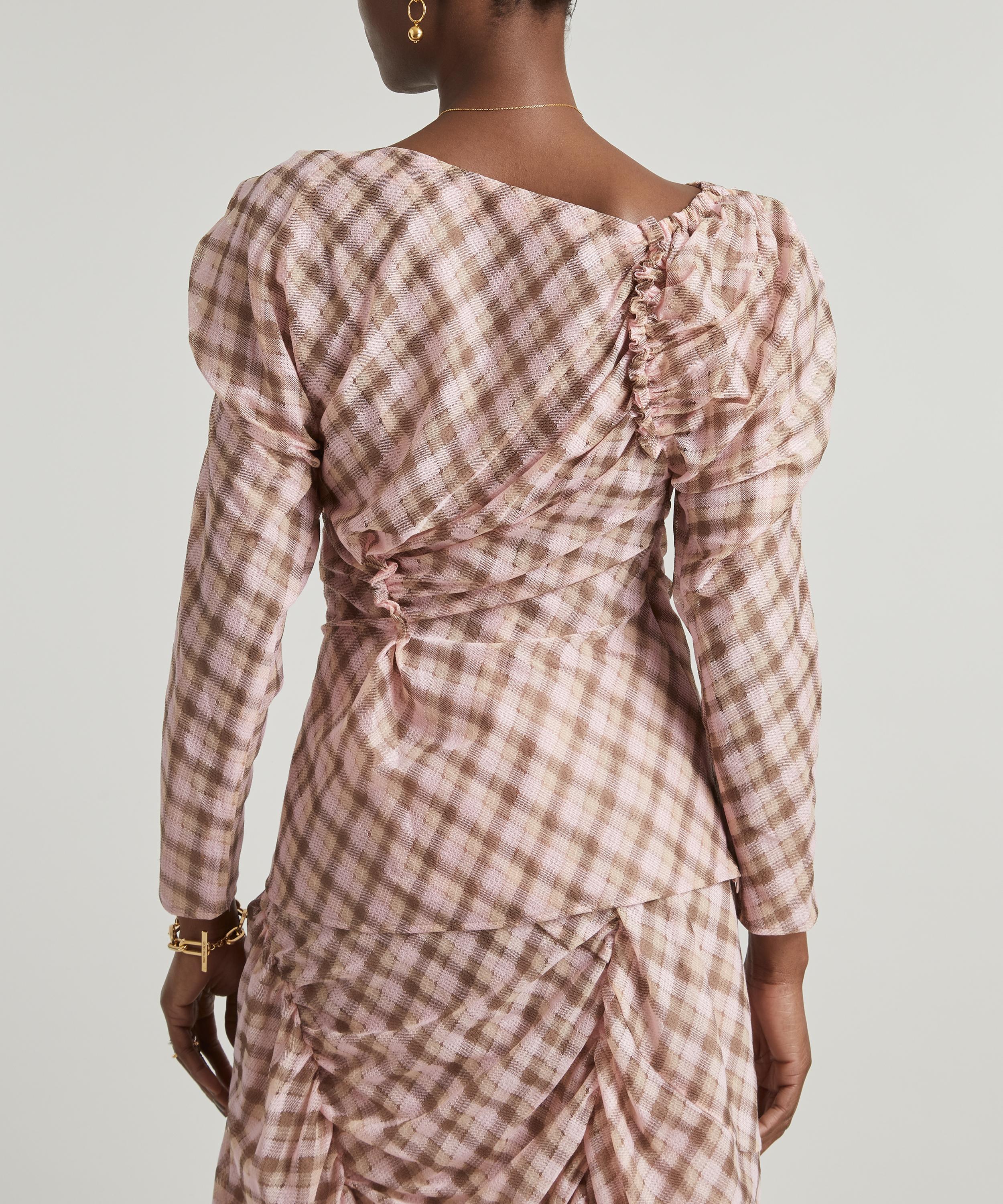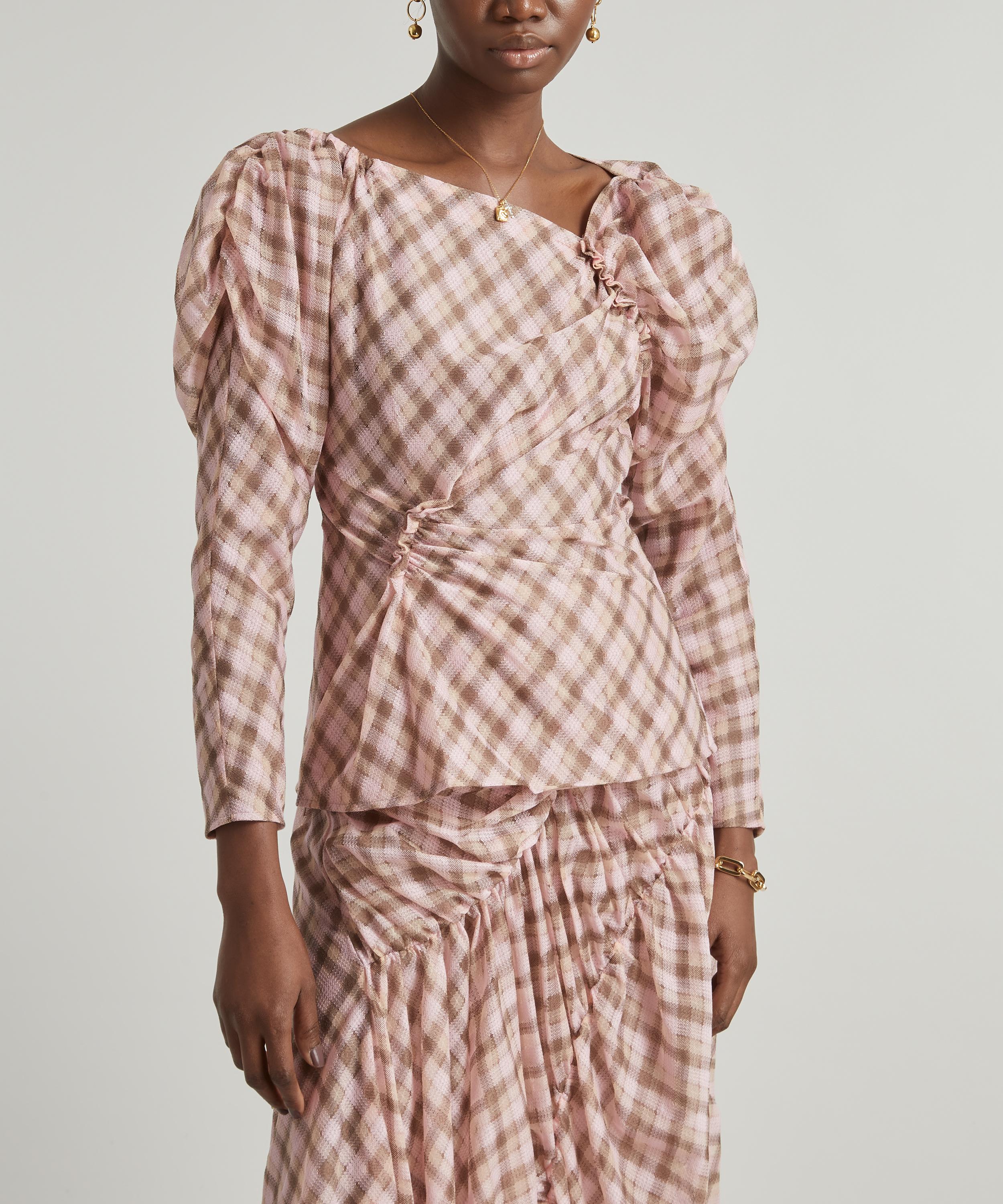 Tailored using a delicate checked mesh, the Cassie blouse is expertly gathered for an asymmetric silhouette. Taking inspiration from the extravagant styles of the ’80s, it features puffed shoulders that form mutton sleeves. Beautifully bold, pair it with the coordinating skirt.