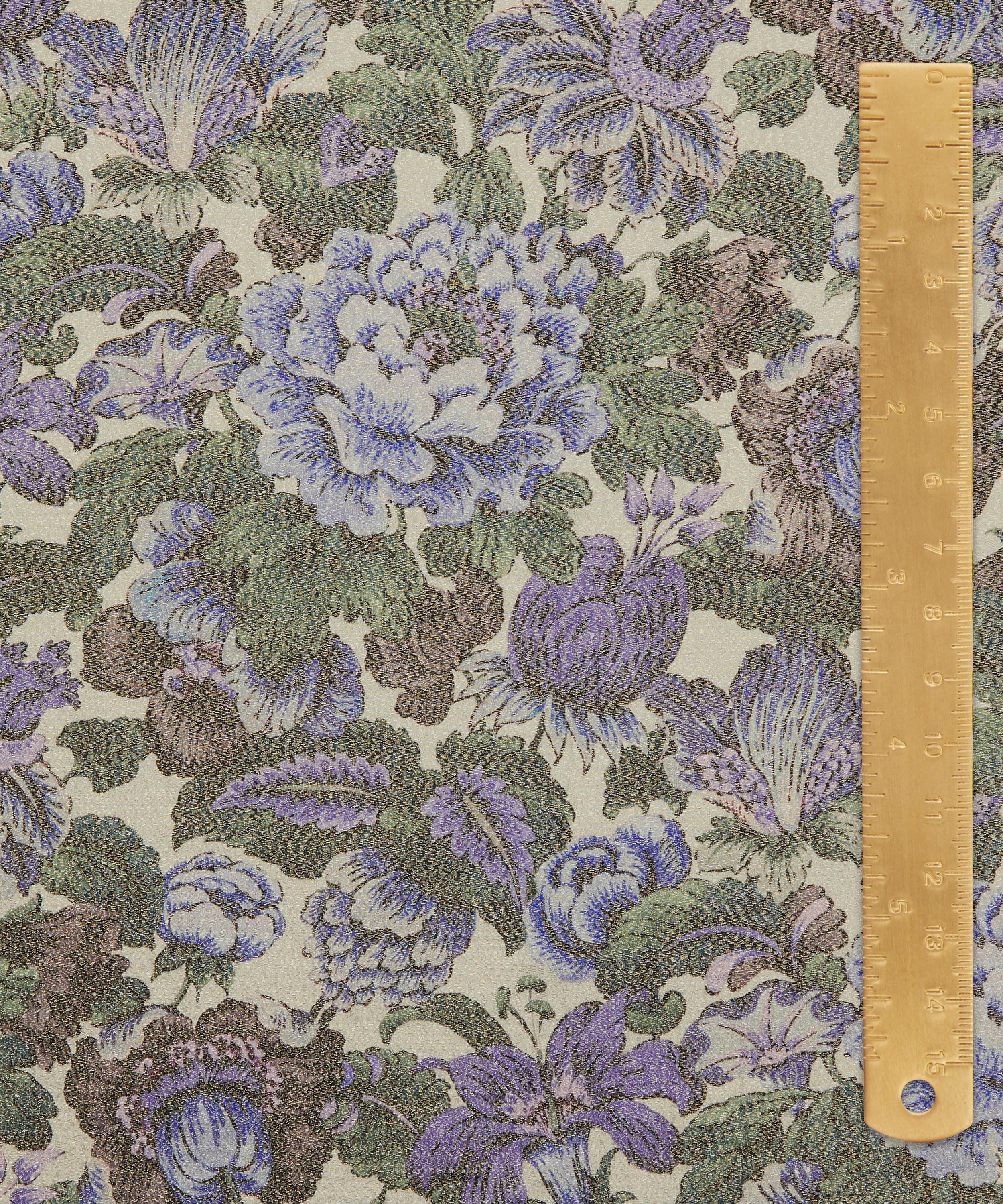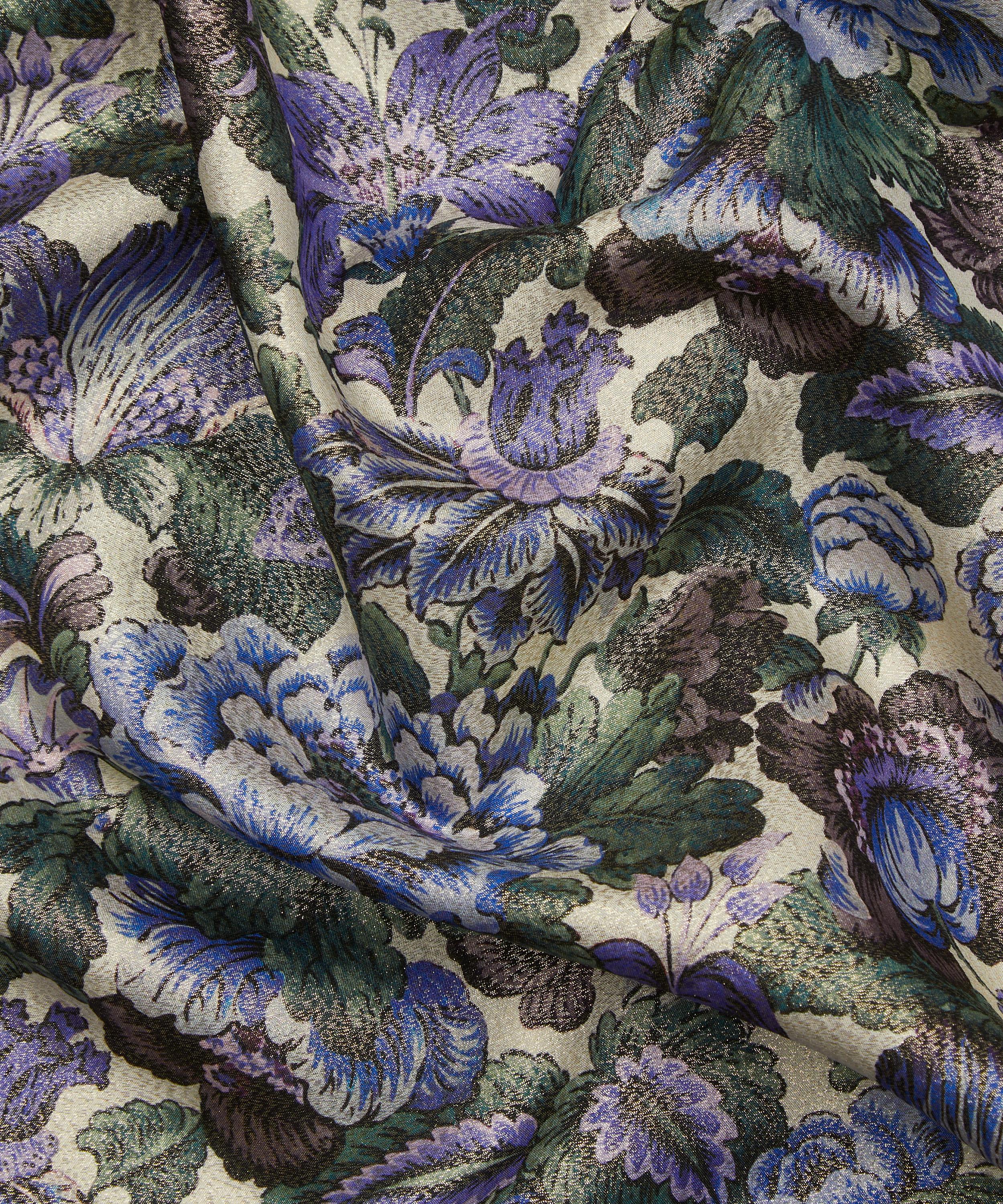 Inspired by a hand-painted artwork discovered in the Liberty archive, this opulent botanical showcases an abundance of magnificently displayed blooms. The unfurling petals of peonies, chrysanthemums and lilies gracefully cascade amidst a tapestry of lush foliage, meticulously weaving together a multisensory visual feast.